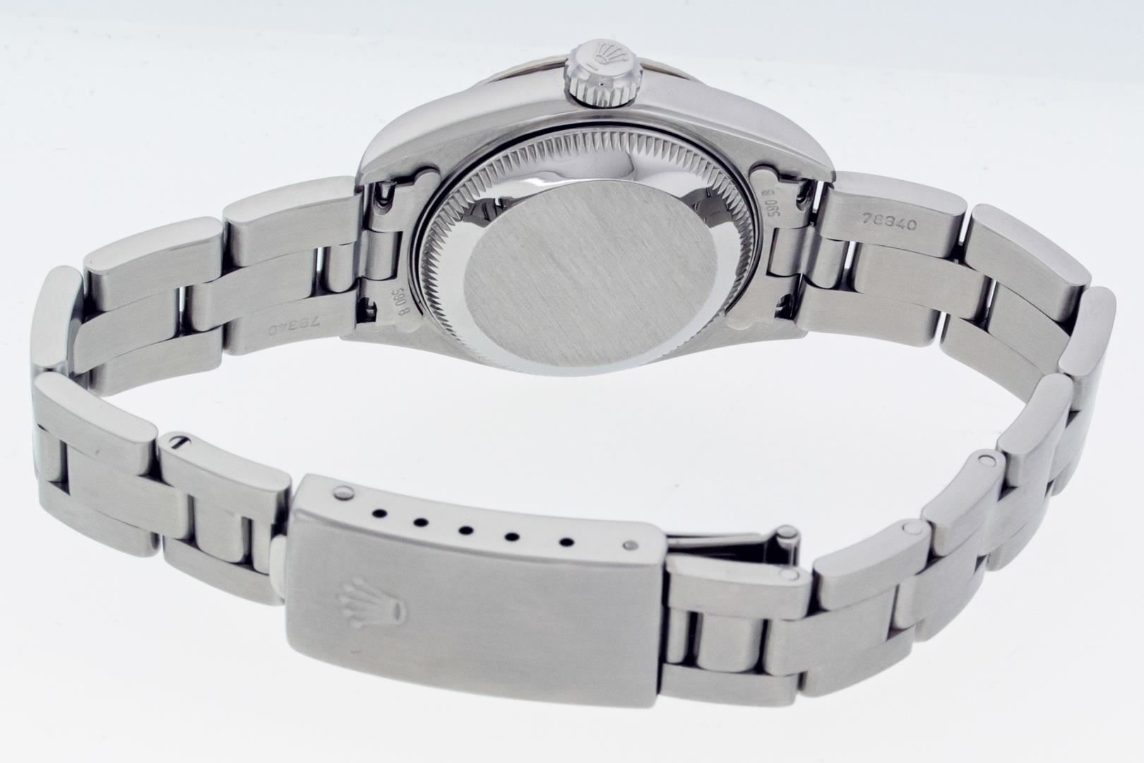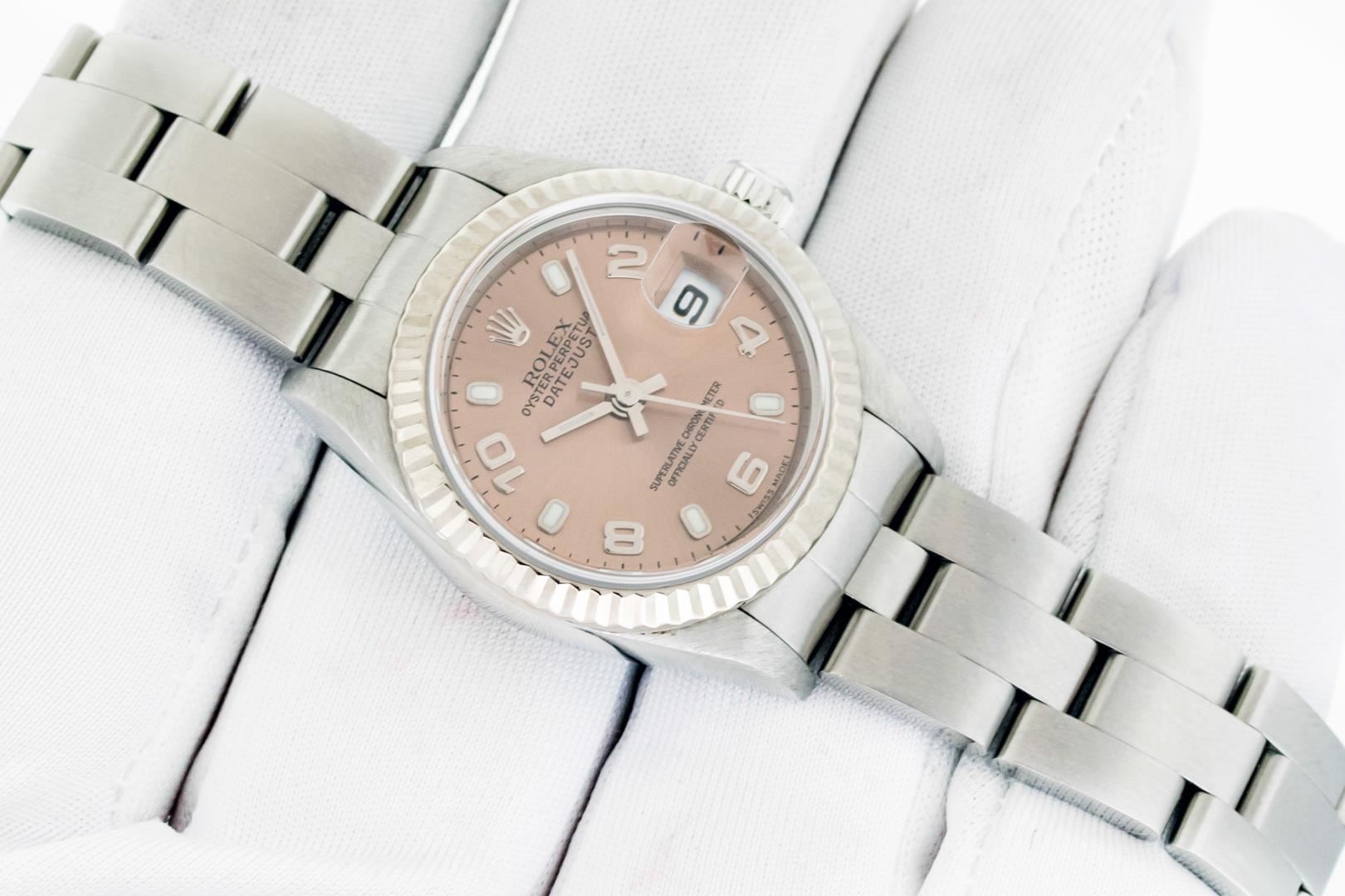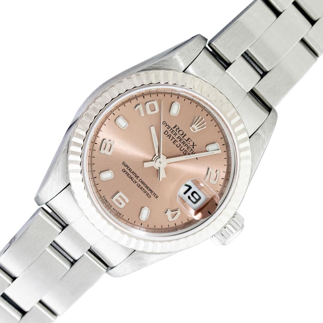 One Ladies Pre Owned Quickset Stainless Steel Rolex Datejust Polished Bright with Satin Finish, Serviced & Electronically Tested, Stainless Steel Case: 26mm, Rolex Stainless Steel Crown, Rolex Bezel: 18K White Gold Fluted Bezel. Crystal: Sapphire With Magnified Date Window. Custom Hands: New Luminescent Hands. Rolex Movement: Automatic Winding Movement 2235. Rolex Dial: Salmon With Arabic Hour Markers & Dash Track. Date Window: 3 O'Clock Position Date Display, Model: Quickset Datejust. Condition: G-6 Extra Fine. Rolex Bracelet: Stainless Steel Oyster Band. Bright Polish & Satin Finish. 6.0 Inch Length, Adjustable. Standard Clasp, With Rolex Logo. This Watch Has Been Serviced Time Tested And Is In Excellent Condition It Is Free Of All Scratches And Dents.