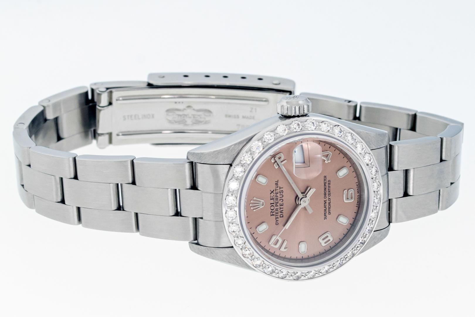 One Ladies Pre Owned Quickset Stainless Steel Rolex Datejust Polished Bright with Satin Finish, Serviced & Electronically Tested, Stainless Steel Case: 26mm, Rolex Stainless Steel Crown, Custom Bezel: New 18K White Gold Bead Set Diamond Bezel, Diamond Count: 32 Diamonds, Clarity: SI-VS, Color: G to H. Custom Crystal: New Sapphire With Magnified Date Window. Custom Hands: New Luminescent Hands. Rolex Movement: Automatic Winding Movement 2235. Rolex Dial: Salmon With Arabic Hour Markers & Dash Track. Date Window: 3 O'Clock Position Date Display, Model: Datejust. Condition: G-6 Extra Fine. Rolex Bracelet: Stainless Steel Oyster Band. Bright Polish & Satin Finish. 6.0 Inch Length, Adjustable. Standard Clasp, With Rolex Logo. This Watch Has Been Serviced Time Tested And Is In Excellent Condition It Is Free Of All Scratches And Dents.