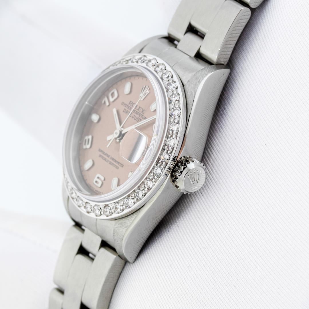 One Ladies Pre Owned Quickset Stainless Steel Rolex Datejust Polished Bright with Satin Finish, Serviced & Electronically Tested, Stainless Steel Case: 26mm, Rolex Stainless Steel Crown, Custom Bezel: New 18K White Gold Bead Set Diamond Bezel, Diamond Count: 32 Diamonds, Clarity: SI-VS, Color: G to H. Custom Crystal: New Sapphire With Magnified Date Window. Custom Hands: New Luminescent Hands. Rolex Movement: Automatic Winding Movement 2235. Rolex Dial: Salmon With Arabic Hour Markers & Dash Track. Date Window: 3 O'Clock Position Date Display, Model: Datejust. Condition: G-6 Extra Fine. Rolex Bracelet: Stainless Steel Oyster Band. Bright Polish & Satin Finish. 6.0 Inch Length, Adjustable. Standard Clasp, With Rolex Logo. This Watch Has Been Serviced Time Tested And Is In Excellent Condition It Is Free Of All Scratches And Dents.