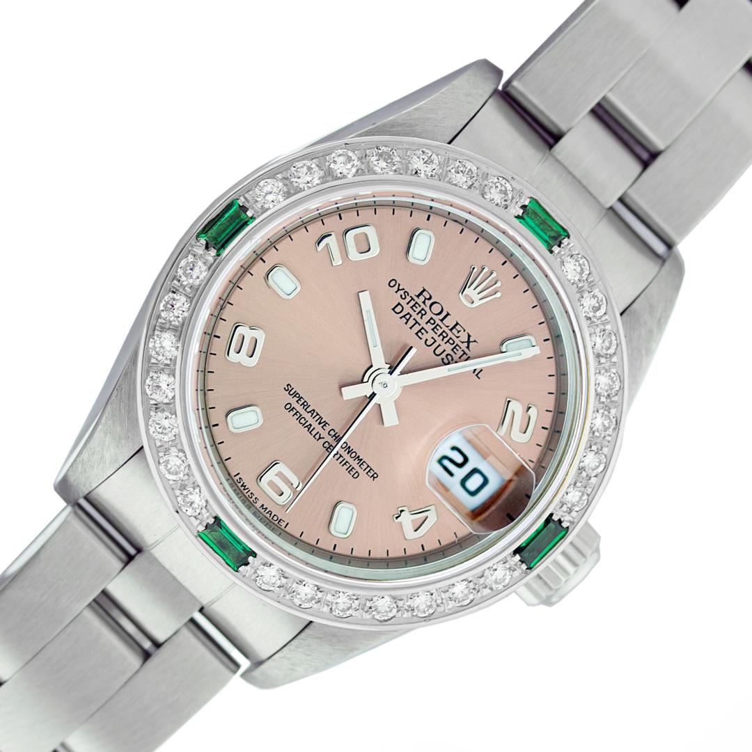One Ladies Pre Owned Stainless Steel Rolex Datejust Polished Bright with Satin Finish, Serviced & Electronically Tested, Stainless Steel Case: 26mm, Rolex Stainless Steel Crown, Custom Bezel: New 18K White Gold Emerald Bead Set Diamond Bezel, Diamond + Gem Count: 28 Diamonds + 4 Emeralds, Clarity: SI-VS, Color: G to H. Custom Crystal: New Sapphire With Magnified Date Window. Custom Hands: New Luminescent Hands. Rolex Movement: Automatic Winding Movement 2235. Rolex Dial: Salmon With Arabic Hour Markers & Dash Track. Date Window: 3 O'Clock Position Date Display, Model: Quickset Datejust. Condition: G-6 Extra Fine. Rolex Bracelet: Stainless Steel Oyster Band. Bright Polish & Satin Finish. 6.0 Inch Length, Adjustable. Standard Clasp, With Rolex Logo. This Watch Has Been Serviced Time Tested And Is In Excellent Condition It Is Free Of All Scratches And Dents.