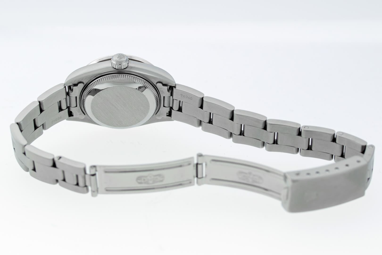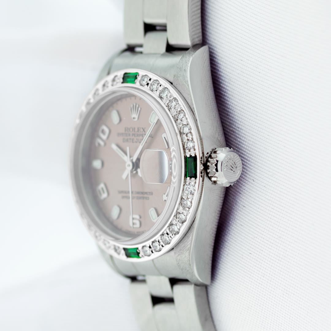 One Ladies Pre Owned Stainless Steel Rolex Datejust Polished Bright with Satin Finish, Serviced & Electronically Tested, Stainless Steel Case: 26mm, Rolex Stainless Steel Crown, Custom Bezel: New 18K White Gold Emerald Bead Set Diamond Bezel, Diamond + Gem Count: 28 Diamonds + 4 Emeralds, Clarity: SI-VS, Color: G to H. Custom Crystal: New Sapphire With Magnified Date Window. Custom Hands: New Luminescent Hands. Rolex Movement: Automatic Winding Movement 2235. Rolex Dial: Salmon With Arabic Hour Markers & Dash Track. Date Window: 3 O'Clock Position Date Display, Model: Quickset Datejust. Condition: G-6 Extra Fine. Rolex Bracelet: Stainless Steel Oyster Band. Bright Polish & Satin Finish. 6.0 Inch Length, Adjustable. Standard Clasp, With Rolex Logo. This Watch Has Been Serviced Time Tested And Is In Excellent Condition It Is Free Of All Scratches And Dents.