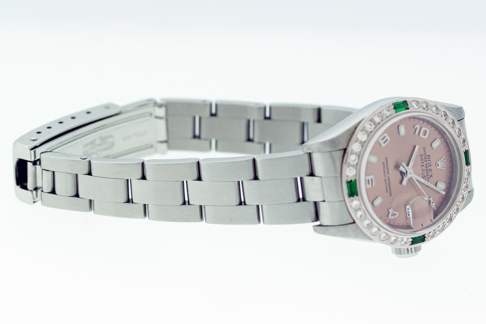 One Ladies Pre Owned Stainless Steel Rolex Datejust Polished Bright with Satin Finish, Serviced & Electronically Tested, Stainless Steel Case: 26mm, Rolex Stainless Steel Crown, Custom Bezel: New 18K White Gold Emerald Bead Set Diamond Bezel, Diamond + Gem Count: 28 Diamonds + 4 Emeralds, Clarity: SI-VS, Color: G to H. Custom Crystal: New Sapphire With Magnified Date Window. Custom Hands: New Luminescent Hands. Rolex Movement: Automatic Winding Movement 2235. Rolex Dial: Salmon With Arabic Hour Markers & Dash Track. Date Window: 3 O'Clock Position Date Display, Model: Quickset Datejust. Condition: G-6 Extra Fine. Rolex Bracelet: Stainless Steel Oyster Band. Bright Polish & Satin Finish. 6.0 Inch Length, Adjustable. Standard Clasp, With Rolex Logo. This Watch Has Been Serviced Time Tested And Is In Excellent Condition It Is Free Of All Scratches And Dents.