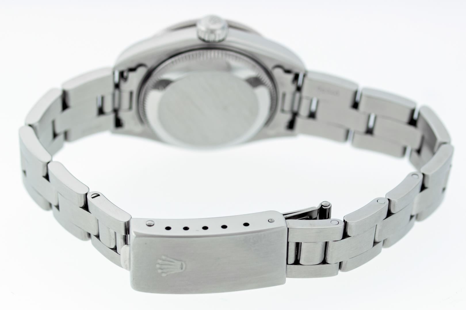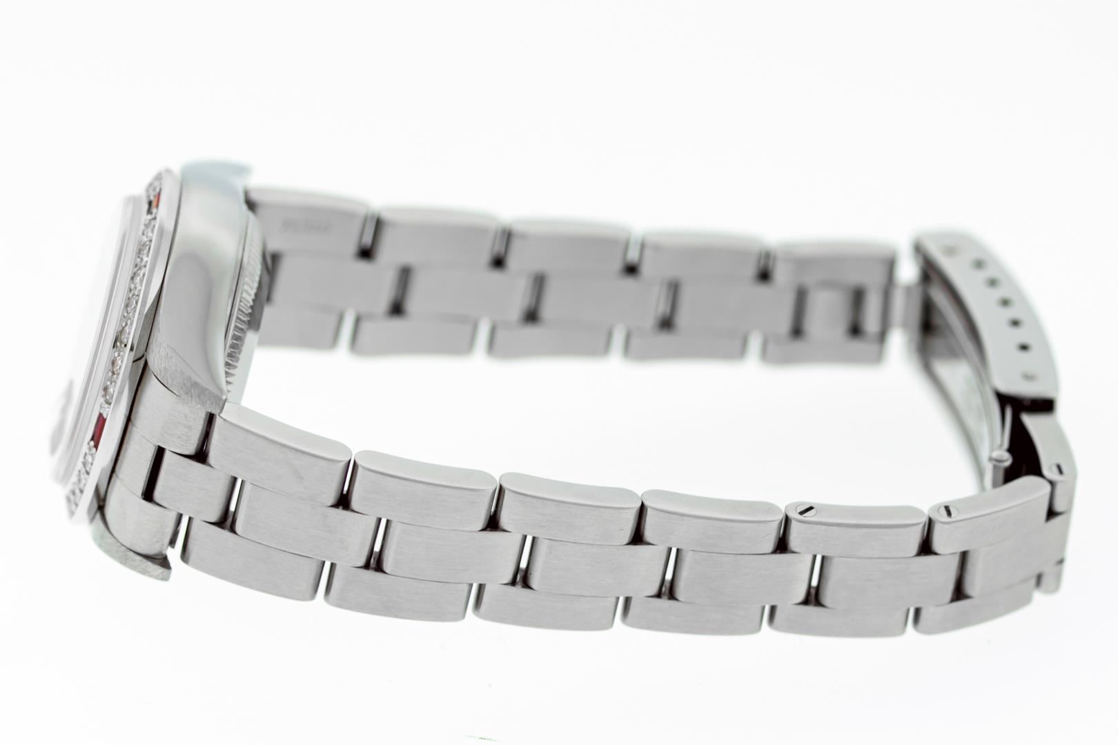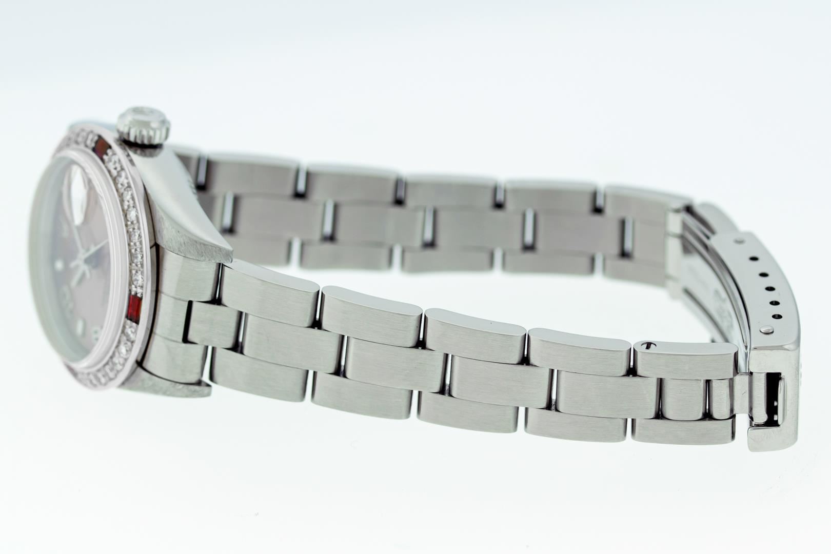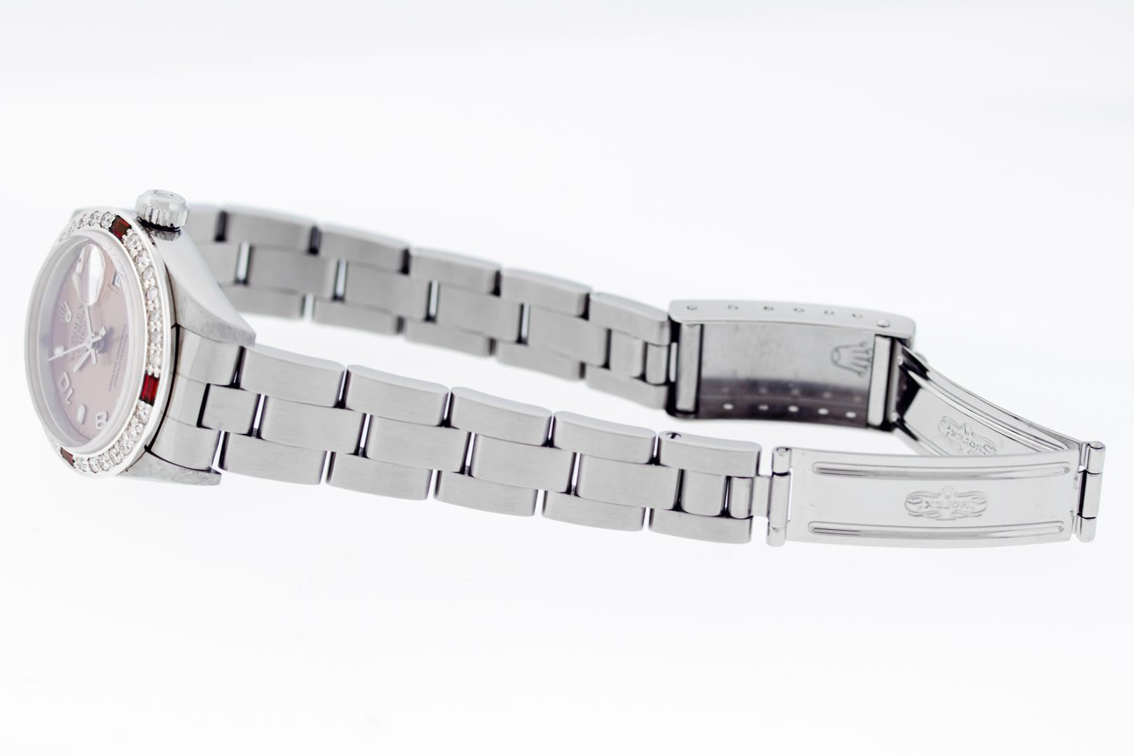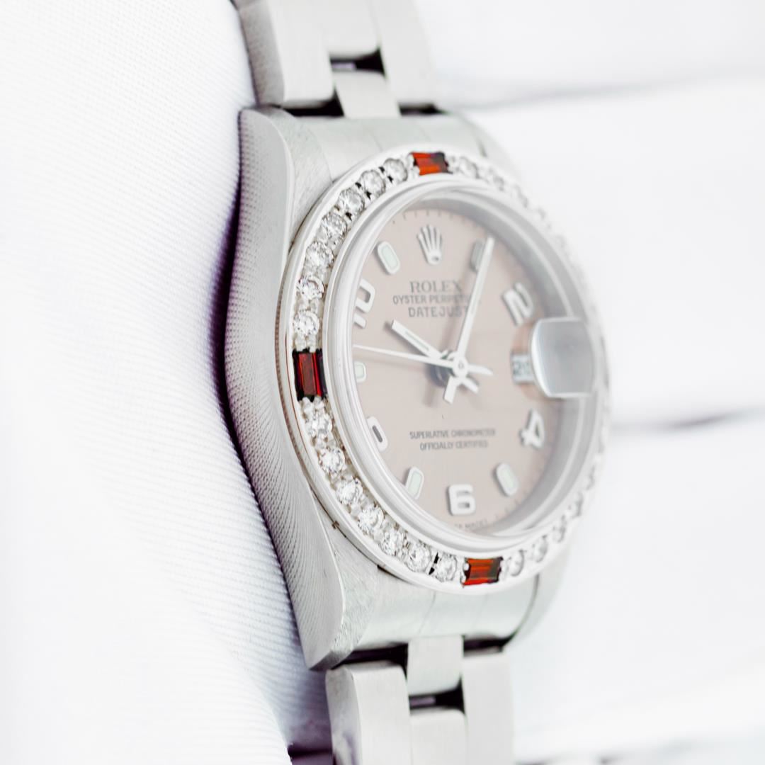 One Ladies Pre Owned Stainless Steel Rolex Datejust Polished Bright with Satin Finish, Serviced & Electronically Tested, Stainless Steel Case: 26mm, Rolex Stainless Steel Crown, Custom Bezel: New 18K White Gold Ruby Bead Set Diamond Bezel, Diamond + Gem Count: 28 Diamonds + 4 Rubies, Clarity: SI-VS, Color: G to H. Custom Crystal: New Sapphire With Magnified Date Window. Custom Hands: New Luminescent Hands. Rolex Movement: Automatic Winding Movement 2235. Rolex Dial: Salmon With Arabic Hour Markers & Dash Track. Date Window: 3 O'Clock Position Date Display, Model: Quickset Datejust. Condition: G-6 Extra Fine. Rolex Bracelet: Stainless Steel Oyster Band. Bright Polish & Satin Finish. 6.0 Inch Length, Adjustable. Standard Clasp, With Rolex Logo. This Watch Has Been Serviced Time Tested And Is In Excellent Condition It Is Free Of All Scratches And Dents.