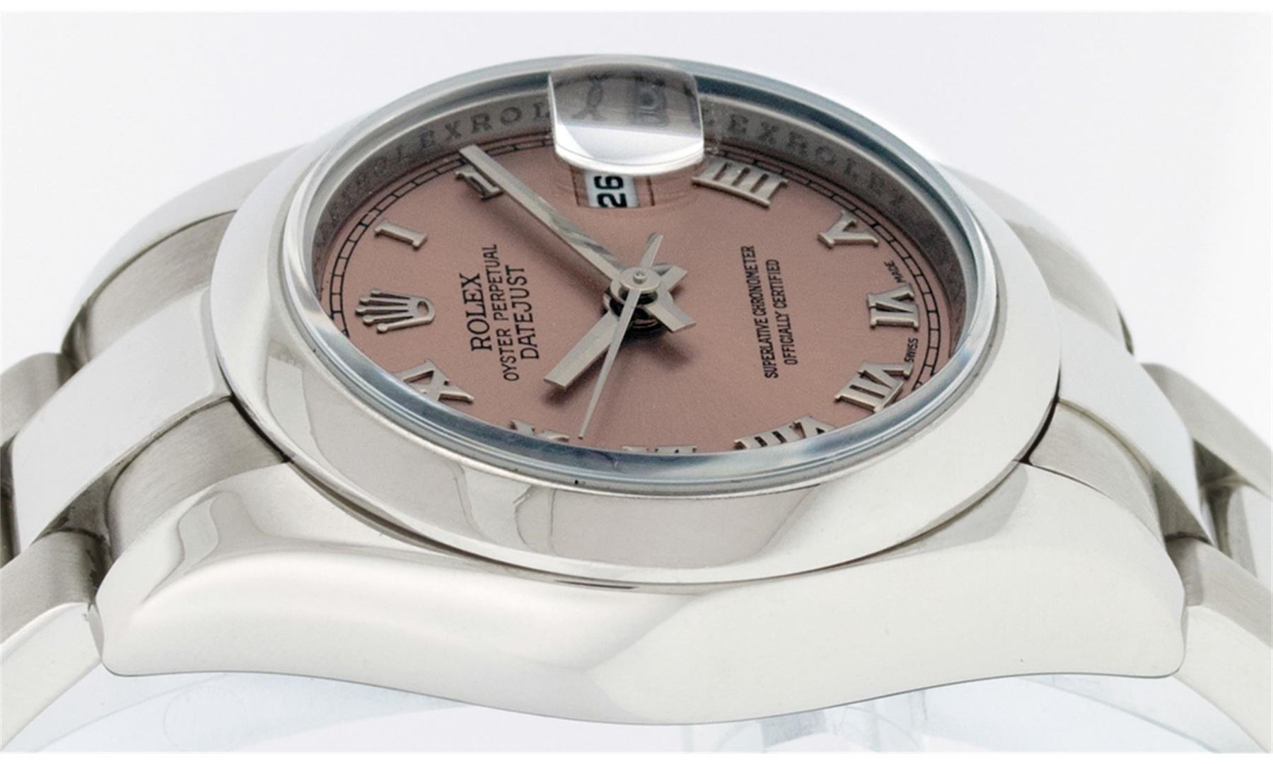 One New Style Ladies Pre Owned Quickset Stainless Steel Rolex Datejust Polished Bright with Satin Finish, Serviced & Electronically Tested, Rolex Stainless Steel Case: 26mm, Rolex Stainless Steel Crown, Rolex Bezel: Stainless Steel Smooth Bezel. Rolex Crystal: Scratch Resistant Sapphire Cyclops Lens. Hands: Luminescent Hands. Rolex Movement: Automatic Winding Movement. Rolex Dial: Salmon Roman Dial With Square Track, Color: G to H, Clarity: VS. Date Window: 3 O'Clock Position Date Display, Model: 179160 Quickset Datejust. Condition: G-6 Extra Fine. Rolex Bracelet: Stainless Steel Oyster Band. Bright Polish & Satin Finish. 6.0 Inch Length, Adjustable. Standard Clasp, With Rolex Logo. This Watch Has Been Serviced Time Tested And Is In Excellent Condition It Is Free Of All Scratches And Dents.