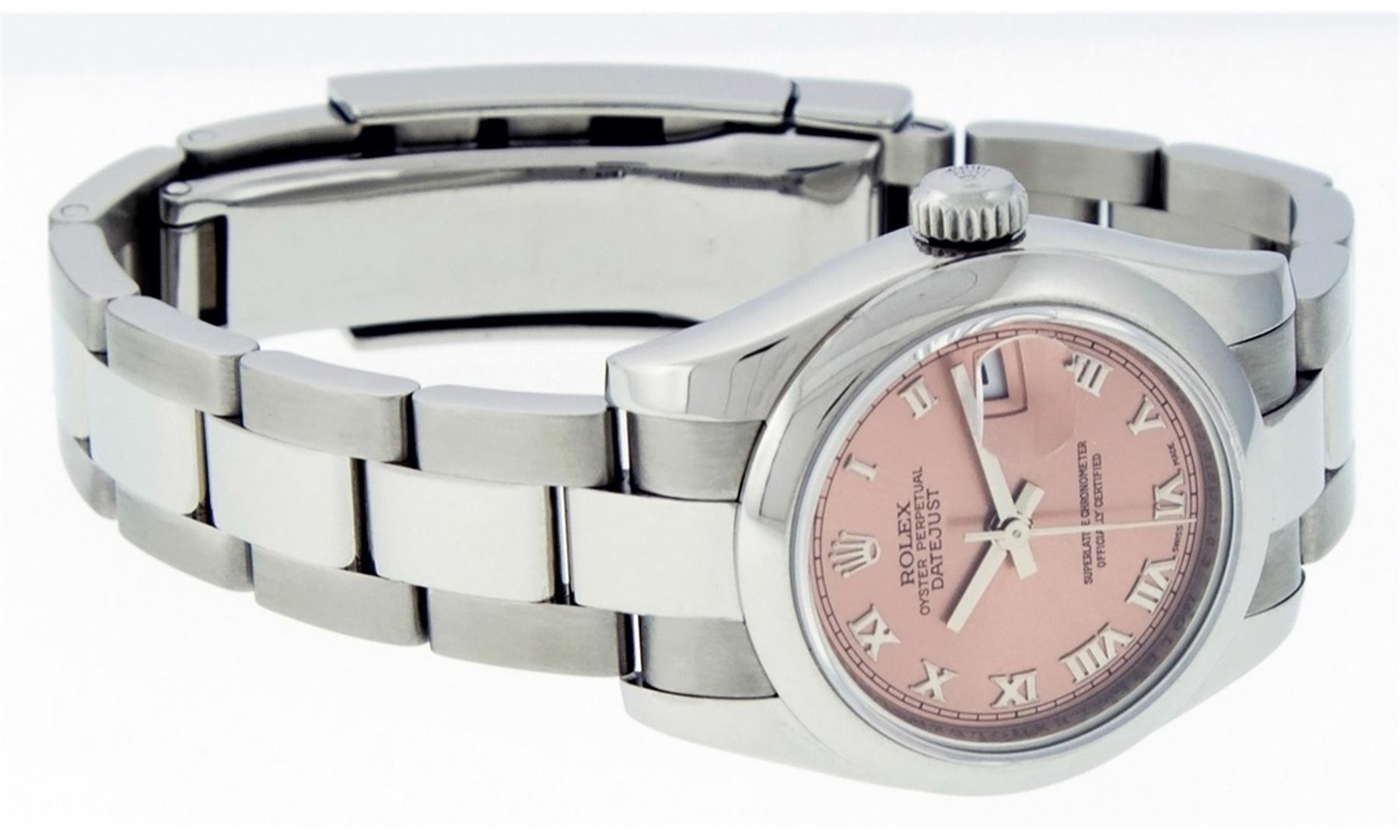 One New Style Ladies Pre Owned Quickset Stainless Steel Rolex Datejust Polished Bright with Satin Finish, Serviced & Electronically Tested, Rolex Stainless Steel Case: 26mm, Rolex Stainless Steel Crown, Rolex Bezel: Stainless Steel Smooth Bezel. Rolex Crystal: Scratch Resistant Sapphire Cyclops Lens. Hands: Luminescent Hands. Rolex Movement: Automatic Winding Movement. Rolex Dial: Salmon Roman Dial With Square Track, Color: G to H, Clarity: VS. Date Window: 3 O'Clock Position Date Display, Model: 179160 Quickset Datejust. Condition: G-6 Extra Fine. Rolex Bracelet: Stainless Steel Oyster Band. Bright Polish & Satin Finish. 6.0 Inch Length, Adjustable. Standard Clasp, With Rolex Logo. This Watch Has Been Serviced Time Tested And Is In Excellent Condition It Is Free Of All Scratches And Dents.