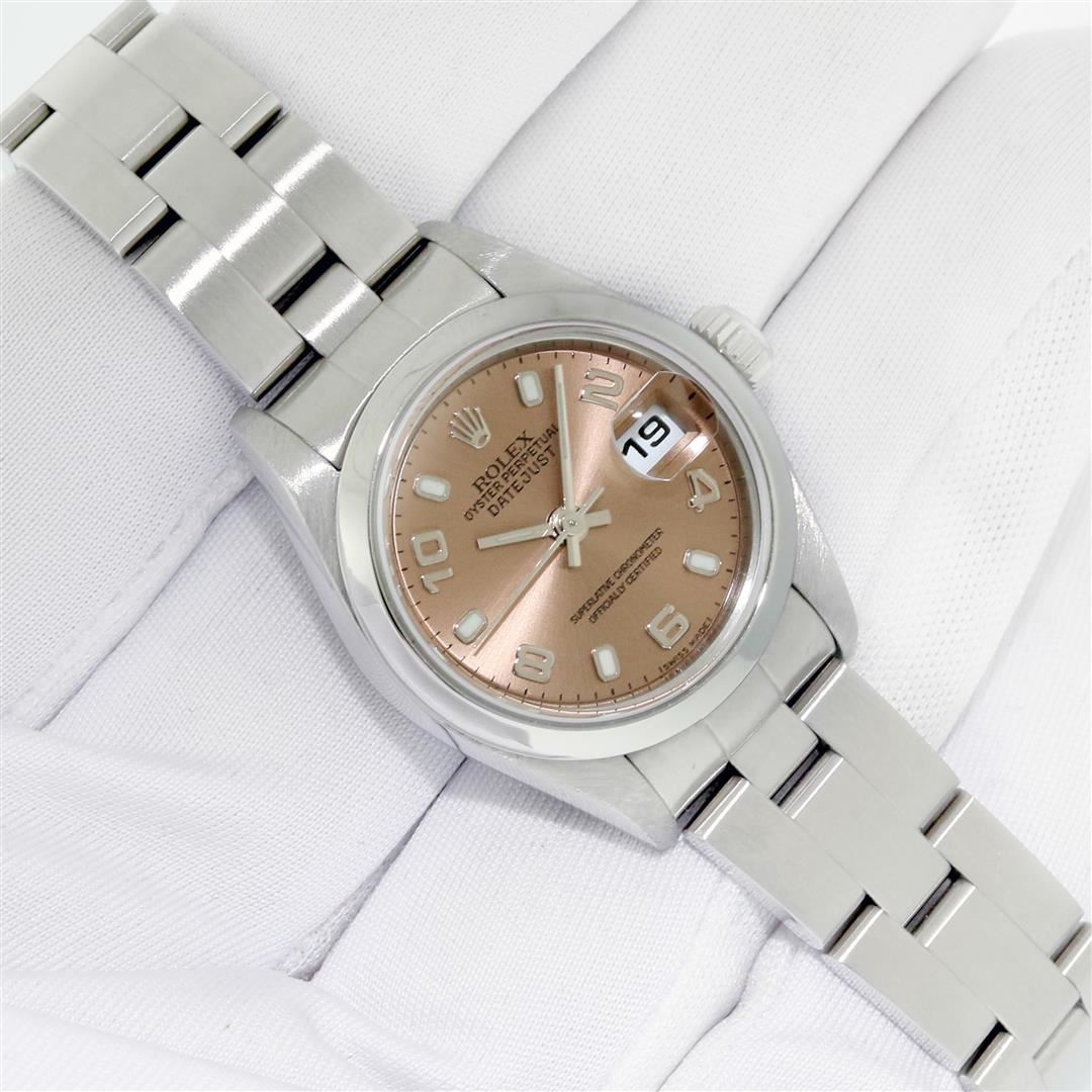 One Quickset Pre Owned Ladies Stainless Steel Rolex Datejust Polished Bright with Satin Finish, Serviced & Electronically Tested, Rolex Stainless Steel Case: 26mm, Rolex Stainless Steel Crown, Rolex Bezel: Stainless Steel Smooth Bezel Bezel, Custom Crystal: New Sapphire With Date Window. Custom Hands: New Luminescent Hands. Rolex Movement: Automatic Winding Movement. Rolex Dial: Salmon Roman, Date Window: 3 O'Clock Position Date Display, Model: Quickset 2230 Datejust. Condition: G-6 Extra Fine. Rolex Bracelet: Stainless Steel Oyster Band. Bright Polish & Satin Finish. 6.0 Inch Length, Adjustable. Standard Clasp, With Rolex Logo. This Watch Has Been Serviced Time Tested And Is In Excellent Condition It Is Free Of All Scratches And Dents.