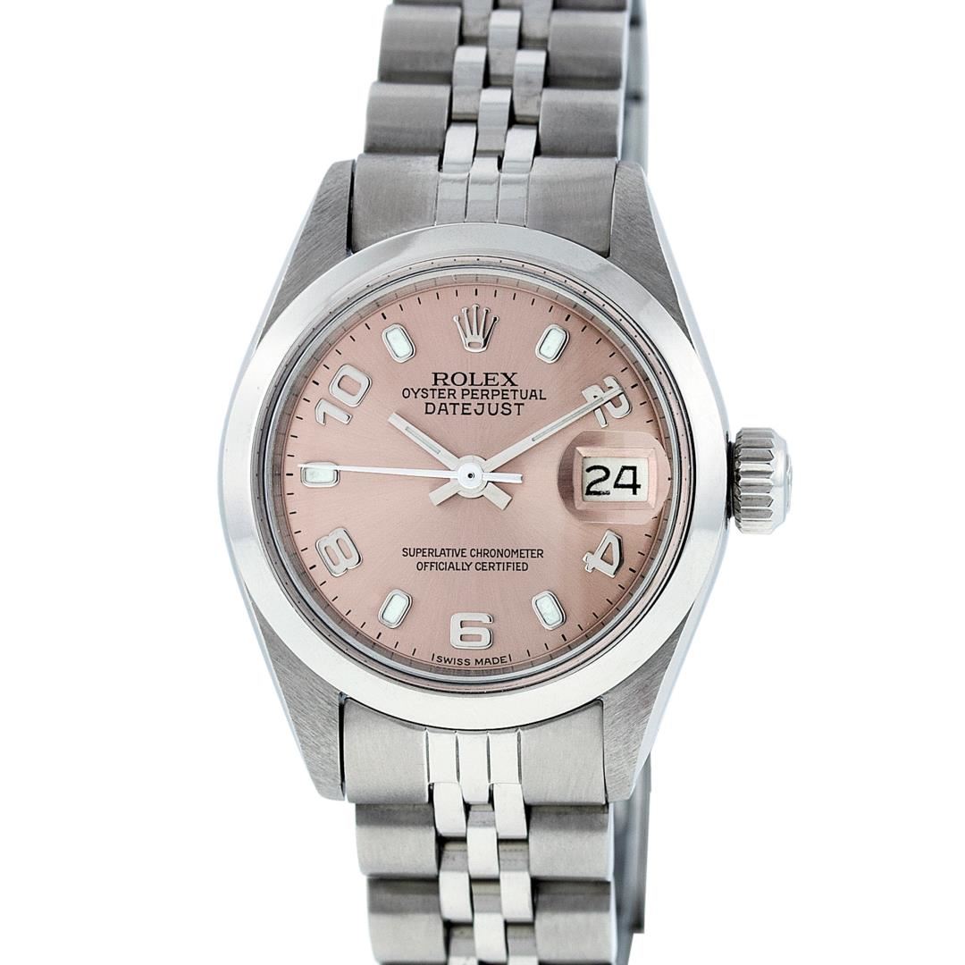 One Ladies Pre Owned Stainless Steel Rolex Polished Bright with Satin Finish, Serviced & Electronically Tested, Rolex Stainless Steel Case: 26mm, Rolex Stainless Steel Crown, Rolex Bezel: Stainless Steel Smooth Bezel. Custom Crystal: New With Cyclops Lens. Custom Hands: New Luminescent Hands. Rolex Movement: Automatic Winding Movement. Dial: Salmon Arabic Dial With Dash Track, Date Window: 3 O'Clock Position Date Display, Model: Datejust. Condition: G-6 Extra Fine. Rolex Bracelet: Stainless Steel Jubilee Band. Bright Polish & Satin Finish. 6.0 Inch Length, Adjustable. Standard Clasp, With Rolex Logo. This Watch Has Been Serviced Time Tested And Is In Excellent Condition It Is Free Of All Scratches And Dents.
