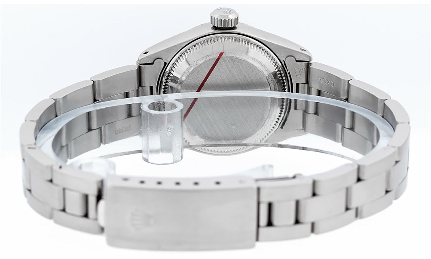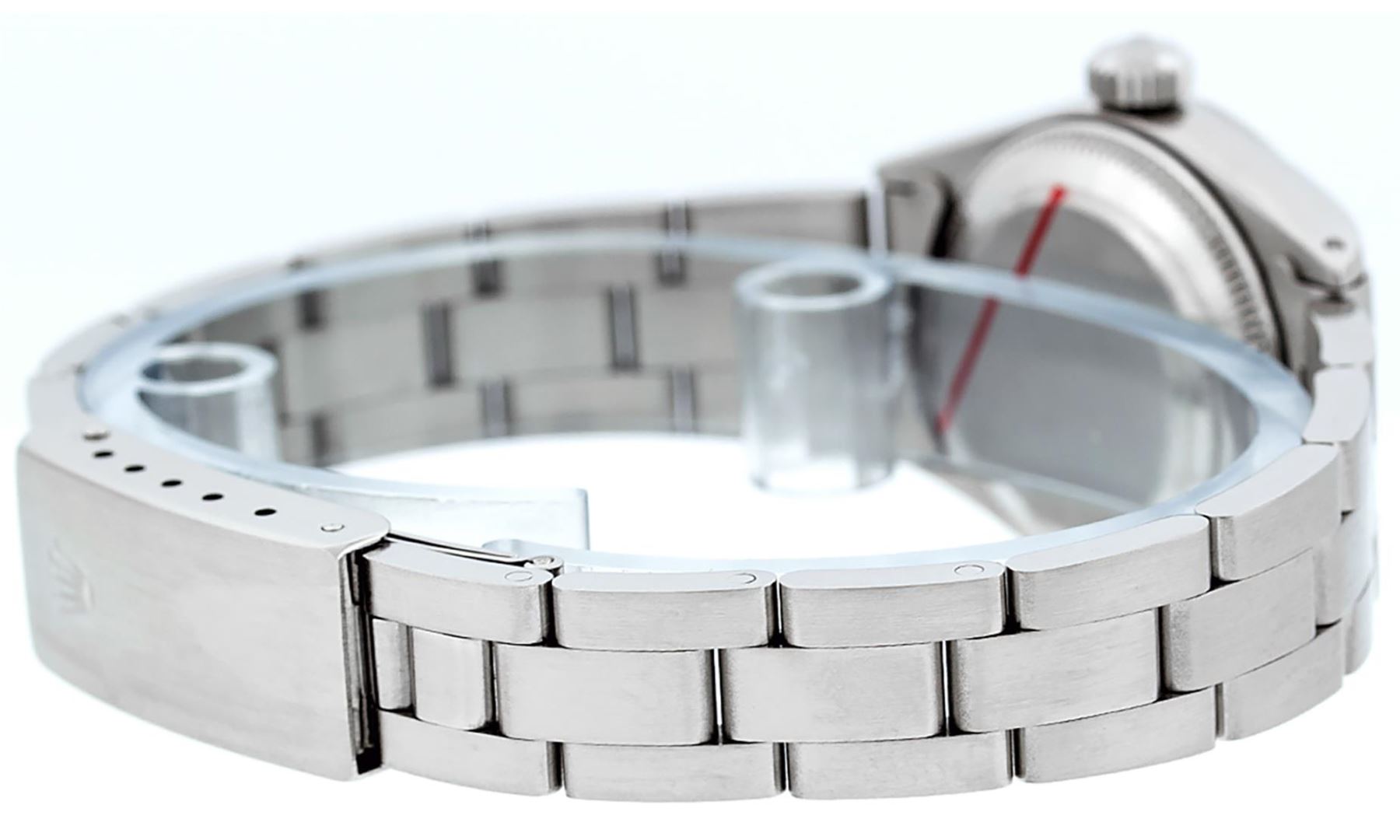 One Ladies Pre Owned Stainless Steel Rolex Polished Bright with Satin Finish, Serviced & Electronically Tested, Rolex Stainless Steel Case: 26mm, Rolex Stainless Steel Crown, Rolex Bezel: Stainless Steel Smooth Bezel. Custom Crystal: New Sapphire With Magnified Date Window. Custom Hands: New Luminescent Hands. Rolex Movement: Automatic Winding Movement. Rolex Dial: Salmon With Arabic Arabic Hour Markers And Dash Track, Date Window: 3 O'Clock Position Date Display, Model: Datejust. Condition: G-6 Extra Fine. Rolex Bracelet: Stainless Steel Oyster Band. Bright Polish & Satin Finish. 6.0 Inch Length, Adjustable. Standard Clasp, With Rolex Logo. This Watch Has Been Serviced Time Tested And Is In Excellent Condition It Is Free Of All Scratches And Dents.