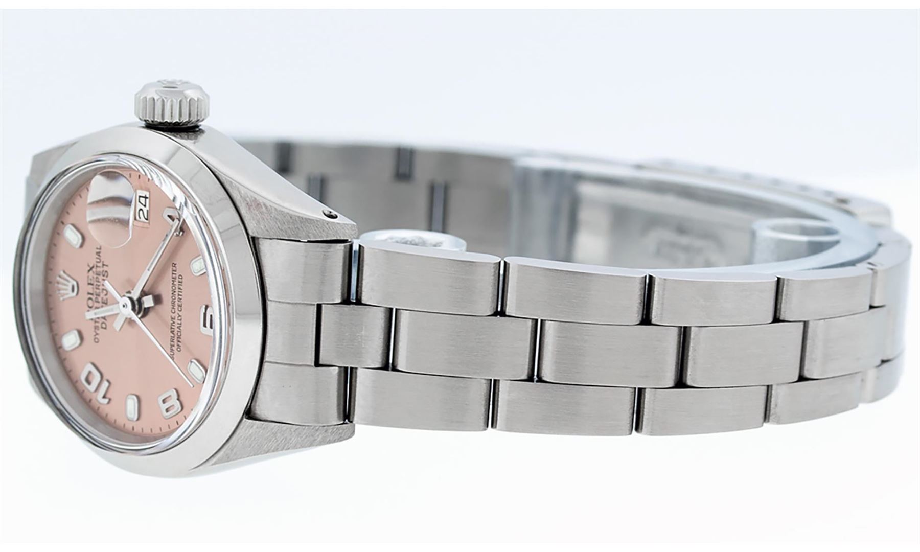 One Ladies Stainless Steel Rolex Datejust Polished Bright with Satin Finish, Serviced & Electronically Tested, Stainless Steel Case: 26mm, Stainless Steel Crown, Bezel: Stainless Steel Smooth Bezel. Custom Crystal: New Acrylic Cyclops Lens. Custom Hands: New Luminescent Hands. Movement: Automatic Winding Movement Caliber 2030. Dial: Salmon Arabic Dial With Dash track, Date Window: 3 O'Clock Position Date Display, Model: Datejust. Condition: G-6 Extra Fine. Bracelet: Stainless Steel Oyster Band. Bright Polish & Satin Finish. 6.0 Inch Length, Adjustable. Standard Clasp, With Rolex Logo. This Watch Has Been Serviced Time Tested And Is In Excellent Condition It Is Free Of All Scratches And Dents.