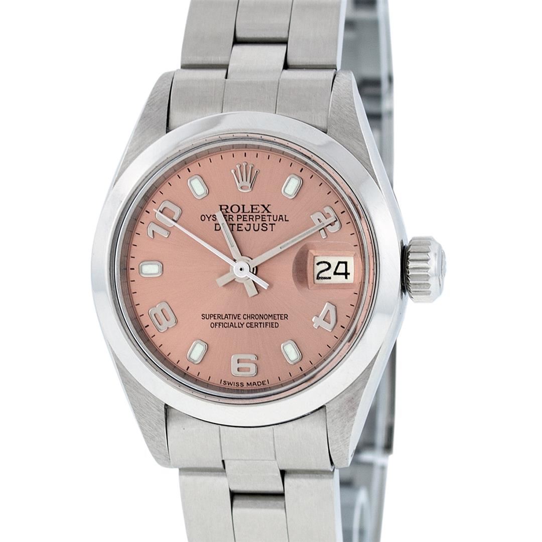 One Ladies Stainless Steel Rolex Datejust Polished Bright with Satin Finish, Serviced & Electronically Tested, Stainless Steel Case: 26mm, Stainless Steel Crown, Bezel: Stainless Steel Smooth Bezel. Custom Crystal: New Acrylic Cyclops Lens. Custom Hands: New Luminescent Hands. Movement: Automatic Winding Movement Caliber 2030. Dial: Salmon Arabic Dial With Dash track, Date Window: 3 O'Clock Position Date Display, Model: Datejust. Condition: G-6 Extra Fine. Bracelet: Stainless Steel Oyster Band. Bright Polish & Satin Finish. 6.0 Inch Length, Adjustable. Standard Clasp, With Rolex Logo. This Watch Has Been Serviced Time Tested And Is In Excellent Condition It Is Free Of All Scratches And Dents.