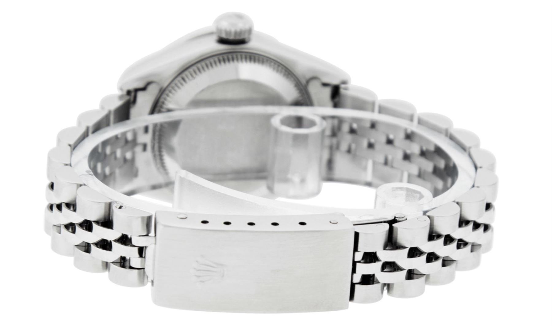 One Quickset Pre Owned Ladies Stainless Steel Rolex Date Polished Bright with Satin Finish, Serviced & Electronically Tested, Rolex Stainless Steel Case: 26mm, Rolex Stainless Steel Crown, Custom Diamond Lugs: 24 Diamonds On Lugs, Clarity: SI-VS, Color: G to H. Custom Bezel: New 18K White Gold Beadset Diamond Bezel, Stone Count: 32 Diamonds On Bezel, Total Weight .70 Carat, Clarity: SI-VS, Color: G to H. Custom Crystal: New Sapphire With Magnified Date Window. Custom Hands: New Luminescent Hands. Rolex Movement: Automatic Winding 2235 Movement. Rolex Dial: Salmon Arabic With Dash Track, Date Window: 3 O'Clock Position Date Display, Model: Sapphire Quickset Date. Condition: G-6 Extra Fine. Rolex Bracelet: Stainless Steel Jubilee Band. Bright Polish & Satin Finish. 6.0 Inch Length, Adjustable. Standard Clasp, With Rolex Logo. This Watch Has Been Serviced Time Tested And Is In Excellent Condition It Is Free Of All Scratches And Dents.