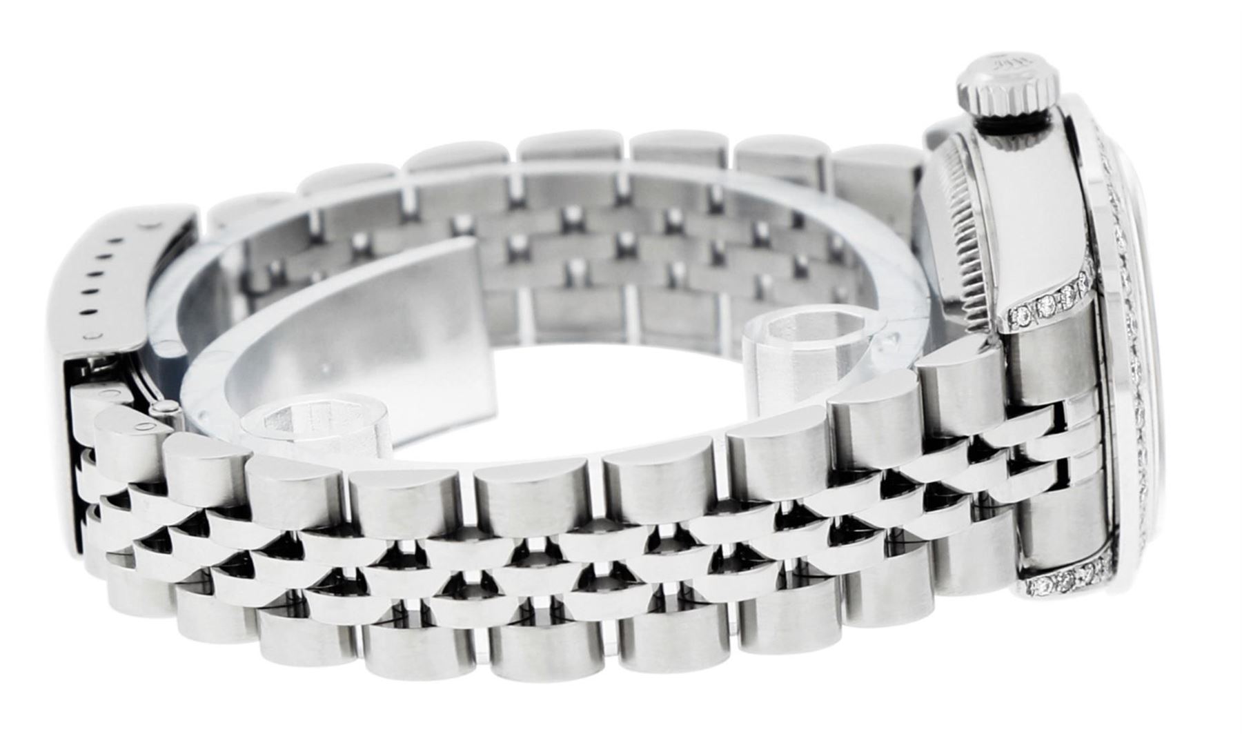 One Quickset Pre Owned Ladies Stainless Steel Rolex Date Polished Bright with Satin Finish, Serviced & Electronically Tested, Rolex Stainless Steel Case: 26mm, Rolex Stainless Steel Crown, Custom Diamond Lugs: 24 Diamonds On Lugs, Clarity: SI-VS, Color: G to H. Custom Bezel: New 18K White Gold Beadset Diamond Bezel, Stone Count: 32 Diamonds On Bezel, Total Weight .70 Carat, Clarity: SI-VS, Color: G to H. Custom Crystal: New Sapphire With Magnified Date Window. Custom Hands: New Luminescent Hands. Rolex Movement: Automatic Winding 2235 Movement. Rolex Dial: Salmon Arabic With Dash Track, Date Window: 3 O'Clock Position Date Display, Model: Sapphire Quickset Date. Condition: G-6 Extra Fine. Rolex Bracelet: Stainless Steel Jubilee Band. Bright Polish & Satin Finish. 6.0 Inch Length, Adjustable. Standard Clasp, With Rolex Logo. This Watch Has Been Serviced Time Tested And Is In Excellent Condition It Is Free Of All Scratches And Dents.