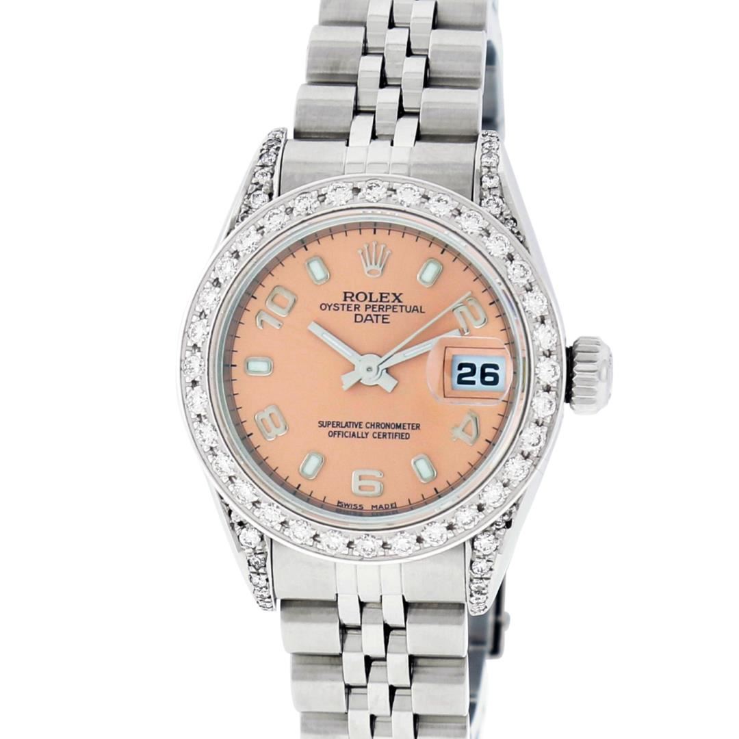 One Quickset Pre Owned Ladies Stainless Steel Rolex Date Polished Bright with Satin Finish, Serviced & Electronically Tested, Rolex Stainless Steel Case: 26mm, Rolex Stainless Steel Crown, Custom Diamond Lugs: 24 Diamonds On Lugs, Clarity: SI-VS, Color: G to H. Custom Bezel: New 18K White Gold Beadset Diamond Bezel, Stone Count: 32 Diamonds On Bezel, Total Weight .70 Carat, Clarity: SI-VS, Color: G to H. Custom Crystal: New Sapphire With Magnified Date Window. Custom Hands: New Luminescent Hands. Rolex Movement: Automatic Winding 2235 Movement. Rolex Dial: Salmon Arabic With Dash Track, Date Window: 3 O'Clock Position Date Display, Model: Sapphire Quickset Date. Condition: G-6 Extra Fine. Rolex Bracelet: Stainless Steel Jubilee Band. Bright Polish & Satin Finish. 6.0 Inch Length, Adjustable. Standard Clasp, With Rolex Logo. This Watch Has Been Serviced Time Tested And Is In Excellent Condition It Is Free Of All Scratches And Dents.