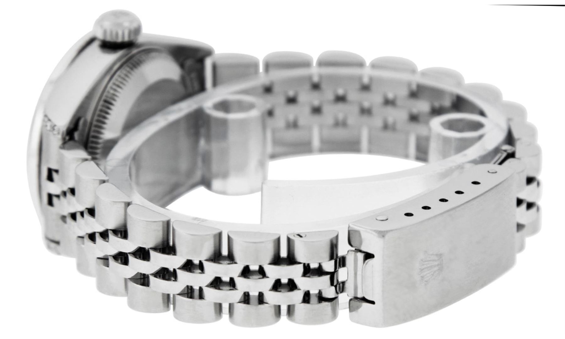 One Quickset Pre Owned Ladies Stainless Steel Rolex Date Polished Bright with Satin Finish, Serviced & Electronically Tested, Rolex Stainless Steel Case: 26mm, Rolex Stainless Steel Crown, Custom Diamond Lugs: 24 Diamonds On Lugs, Clarity: SI-VS, Color: G to H. Custom Bezel: New 18K White Gold Beadset Diamond Bezel, Stone Count: 32 Diamonds On Bezel, Total Weight .70 Carat, Clarity: SI-VS, Color: G to H. Custom Crystal: New Sapphire With Magnified Date Window. Custom Hands: New Luminescent Hands. Rolex Movement: Automatic Winding 2235 Movement. Rolex Dial: Salmon Arabic With Dash Track, Date Window: 3 O'Clock Position Date Display, Model: Sapphire Quickset Date. Condition: G-6 Extra Fine. Rolex Bracelet: Stainless Steel Jubilee Band. Bright Polish & Satin Finish. 6.0 Inch Length, Adjustable. Standard Clasp, With Rolex Logo. This Watch Has Been Serviced Time Tested And Is In Excellent Condition It Is Free Of All Scratches And Dents.