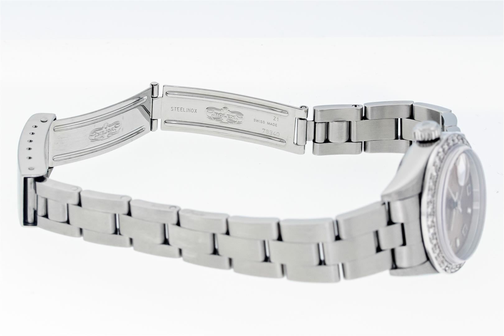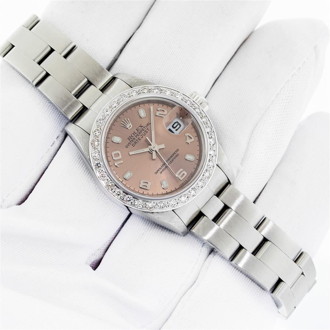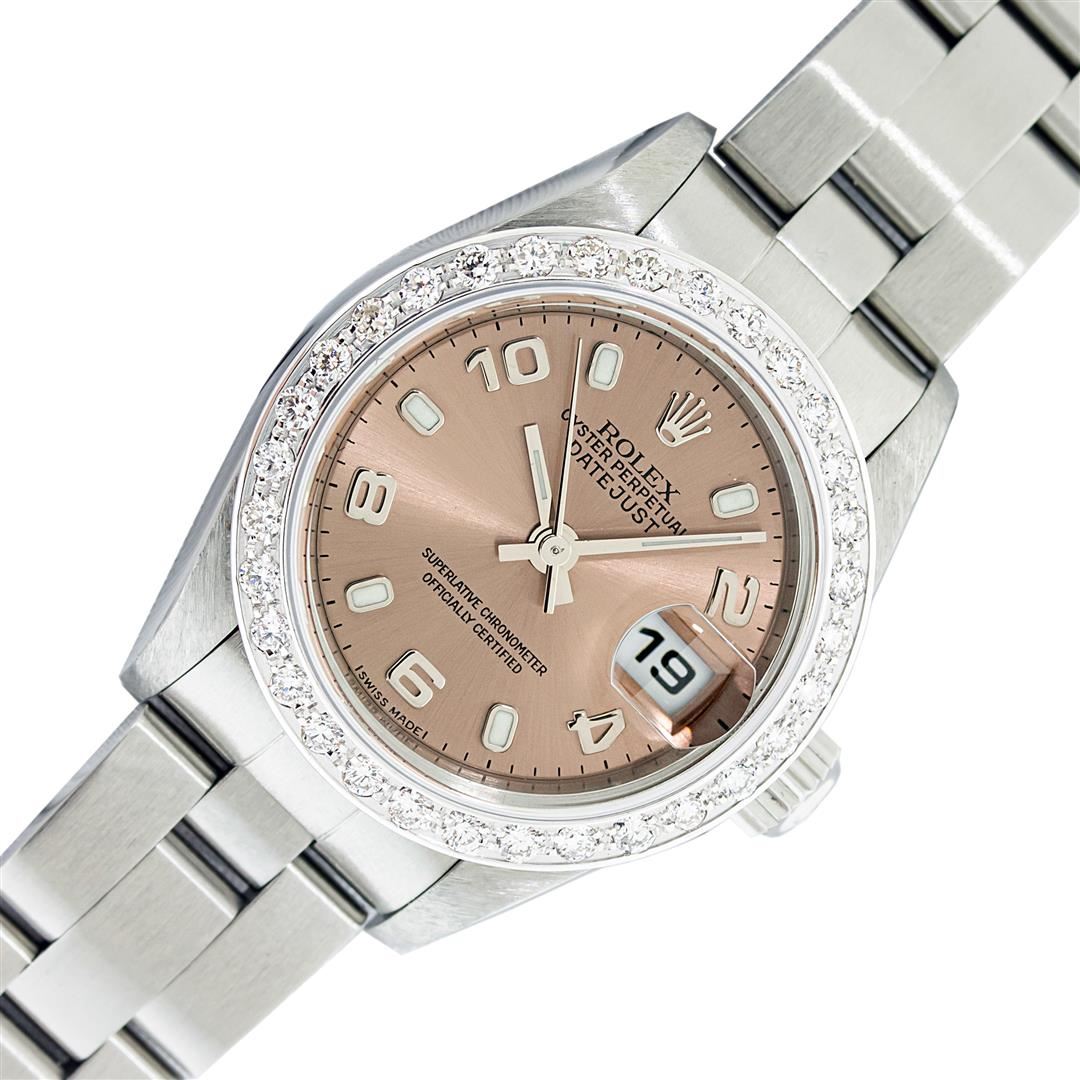 One Ladies Stainless Steel Rolex Datejust Polished Bright with Satin Finish, Serviced & Electronically Tested, Stainless Steel Case: 26mm, Rolex Stainless Steel Crown, Custom Bezel: New 18K White Gold Bead Set Diamond Bezel, Diamond Count: 32 Diamonds, Clarity: SI-VS, Color: G to H. Custom Crystal: New Sapphire With Magnified Date Window. Custom Hands: New Luminescent Hands. Rolex Movement: Automatic Winding Movement. Rolex Dial: Salmon With Arabic Hour Markers & Dash Track. Date Window: 3 O'Clock Position Date Display, Model: Datejust. Condition: G-6 Extra Fine. Rolex Bracelet: Stainless Steel Oyster Band. Bright Polish & Satin Finish. 6.0 Inch Length, Adjustable. Standard Clasp, With Rolex Logo. This Pre Owned Watch Has Been Serviced Time Tested And Is In Excellent Condition It Is Free Of All Scratches And Dents.