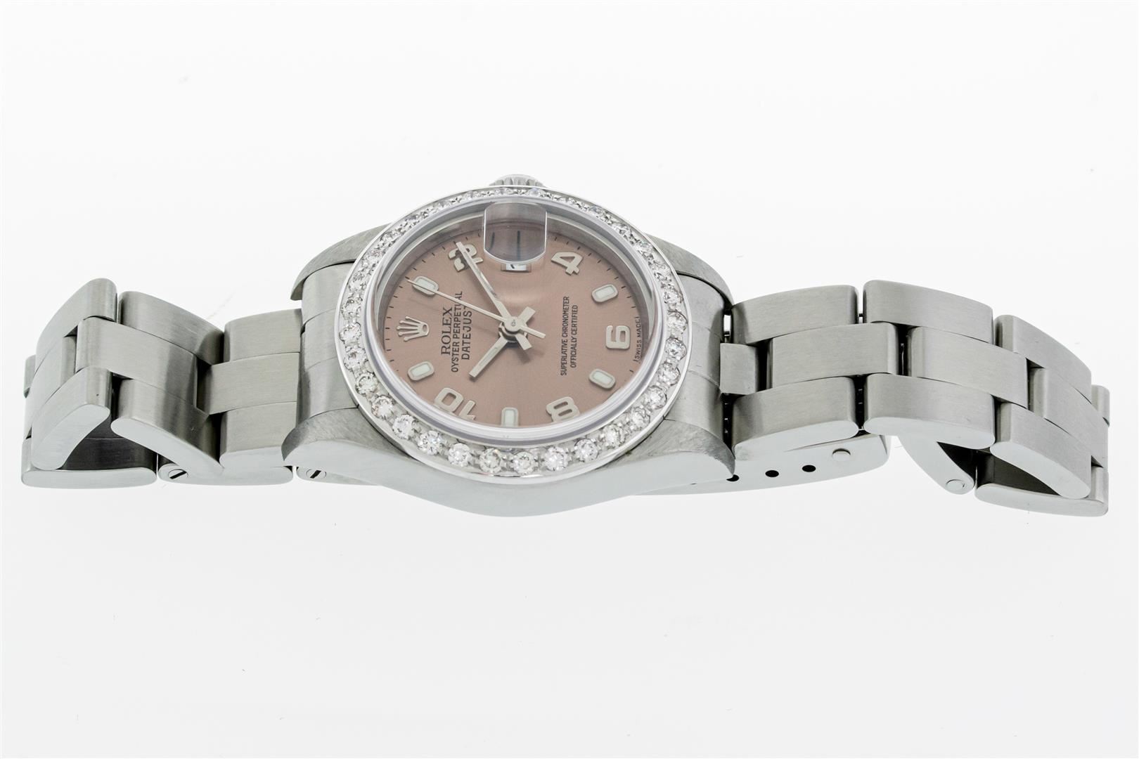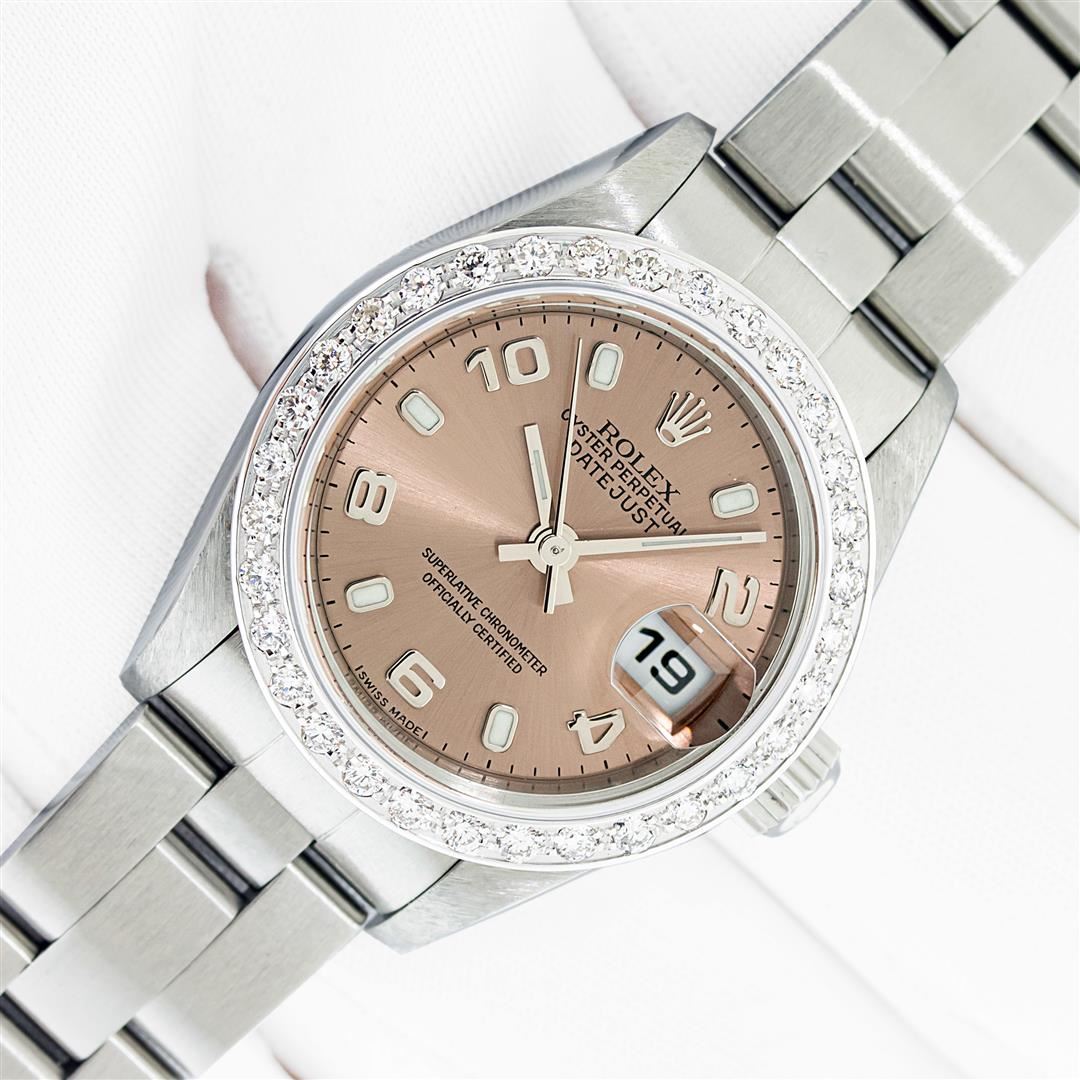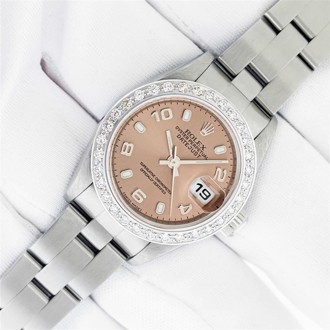 One Ladies Stainless Steel Rolex Datejust Polished Bright with Satin Finish, Serviced & Electronically Tested, Stainless Steel Case: 26mm, Rolex Stainless Steel Crown, Custom Bezel: New 18K White Gold Bead Set Diamond Bezel, Diamond Count: 32 Diamonds, Clarity: SI-VS, Color: G to H. Custom Crystal: New Sapphire With Magnified Date Window. Custom Hands: New Luminescent Hands. Rolex Movement: Automatic Winding Movement. Rolex Dial: Salmon With Arabic Hour Markers & Dash Track. Date Window: 3 O'Clock Position Date Display, Model: Datejust. Condition: G-6 Extra Fine. Rolex Bracelet: Stainless Steel Oyster Band. Bright Polish & Satin Finish. 6.0 Inch Length, Adjustable. Standard Clasp, With Rolex Logo. This Pre Owned Watch Has Been Serviced Time Tested And Is In Excellent Condition It Is Free Of All Scratches And Dents.