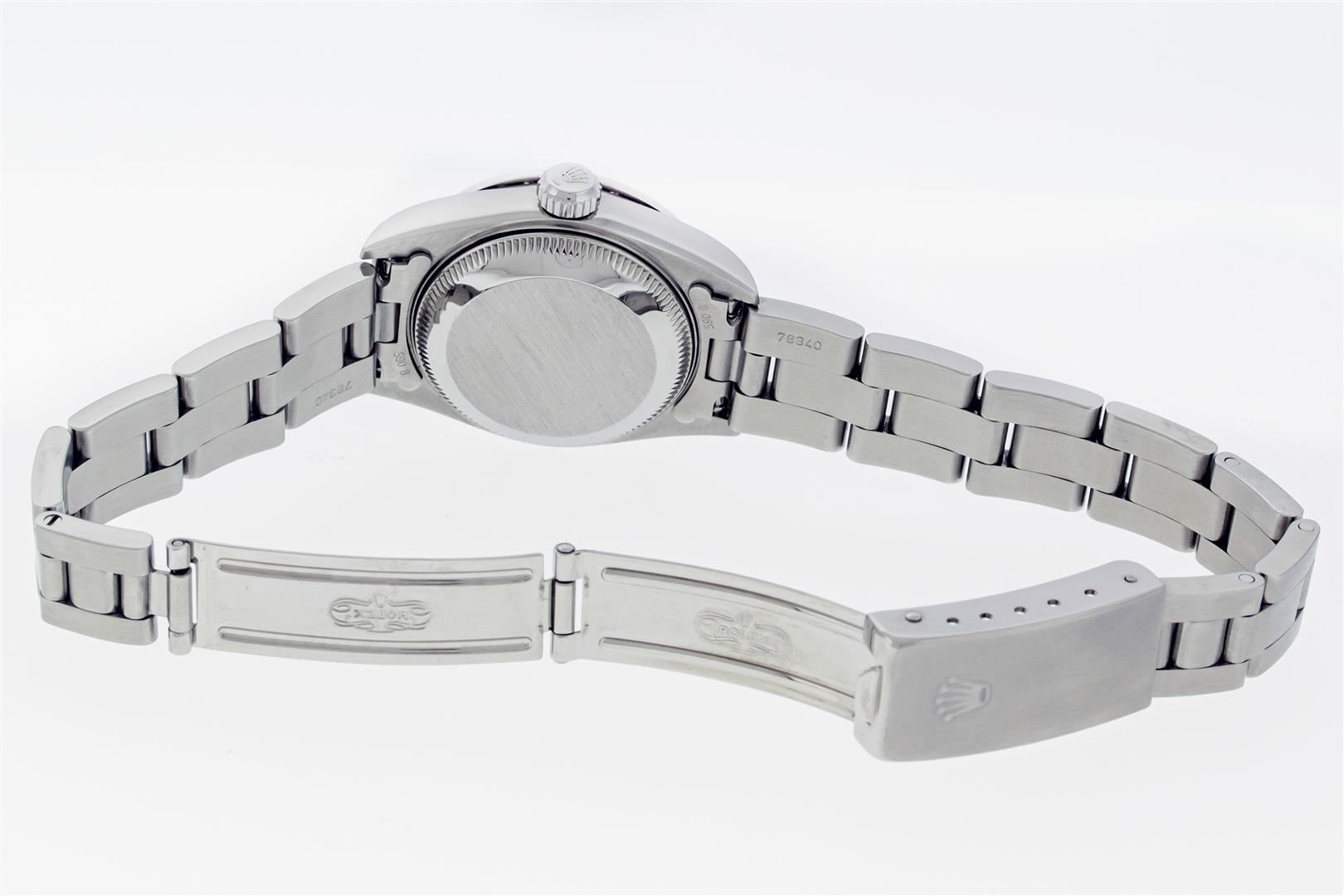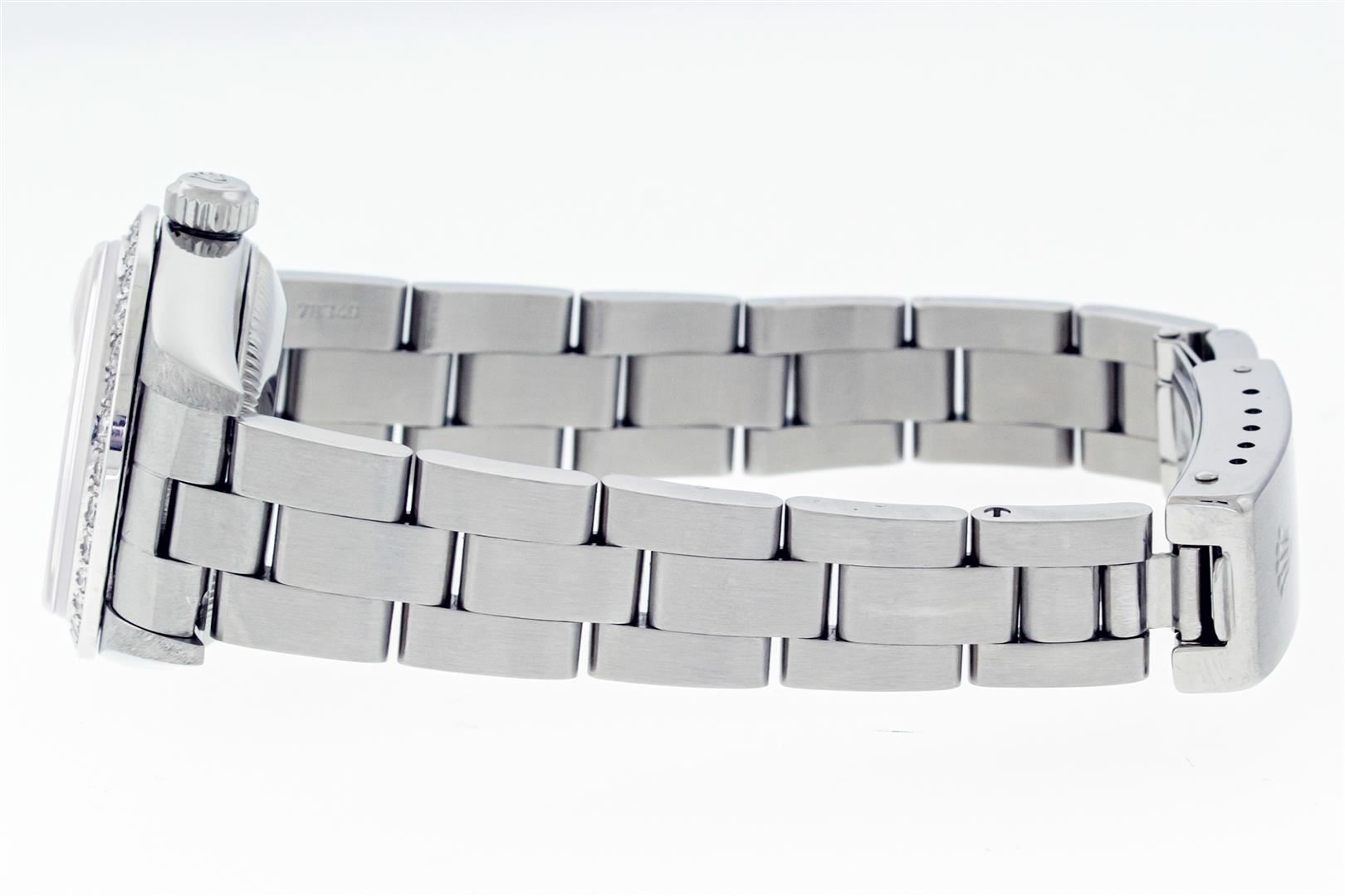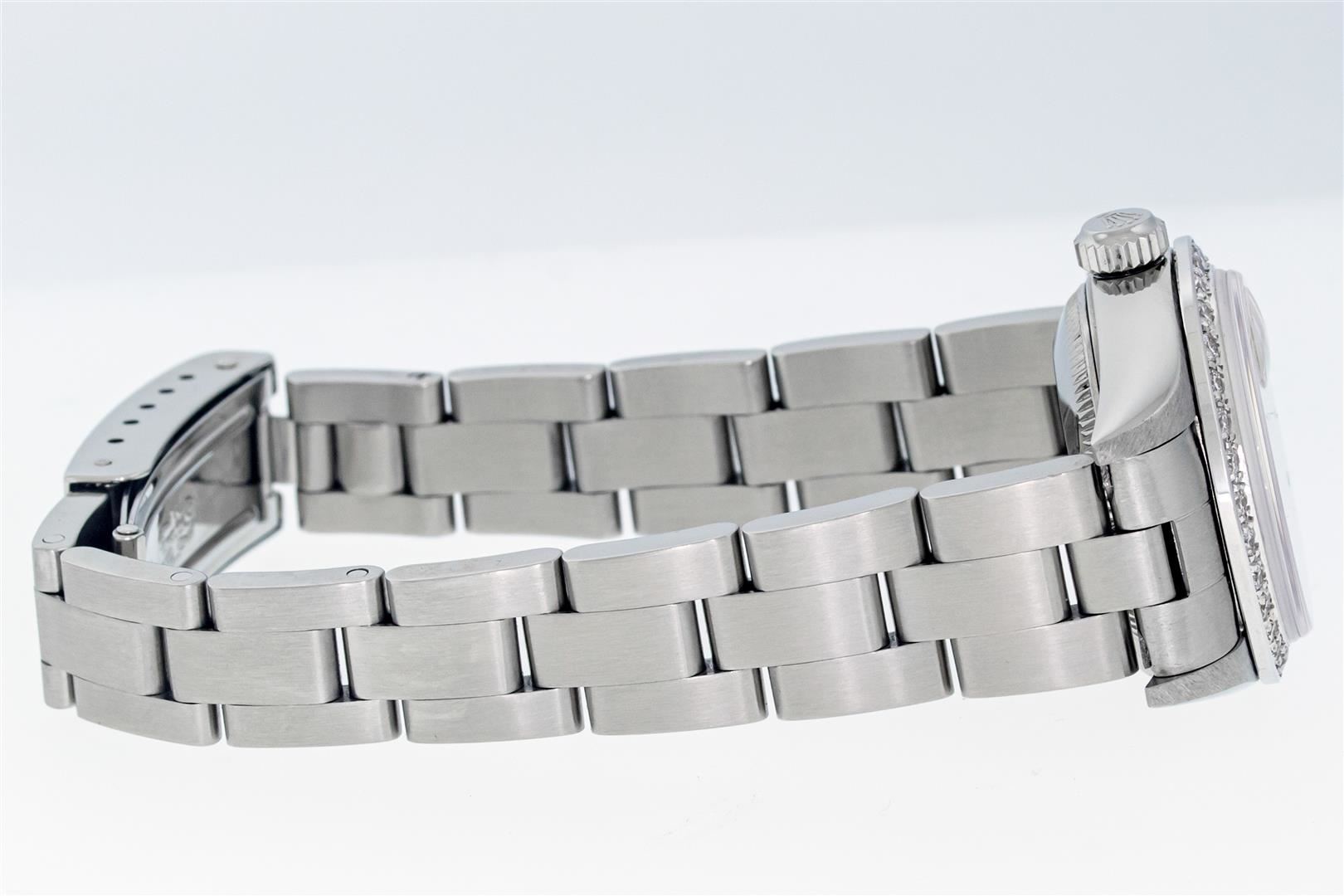 One Ladies Stainless Steel Rolex Datejust Polished Bright with Satin Finish, Serviced & Electronically Tested, Stainless Steel Case: 26mm, Rolex Stainless Steel Crown, Custom Bezel: New 18K White Gold Bead Set Diamond Bezel, Diamond Count: 32 Diamonds, Clarity: SI-VS, Color: G to H. Custom Crystal: New Sapphire With Magnified Date Window. Custom Hands: New Luminescent Hands. Rolex Movement: Automatic Winding Movement. Rolex Dial: Salmon With Arabic Hour Markers & Dash Track. Date Window: 3 O'Clock Position Date Display, Model: Datejust. Condition: G-6 Extra Fine. Rolex Bracelet: Stainless Steel Oyster Band. Bright Polish & Satin Finish. 6.0 Inch Length, Adjustable. Standard Clasp, With Rolex Logo. This Pre Owned Watch Has Been Serviced Time Tested And Is In Excellent Condition It Is Free Of All Scratches And Dents.