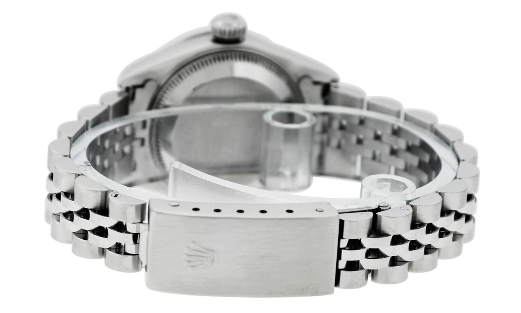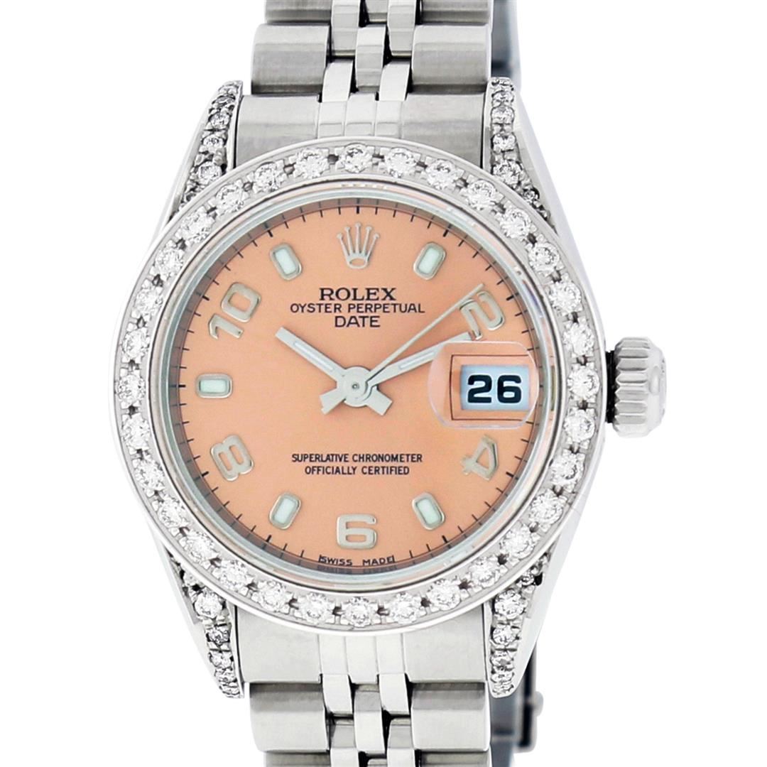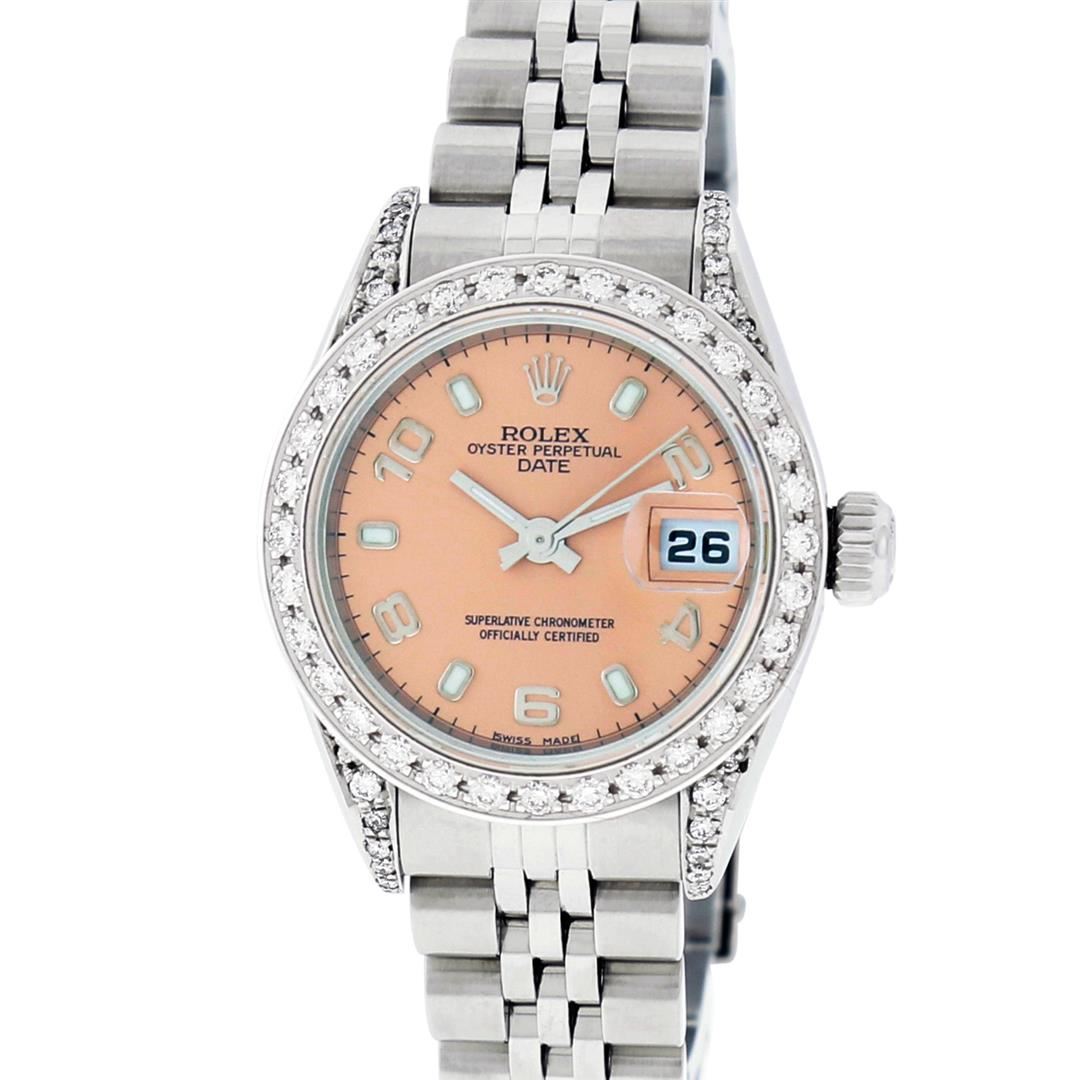 One Quickset Pre Owned Ladies Stainless Steel Rolex Datejust Polished Bright with Satin Finish, Serviced & Electronically Tested, Rolex Stainless Steel Case: 26mm, Rolex Stainless Steel Crown, Custom Diamond Lugs: 24 Diamonds On Lugs, Clarity: SI-VS, Color: G to H. Custom Bezel: New 18K White Gold Beadset Diamond Bezel, Stone Count: 32 Diamonds On Bezel, Total Weight .70 Carat, Clarity: SI-VS, Color: G to H. Custom Crystal: New Scratch Resistant Synthetic Sapphire Cyclops Lens. Custom Hands: New Luminescent Hands. Rolex Movement: Automatic Winding 2235 Movement. Rolex Dial: Salmon Arabic With Dash Track, Date Window: 3 O'Clock Position Date Display, Model: Sapphire Quickset Datejust. Condition: G-6 Extra Fine. Rolex Bracelet: Stainless Steel Jubilee Band. Bright Polish & Satin Finish. 6.0 Inch Length, Adjustable. Standard Clasp, With Rolex Logo. This Watch Has Been Serviced Time Tested And Is In Excellent Condition It Is Free Of All Scratches And Dents.