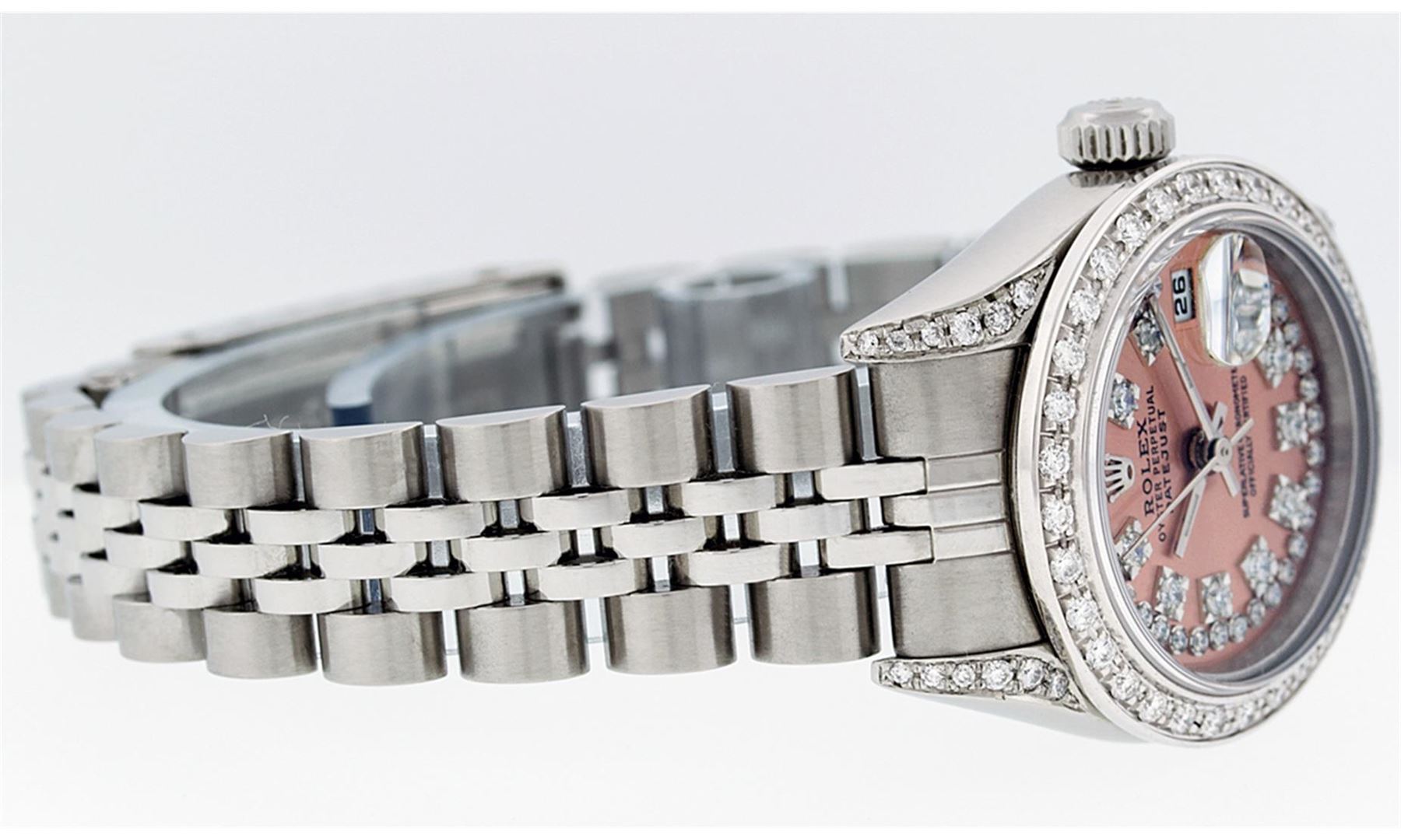 One Quickset Ladies Stainless Steel Rolex Datejust Polished Bright with Satin Finish, Serviced & Electronically Tested, Stainless Steel Case: 26mm, Stainless Steel Crown, Custom Diamond Lugs: 24 Diamonds On Lugs, Clarity: SI-VS, Color: G to H. Custom Bezel: New 18K White Gold Beadset Diamond Bezel, Stone Count: 32 Diamonds On Bezel, Total Weight .70 Carat, Clarity: SI-VS, Color: G to H. Custom Crystal: New Scratch Resistant Synthetic Sapphire Cyclops Lens. Custom Hands: New Luminescent Hands. Movement: Automatic Quickset Winding Movement Caliber 2230. Custom Dial: Refinished Single Cut Salmon String Diamond Dial, 43 Diamonds in Dial G To H In Color, Clarity: VS. Date Window: 3 O'Clock Position Date Display, Model: Caliber 2230 Quickset Datejust. Condition: G-6 Extra Fine. Bracelet: Stainless Steel Jubilee Band. Bright Polish & Satin Finish. 6.0 Inch Length, Adjustable. Standard Clasp, With Rolex Logo. This Watch Has Been Serviced Time Tested And Is In Excellent Condition It Is Free Of All Scratches And Dents.