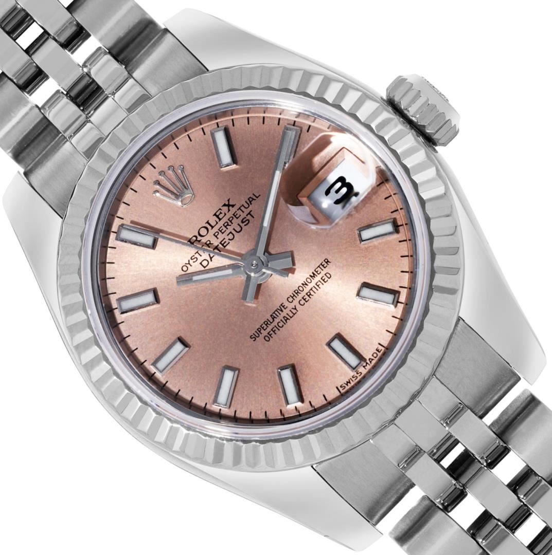 One Ladies Pre Owned Rolex Stainless Steel Datejust Wristwatch Polished Bright with Satin Finish, Serviced & Electronically Tested, Stainless Steel Case: 26mm, Stainless Steel Crown, Rolex Bezel: Rolex 18K White Gold Fluted bezel. Crystal: Sapphire With Magnified Date Window. Hands: Luminescent Hands. Rolex Movement: 2235 Automatic Winding Movement. Rolex Dial: Factory Salmon With Index Hour Markers And Dash Tracks. Date Window: 3 O'clock Position Date Display, Model: Quickset Datejust. Condition: G-6 Extra Fine. Rolex Bracelet: Stainless Steel Jubilee Band. Bright Polish & Satin Finish. 6.0 Inch Length, Adjustable. Hidden Clasp, With Rolex Logo. This Watch Has Been Serviced And Time Tested. It Is In Excellent Condition, Free Of All Scratches And Dents. This Watch Comes With A Rolex Box.