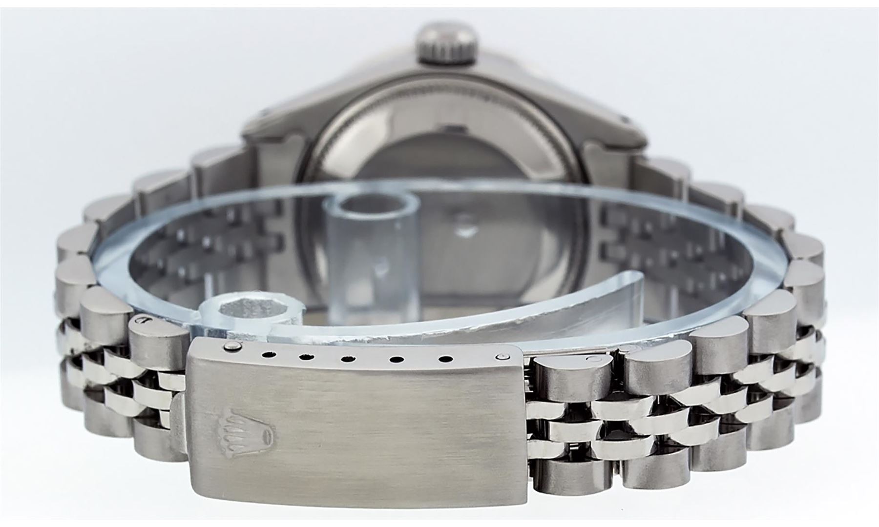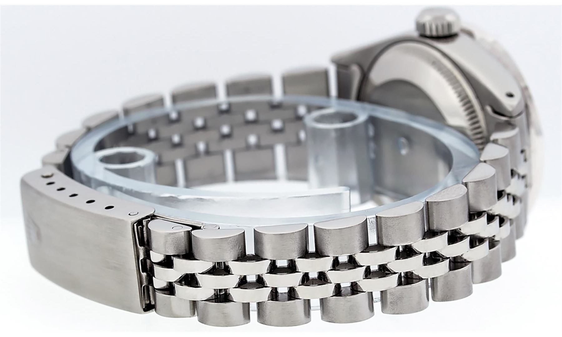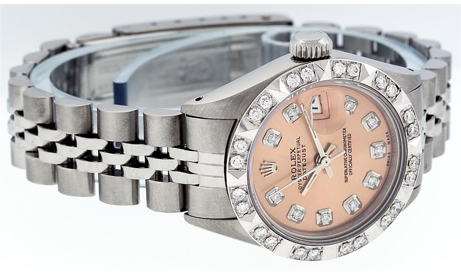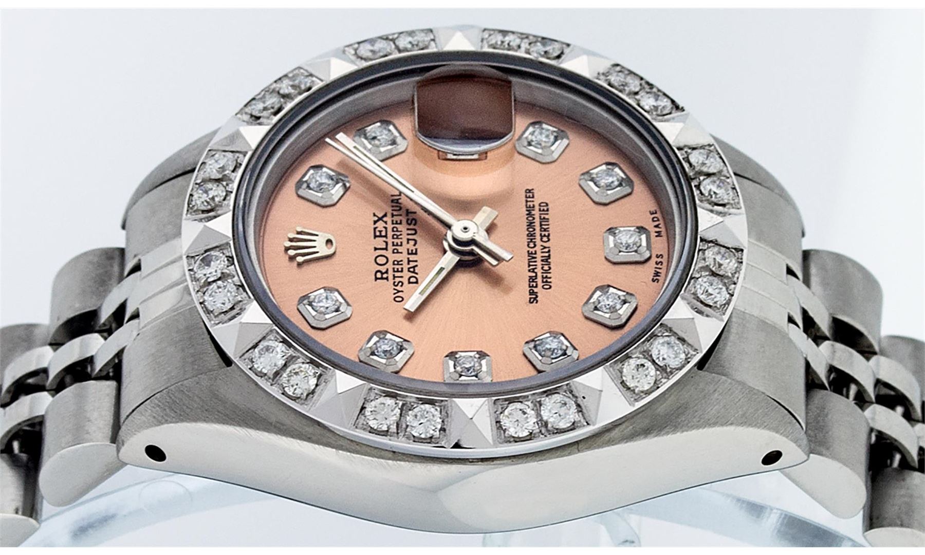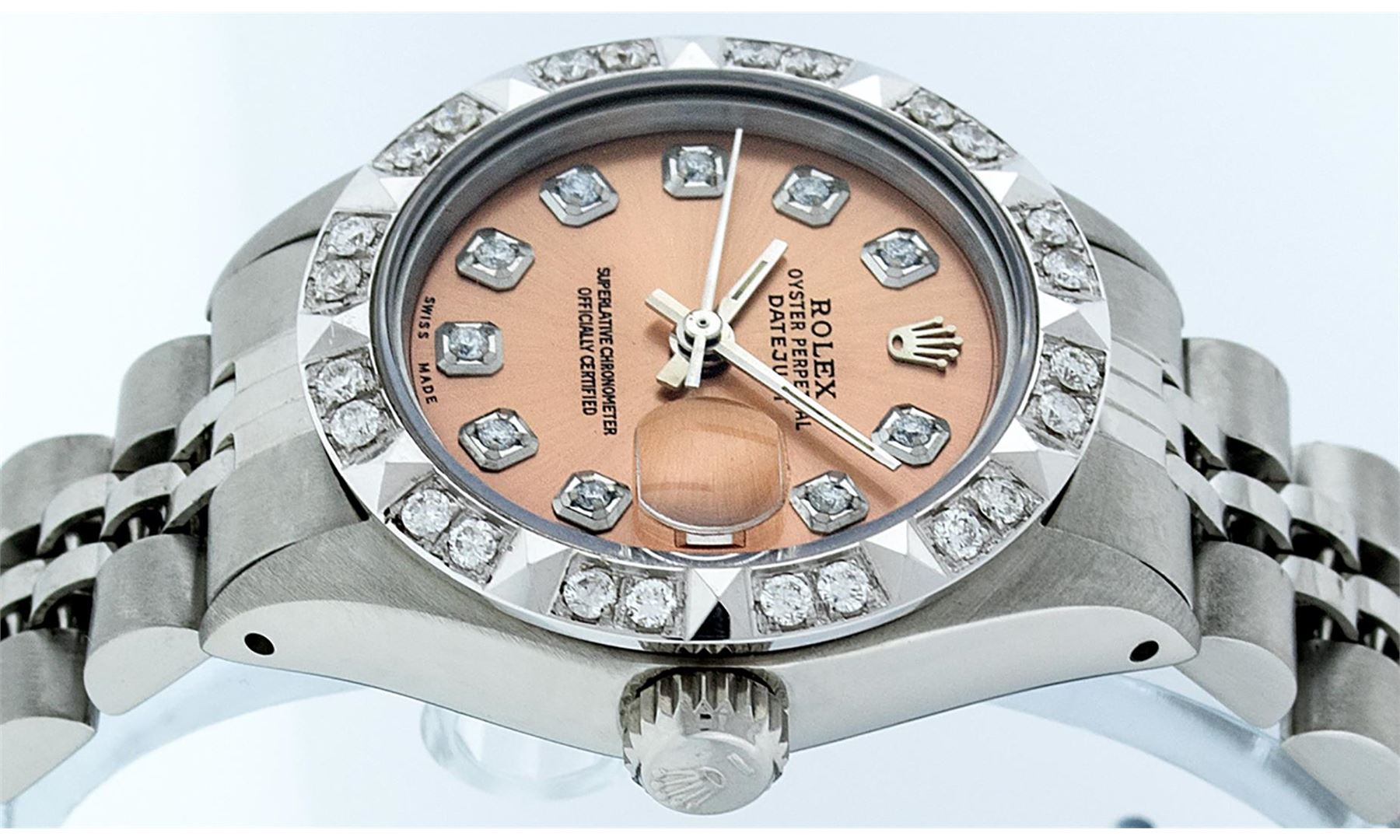 One Ladies Stainless Steel Rolex Datejust Polished Bright with Satin Finish, Serviced & Electronically Tested, Stainless Steel Case: 26mm, Stainless Steel Crown, Custom Bezel: New 18K White Gold Pyramid Diamond Bezel, Diamond Count: 24 Diamonds In Dial. Total Weight .50 Carat, Clarity: SI-VS, Color: G to H. Custom Crystal: New Scratch Resistant Synthetic Sapphire Cyclops Lens. Custom Hands: New Luminescent Hands. Movement: Automatic Winding Movement Caliber 2030. Custom Dial: Salmon Diamond Dial. Diamond Count: 10 Diamonds In Dial. Clarity: SI-VS, Color: G to H. Date Window: 3 O'Clock Position Date Display, Model: Datejust. Condition: G-6 Extra Fine. Bracelet: Stainless Steel Jubilee Band With Rolex Crown On Buckle. Bright Polish & Satin Finish. Band Length: 6.0 Inch Length, Adjustable. Standard Clasp, With Rolex Logo. This Watch Has Been Serviced Time Tested And Is In Excellent Condition It Is Free Of All Scratches And Dents.