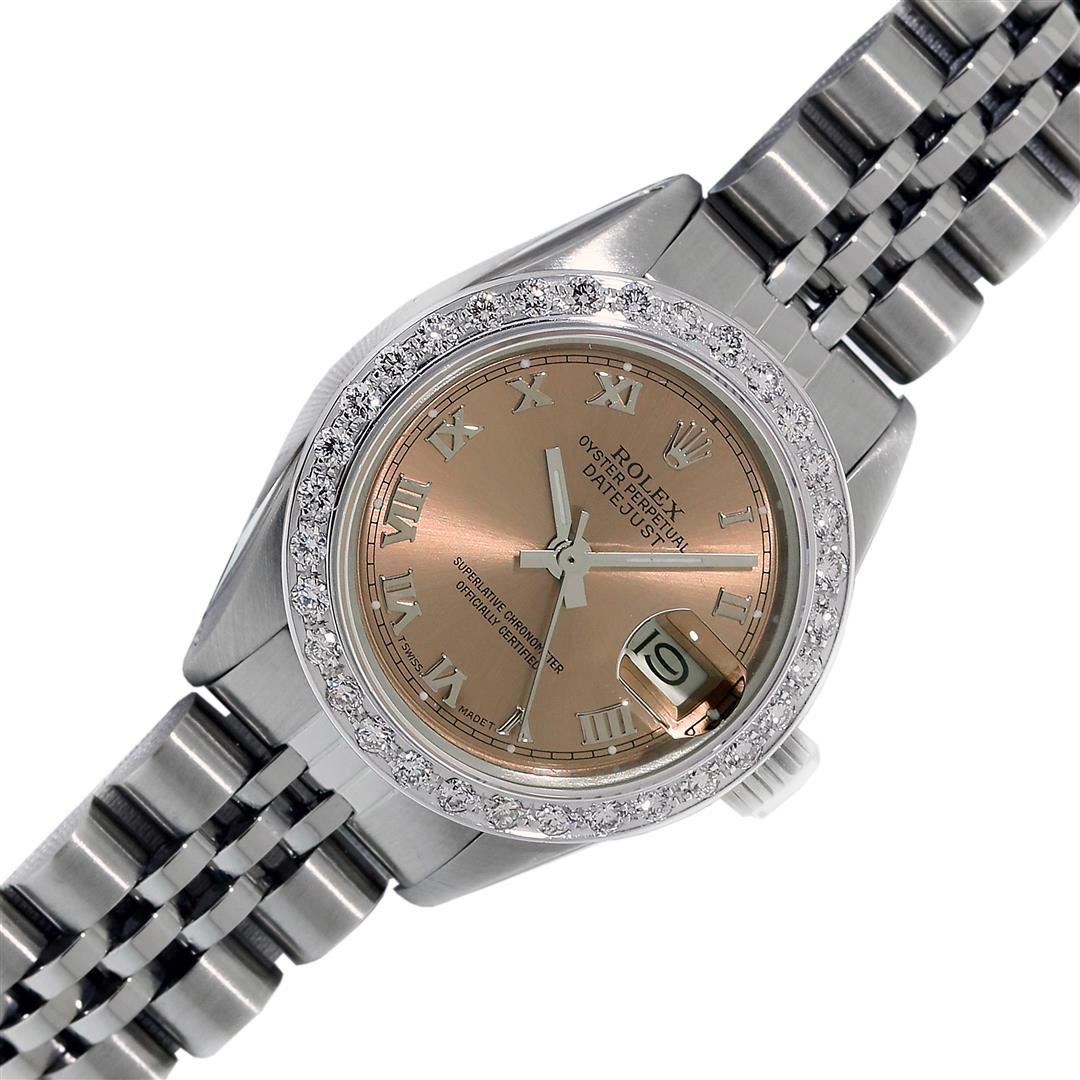 One Ladies Pre Owned Stainless Steel Rolex Datejust Polished Bright with Satin Finish Serviced & Electronically Tested, Rolex Stainless Steel Case: 26mm, Rolex Stainless Steel Crown, Custom Bezel: New 18K White Gold Beadset Diamond Bezel, Diamond Count: 32 Diamonds On Bezel Dial, Clarity: SI-VS, Color: G to H. Custom Crystal: New Scratch Resistant Synthetic Sapphire Cyclops Lens. Custom Hands: New Luminescent Hands. Rolex Movement: Automatic Winding Movement. Rolex Dial: Salmon Roman Dial. Date Window: 3 O'Clock Position Date Display, Model: Datejust. Condition: G-6 Extra Fine. Bracelet: Stainless Steel Jubilee Band With Rolex Crown On Buckle. Bright Polish & Satin Finish. Band Length: 6.0 Inch Length, Adjustable. Standard Clasp, With Rolex Logo. This Watch Has Been Serviced Time Tested And Is In Excellent Condition It Is Free Of All Scratches And Dents.