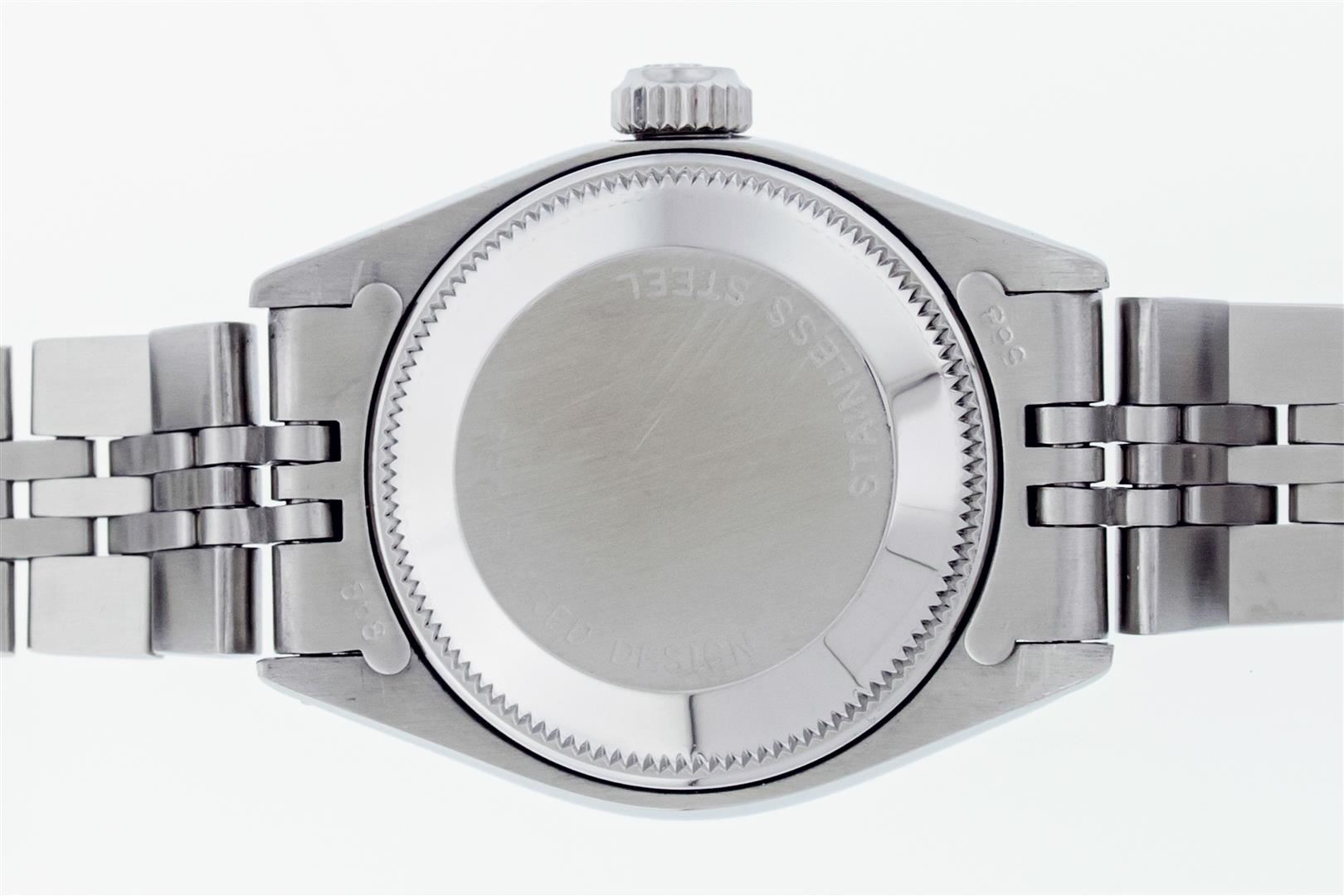 One Ladies Pre Owned Stainless Steel Rolex Datejust Polished Bright with Satin Finish Serviced & Electronically Tested, Rolex Stainless Steel Case: 26mm, Rolex Stainless Steel Crown, Custom Bezel: New 18K White Gold Beadset Diamond Bezel, Diamond Count: 32 Diamonds On Bezel Dial, Clarity: SI-VS, Color: G to H. Custom Crystal: New Scratch Resistant Synthetic Sapphire Cyclops Lens. Custom Hands: New Luminescent Hands. Rolex Movement: Automatic Winding Movement. Rolex Dial: Salmon Roman Dial. Date Window: 3 O'Clock Position Date Display, Model: Datejust. Condition: G-6 Extra Fine. Bracelet: Stainless Steel Jubilee Band With Rolex Crown On Buckle. Bright Polish & Satin Finish. Band Length: 6.0 Inch Length, Adjustable. Standard Clasp, With Rolex Logo. This Watch Has Been Serviced Time Tested And Is In Excellent Condition It Is Free Of All Scratches And Dents.
