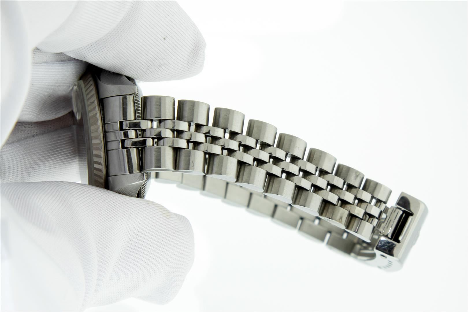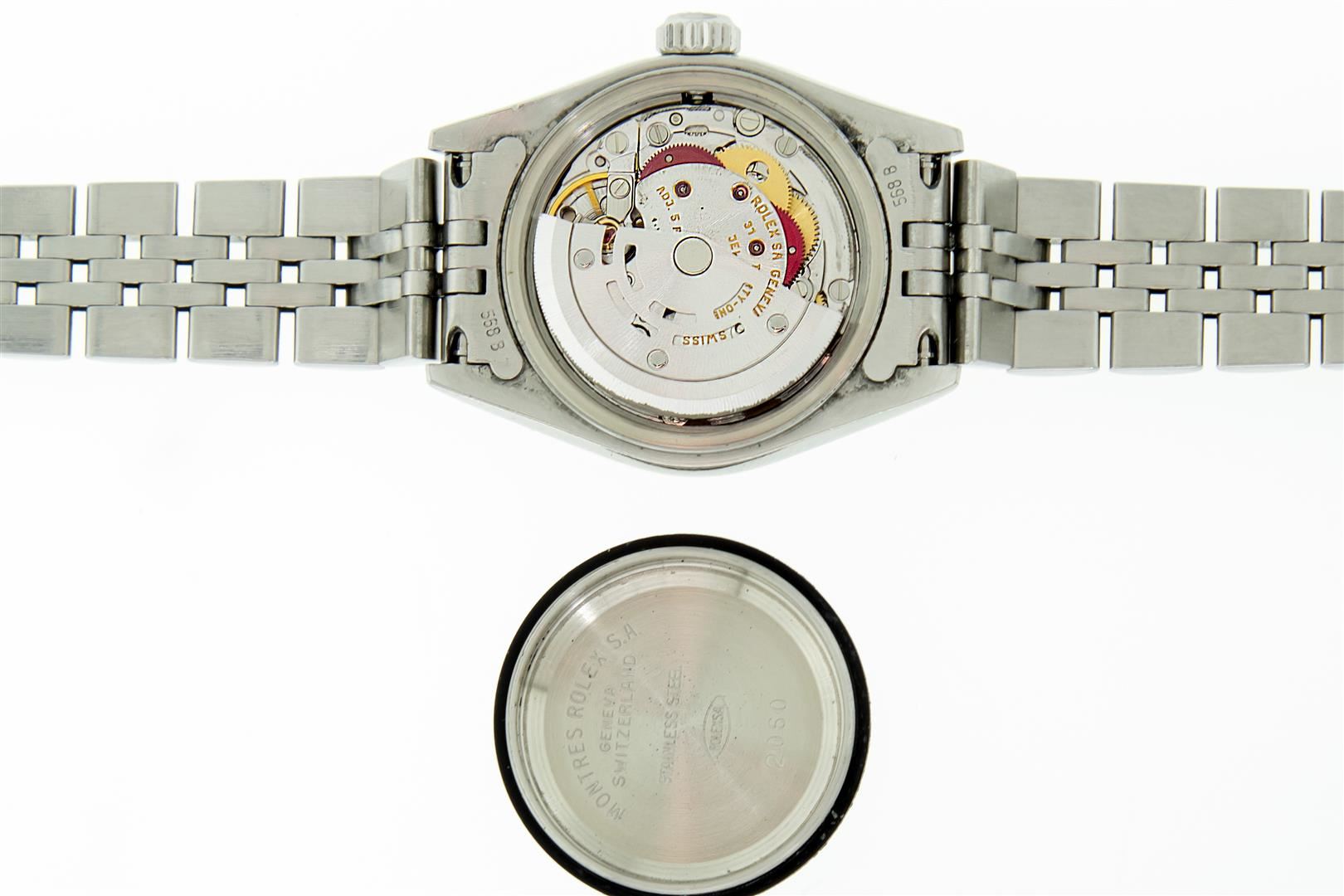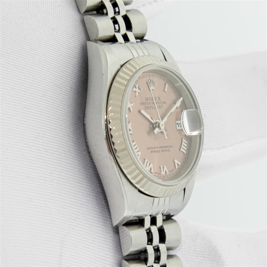 One Quickset Pre Owned Ladies Stainless Steel Rolex Datejust Polished Bright with Satin Finish, Serviced & Electronically Tested, Rolex Stainless Steel Case: 26mm, Rolex Stainless Steel Crown, Rolex Bezel: White Gold Fluted Bezel, Custom Crystal: New Sapphire With Date Window. Custom Hands: New Luminescent Hands. Rolex Movement: Automatic Winding Movement. Rolex Dial: Salmon Roman, Date Window: 3 O'Clock Position Date Display, Model: Quickset 2230 Datejust. Condition: G-6 Extra Fine. Rolex Bracelet: Stainless Steel Jubilee Band. Bright Polish & Satin Finish. 6.0 Inch Length, Adjustable. Standard Clasp, With Rolex Logo. This Watch Has Been Serviced Time Tested And Is In Excellent Condition It Is Free Of All Scratches And Dents.