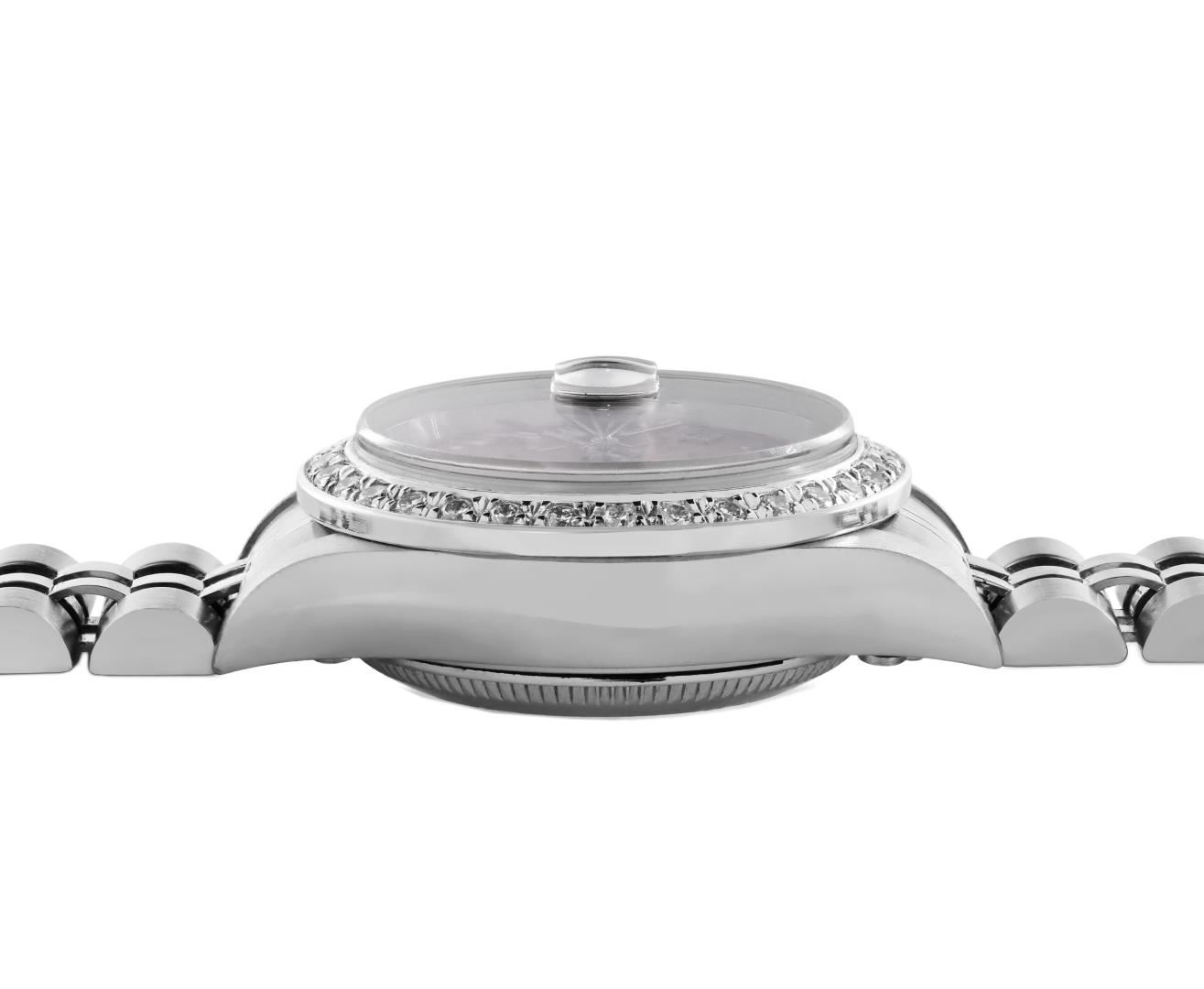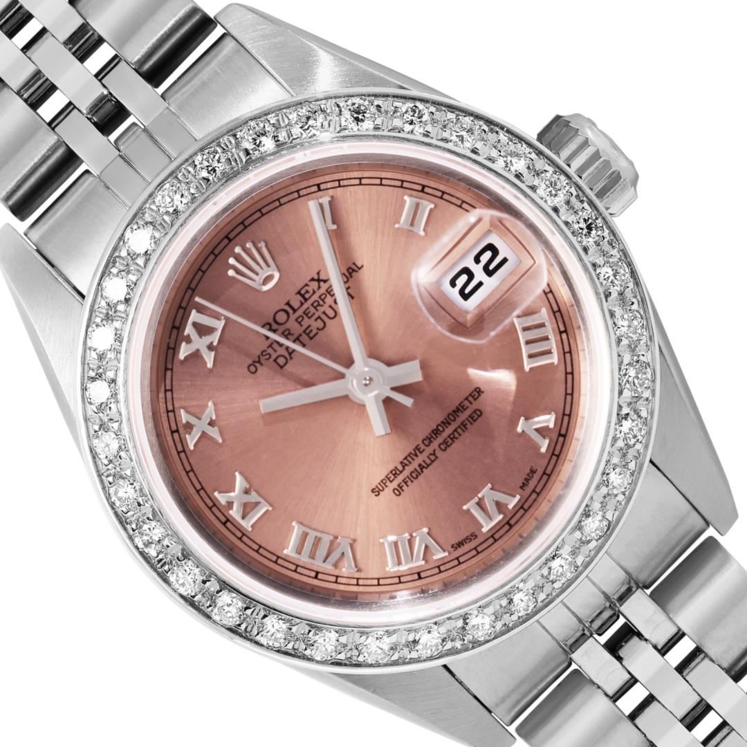 One Rolex Ladies Pre Owned Quickset Stainless Steel Datejust Wristwatch Polished Bright with Satin Finish, Serviced & Electronically Tested, Stainless Steel Case: 26mm, Stainless Steel Crown, Custom Bezel: New 18K White Gold Beadset Diamond Bezel, Diamond Count: 32 Diamonds. Custom Crystal: New Sapphire With Magnified Date Window. Custom Hands: New Luminescent Hands. Rolex Movement: 2235 Automatic Winding Movement. Rolex Dial: Factory Salmon With Roman Hour Markers, and Square Track. Date Window: 3 O'clock Position Date Display, Model: Quickset Datejust. Condition: G-6 Extra Fine. Rolex Bracelet: Stainless Steel Jubilee Band. Bright Polish & Satin Finish. 6.0 Inch Length, Adjustable. Standard Clasp, With Rolex Logo. This Watch Has Been Serviced Time Tested And Is In Excellent Condition. It Is Free Of All Scratches And Dents.