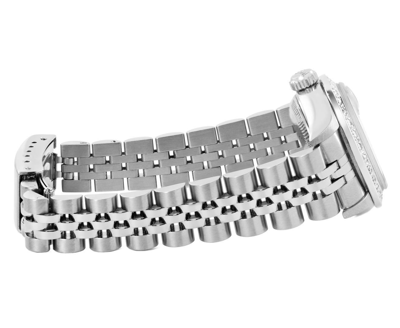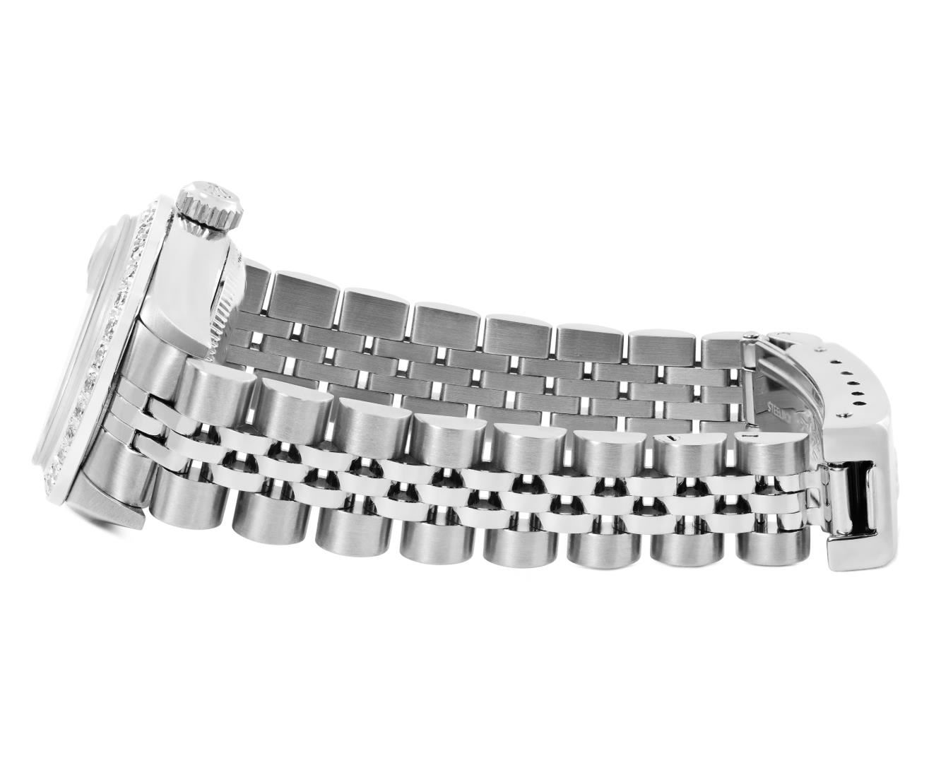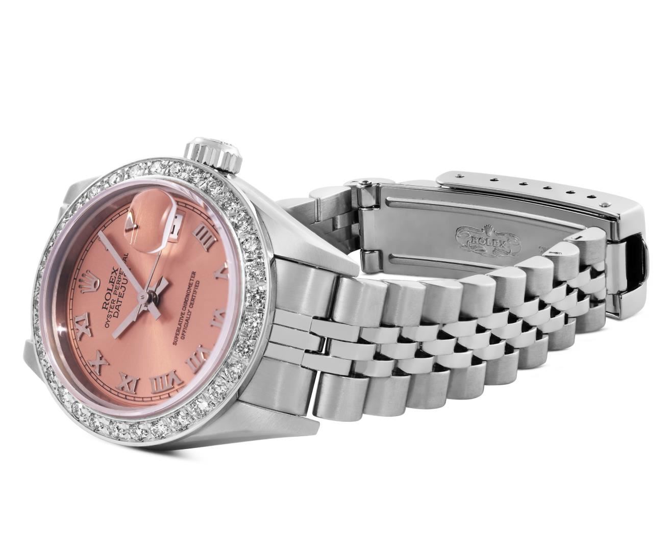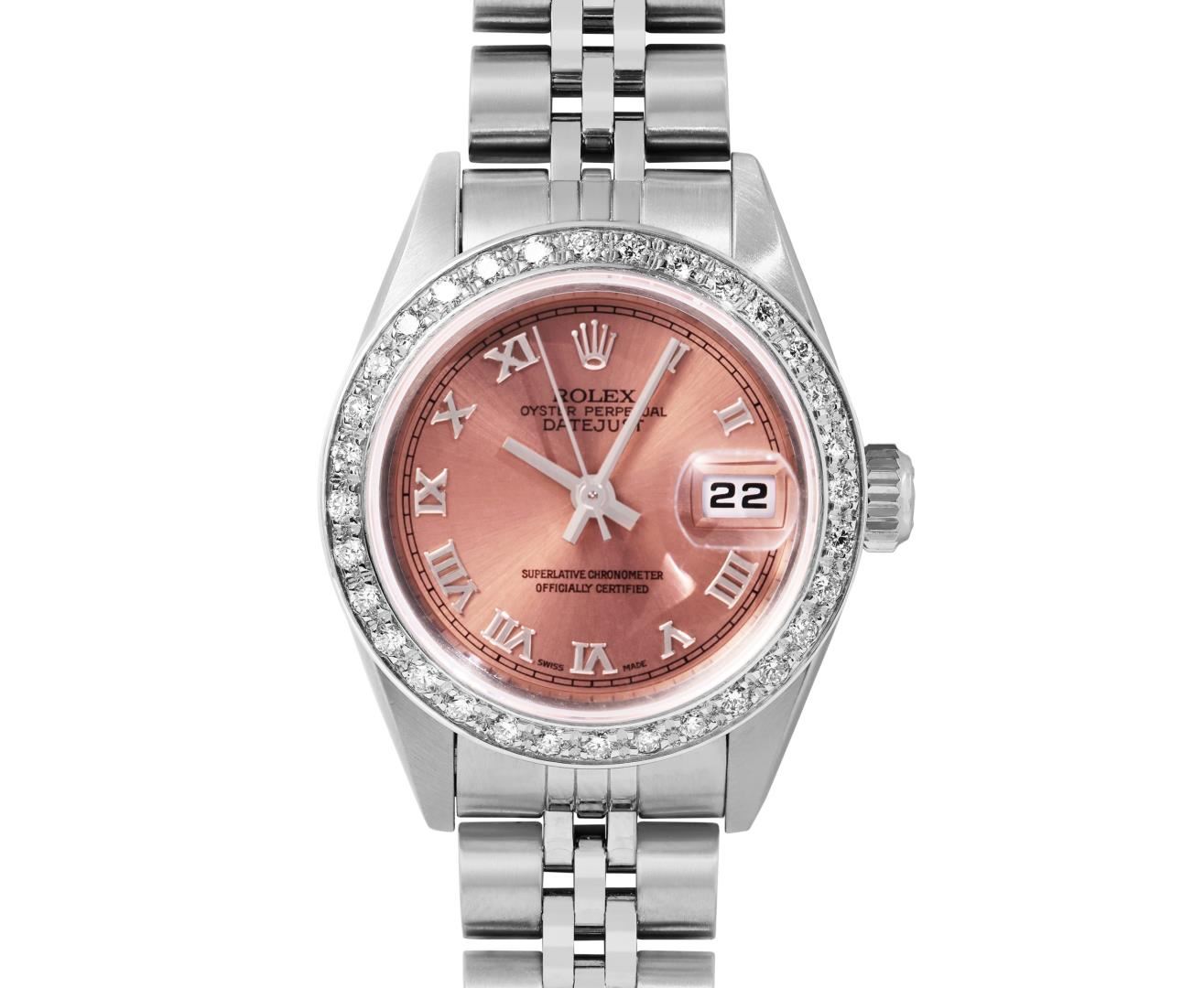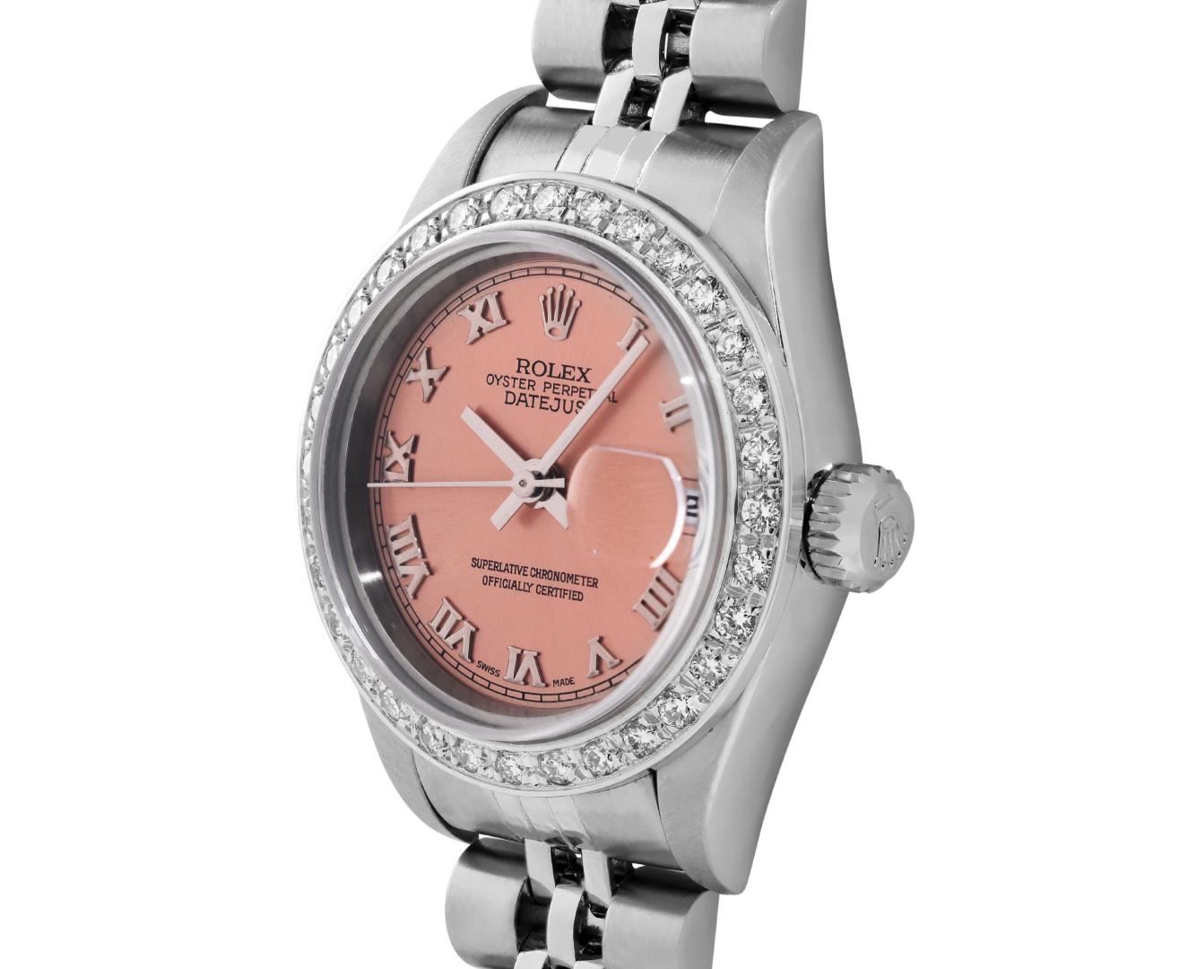 One Rolex Ladies Pre Owned Quickset Stainless Steel Datejust Wristwatch Polished Bright with Satin Finish, Serviced & Electronically Tested, Stainless Steel Case: 26mm, Stainless Steel Crown, Custom Bezel: New 18K White Gold Beadset Diamond Bezel, Diamond Count: 32 Diamonds. Custom Crystal: New Sapphire With Magnified Date Window. Custom Hands: New Luminescent Hands. Rolex Movement: 2235 Automatic Winding Movement. Rolex Dial: Factory Salmon With Roman Hour Markers, and Square Track. Date Window: 3 O'clock Position Date Display, Model: Quickset Datejust. Condition: G-6 Extra Fine. Rolex Bracelet: Stainless Steel Jubilee Band. Bright Polish & Satin Finish. 6.0 Inch Length, Adjustable. Standard Clasp, With Rolex Logo. This Watch Has Been Serviced Time Tested And Is In Excellent Condition. It Is Free Of All Scratches And Dents.