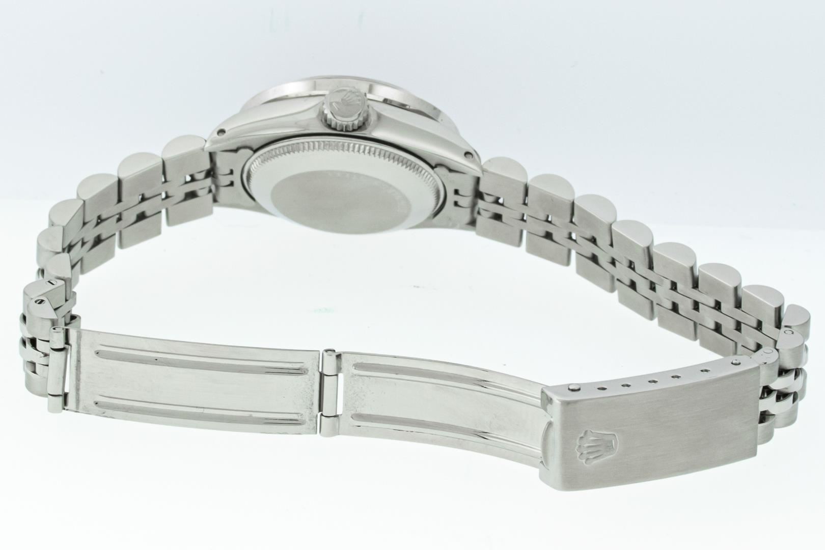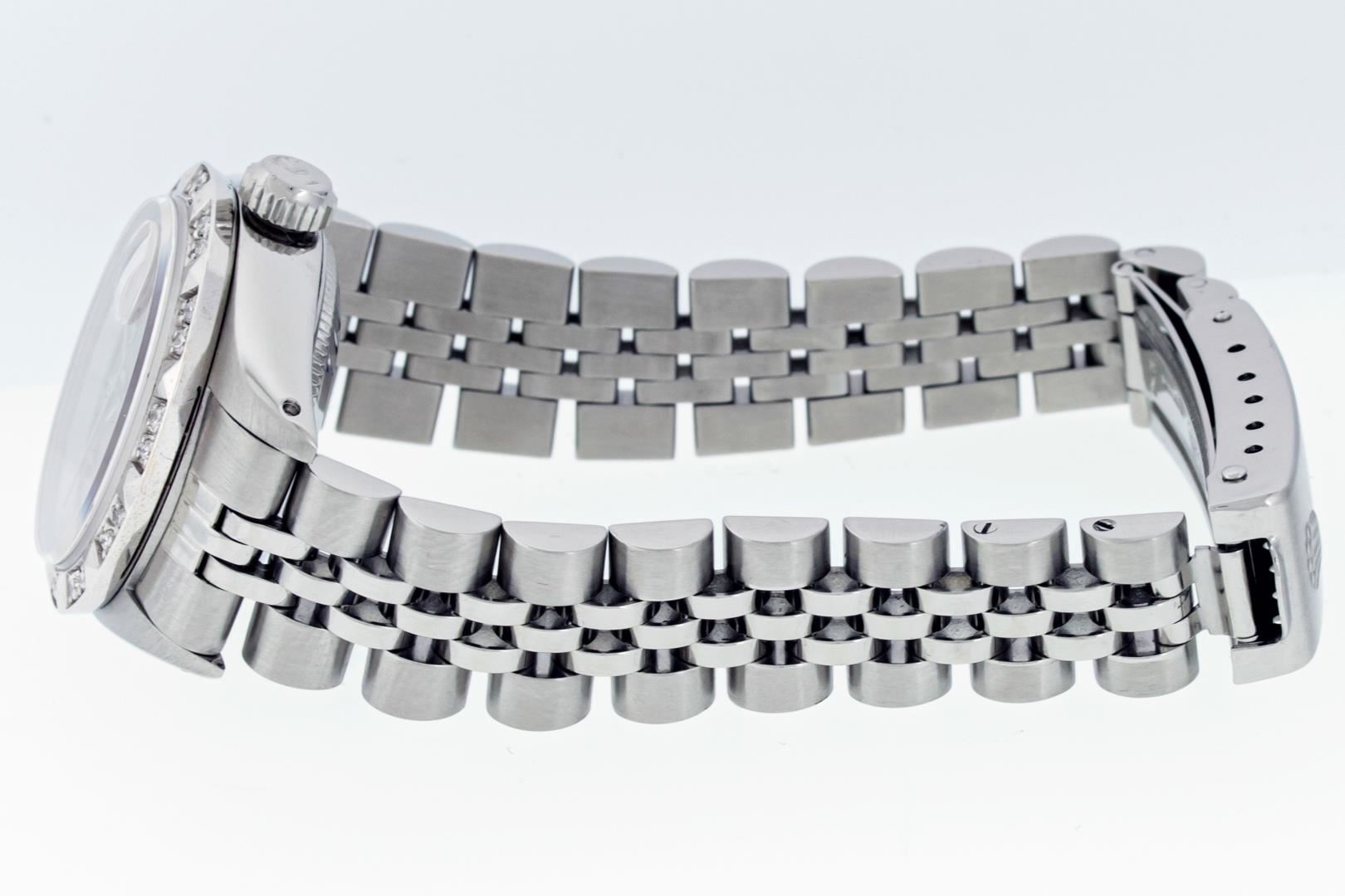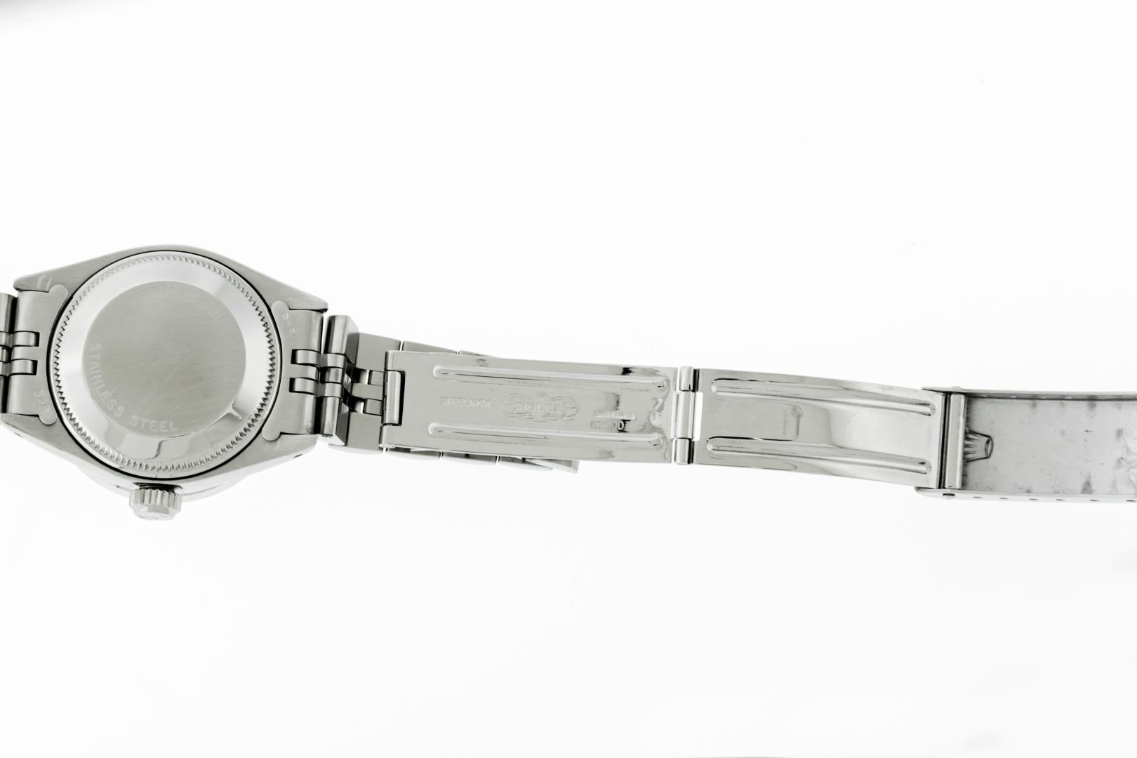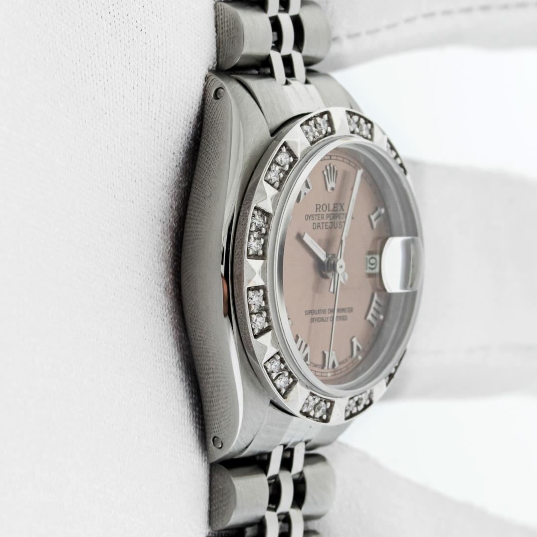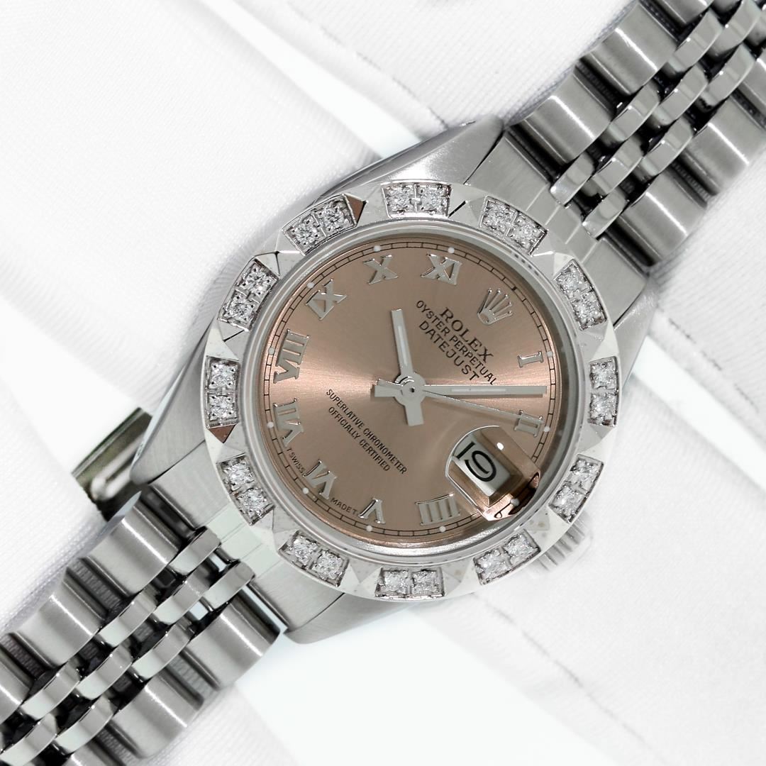 One Ladies Pre Owned Stainless Steel Quickset Rolex Datejust Polished Bright with Satin Finish, Serviced & Electronically Tested, Stainless Steel Case: 26mm, Stainless Steel Crown, Custom Bezel: New 18K White Gold Pyramid Diamond Bezel, Diamond Count: 24 Diamonds On Bezel. Total Weight .50 Carat, Clarity: SI-VS, Color: G to H. Custom Crystal: New Sapphire With Magnified Date Window. Custom Hands: New Luminescent Hands. Rolex Movement: Automatic Winding Movement. Rolex Dial: Salmon Roman Dial With Square Track. Date Window: 3 O'Clock Position Date Display, Model: Datejust. Condition: G-6 Extra Fine. Rolex Bracelet: Stainless Steel Jubilee Band With Rolex Crown On Buckle. Bright Polish & Satin Finish. Band Length: 6.0 Inch Length, Adjustable. Standard Clasp, With Rolex Logo. This Watch Has Been Serviced Time Tested And Is In Excellent Condition It Is Free Of All Scratches And Dents. This Watch Comes With A Rolex Box.