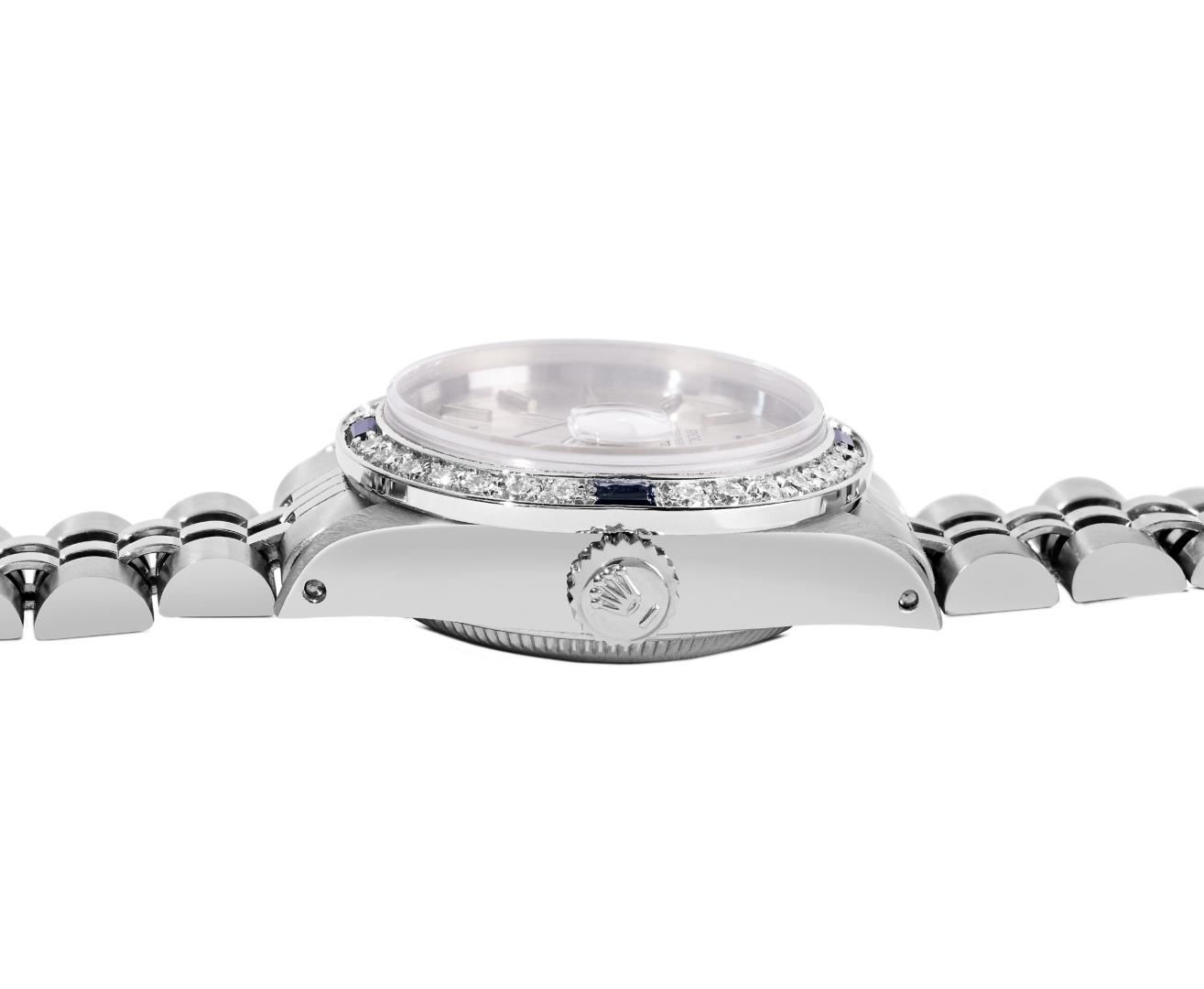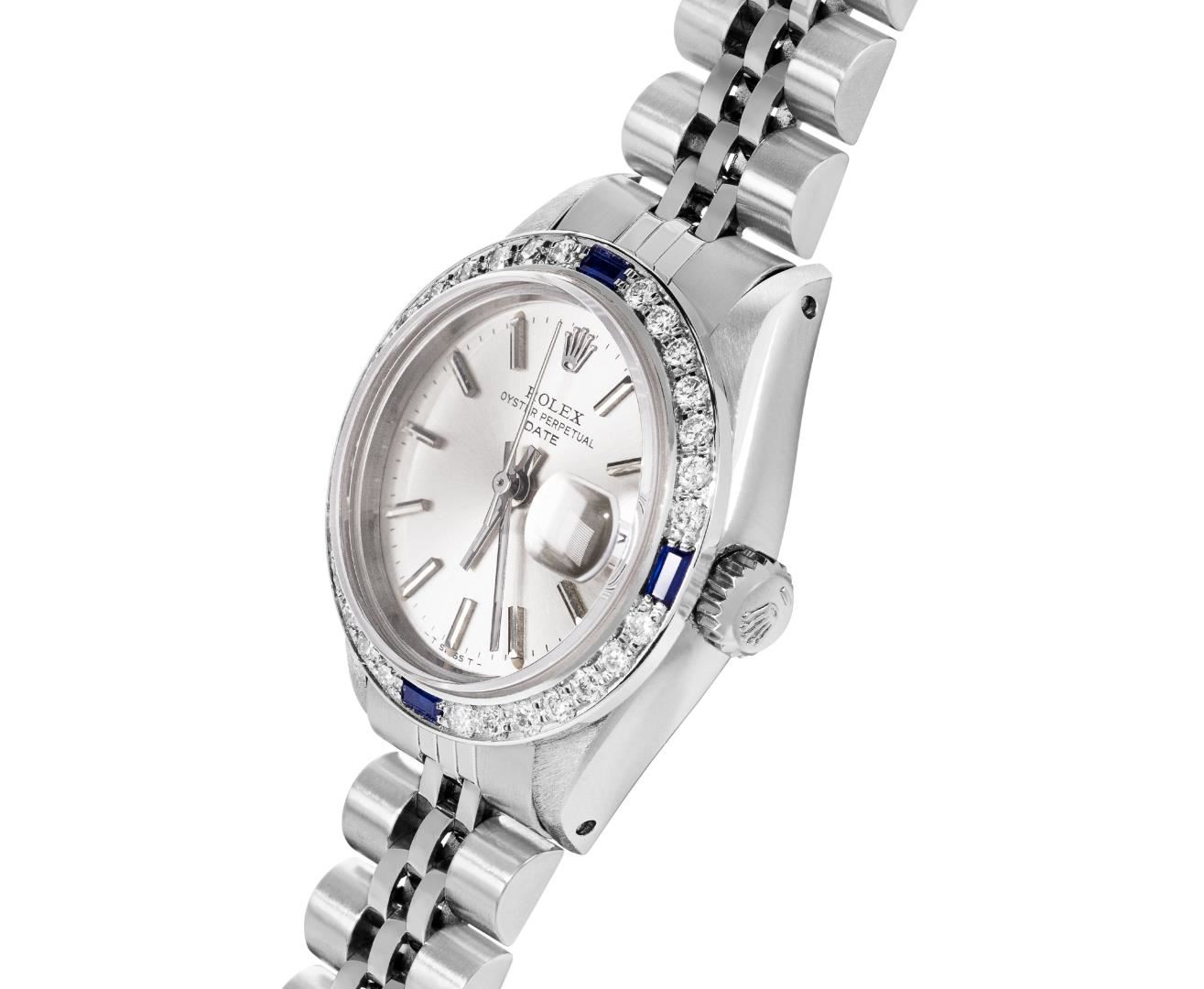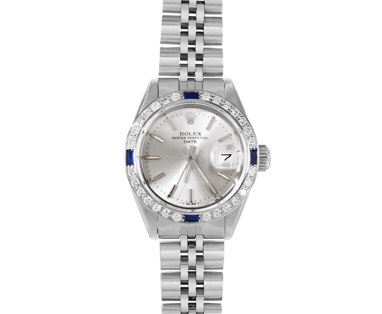 One Rolex Ladies Pre Owned Stainless Steel Date Wristwatch Polished Bright with Satin Finish, Serviced & Electronically Tested, Stainless Steel Case: 26mm, Stainless Steel Crown, Custom Bezel: New 18K White Gold Sapphire Beadset Diamond Bezel, Diamond + Gem Count: 36 Diamonds + 4 Sapphires, Clarity: SI-VS, Color: G to H. Custom Crystal: New Sapphire With Magnified Date Window. Custom Hands: New Luminescent Hands. Rolex Movement: Automatic Winding Movement 2030. Rolex Dial: Factory Silver Dial With Index Hour Markers Dash Track, and Lumi Dots. Date Window: 3 O'Clock Position Date Display, Model: Date. Condition: G-6 Extra Fine. Rolex Bracelet: Stainless Steel Jubilee Band. Bright Polish & Satin Finish. 6.0 Inch Length, Adjustable. Standard Clasp, With Rolex Logo. This Watch Has Been Serviced Time Tested And Is In Excellent Condition. It Is Free Of All Scratches And Dents. This Watch Comes With A Rolex Box.