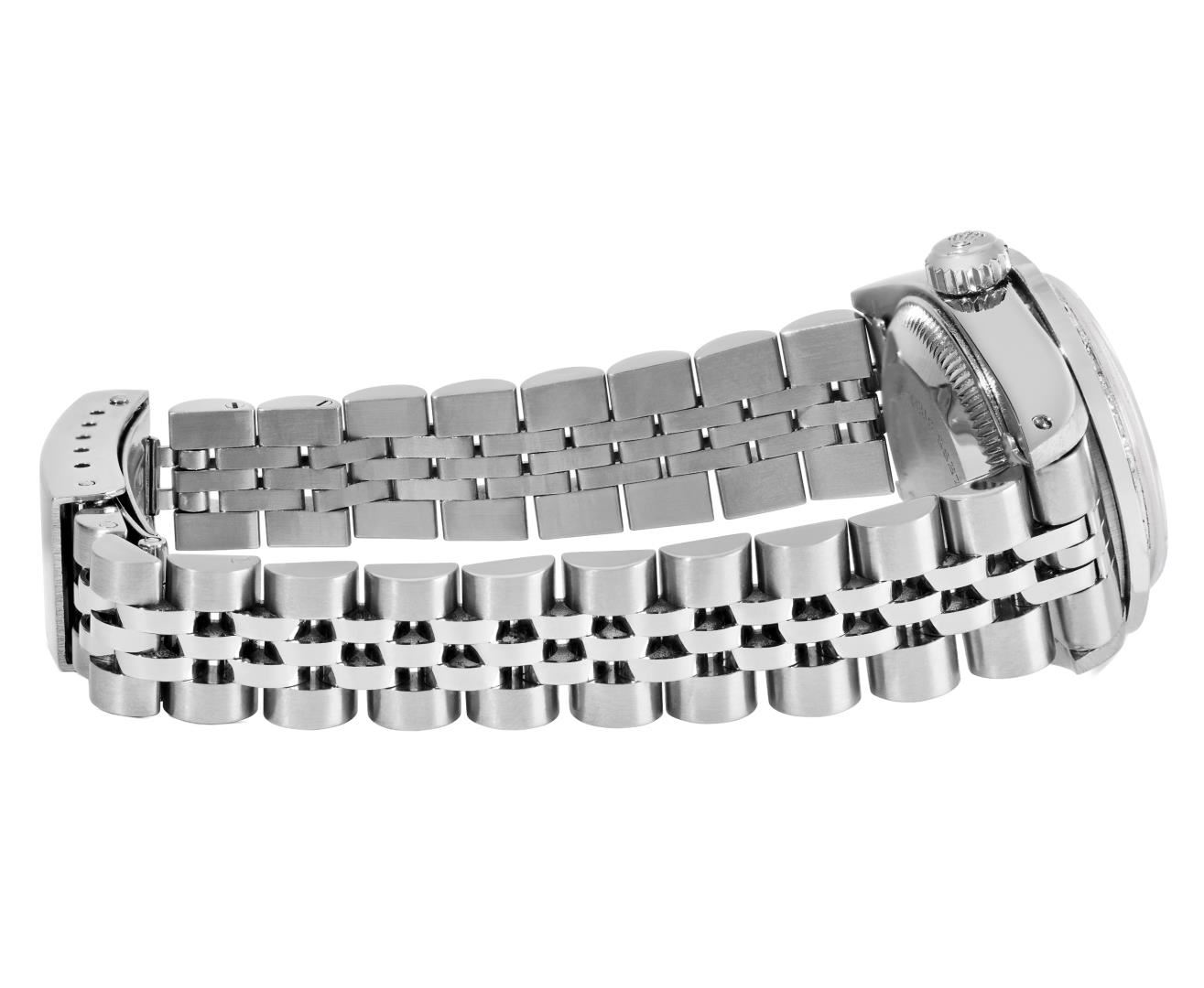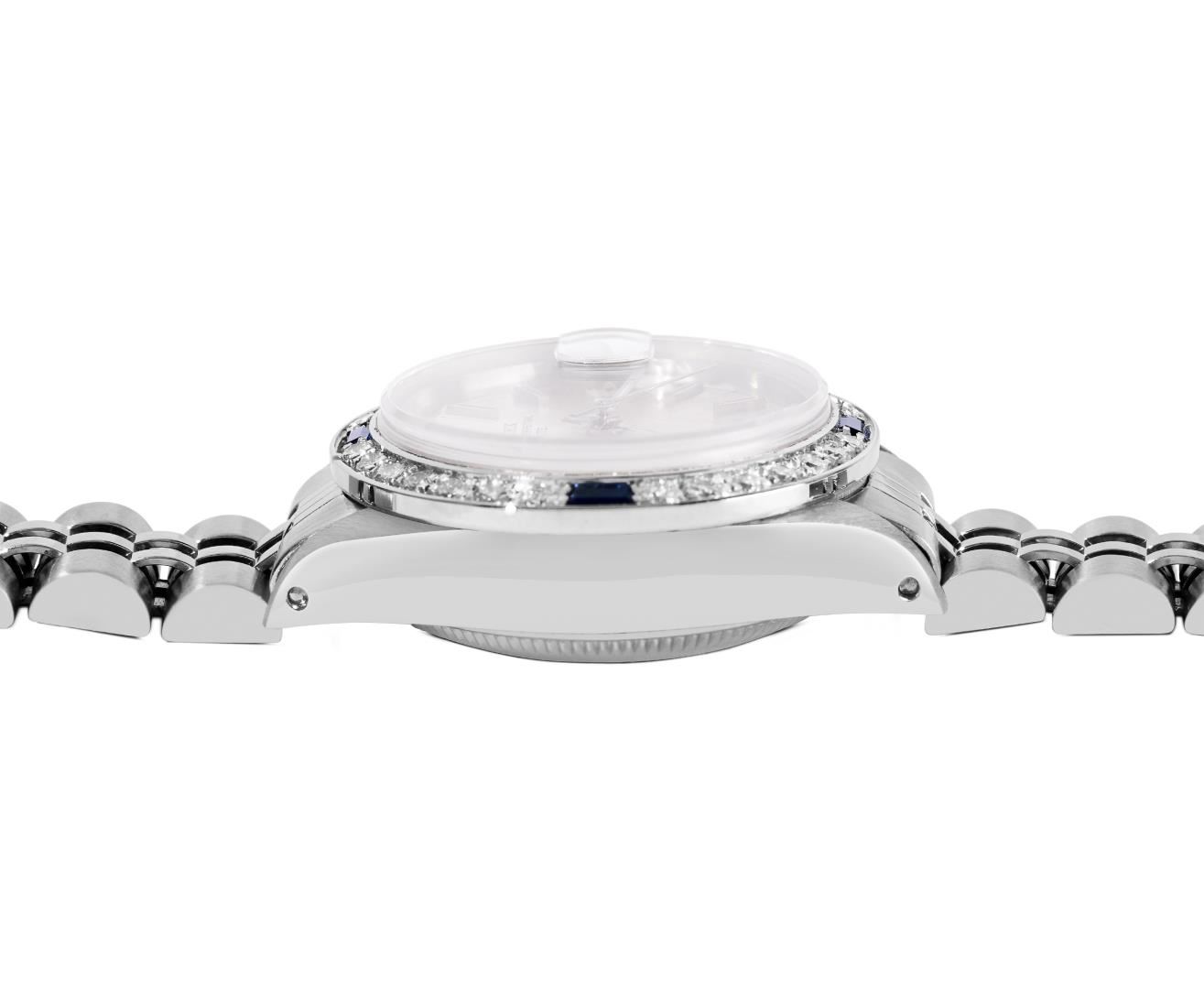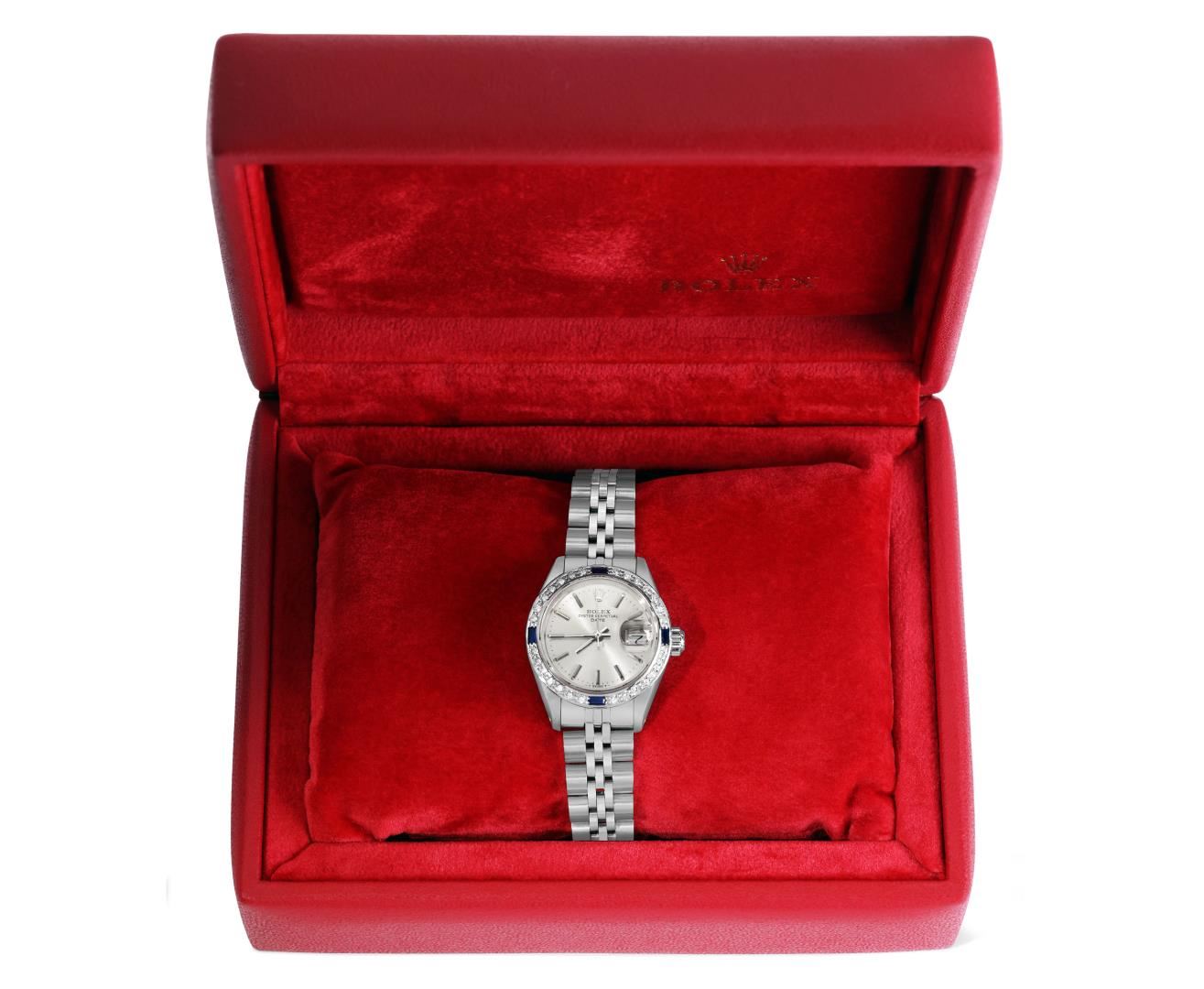 One Rolex Ladies Pre Owned Stainless Steel Date Wristwatch Polished Bright with Satin Finish, Serviced & Electronically Tested, Stainless Steel Case: 26mm, Stainless Steel Crown, Custom Bezel: New 18K White Gold Sapphire Beadset Diamond Bezel, Diamond + Gem Count: 36 Diamonds + 4 Sapphires, Clarity: SI-VS, Color: G to H. Custom Crystal: New Sapphire With Magnified Date Window. Custom Hands: New Luminescent Hands. Rolex Movement: Automatic Winding Movement 2030. Rolex Dial: Factory Silver Dial With Index Hour Markers Dash Track, and Lumi Dots. Date Window: 3 O'Clock Position Date Display, Model: Date. Condition: G-6 Extra Fine. Rolex Bracelet: Stainless Steel Jubilee Band. Bright Polish & Satin Finish. 6.0 Inch Length, Adjustable. Standard Clasp, With Rolex Logo. This Watch Has Been Serviced Time Tested And Is In Excellent Condition. It Is Free Of All Scratches And Dents. This Watch Comes With A Rolex Box.