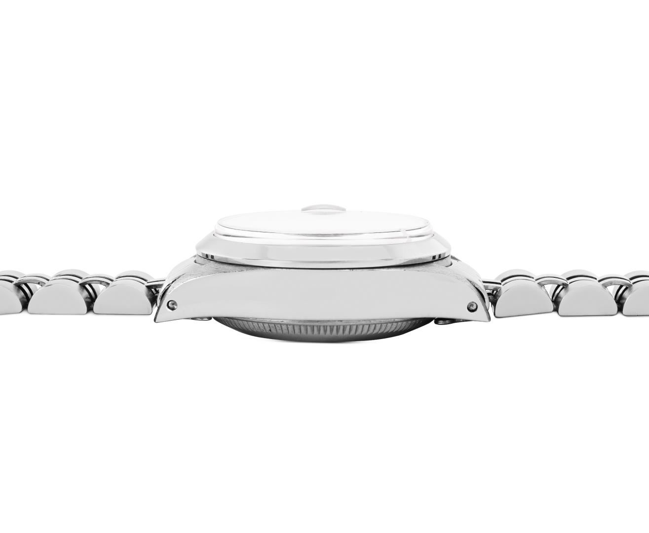One Rolex Ladies Pre Owned Stainless Steel Date Wristwatch Polished Bright with Satin Finish, Serviced and Electronically Tested, Stainless Steel Case: 26mm, Stainless Steel Crown, Custom Bezel: New 18K White Gold Sapphire Beadset Diamond Bezel, Diamond + Gem Count: 36 Diamonds + 4 Sapphires. Custom Crystal: New Sapphire With Magnified Date Window. Rolex Movement: Automatic Winding Movement 2035. Custom Dial: Custom Black Dial With Added Diamond Hour Markers, Dash Tracks, And Lumi Dots. Date Window: 3 O'Clock Position Date Display, Model: Date. Condition: G-6 Extra Fine. Rolex Bracelet: Stainless Steel Jubilee Band. Bright Polish and Satin Finish. 6.0 Inch Length, Adjustable. Standard Clasp, With Rolex Logo. This Watch Has Been Serviced Time Tested And Is In Excellent Condition. It Is Free Of All Scratches And Dents. This Watch Comes With A Rolex Box.