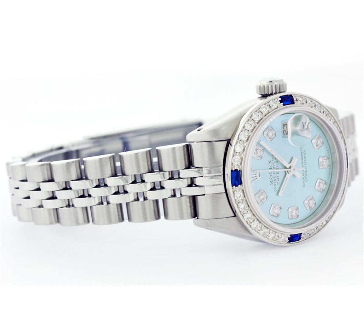 One Womens Rolex Datejust Polished Bright with Satin Finish, Serviced & Electronically Tested, Stainless Steel Case:26mm, Stainless Steel Crown, Custom Bezel: 18K White Gold Sapphire Beadset Diamond Bezel, Diamond + Gem Count: 28 Diamonds + 4 Sapphires Total Weight .70 Carat, Clarity: SI-VS, Color: G to H. Custom Crystal: Synthetic Sapphire Cyclops Lens. Movement: Automatic Winding Movement Caliber 2135. Custom Dial: Ice Blue Diamond Dial, Diamond Count: 10 Diamonds, Clarity: SI-VS, Color:G to H. Date Window: 3 O'Clock Position Date Display, Quickset, Model: Datejust, Condition: G-6 Extra Fine. Bracelet:Stainless Steel Jubilee. Bright Polish & Satin Finish. 5.5 Inch Length, Adjustable. Standard Clasp, With Rolex Logo.