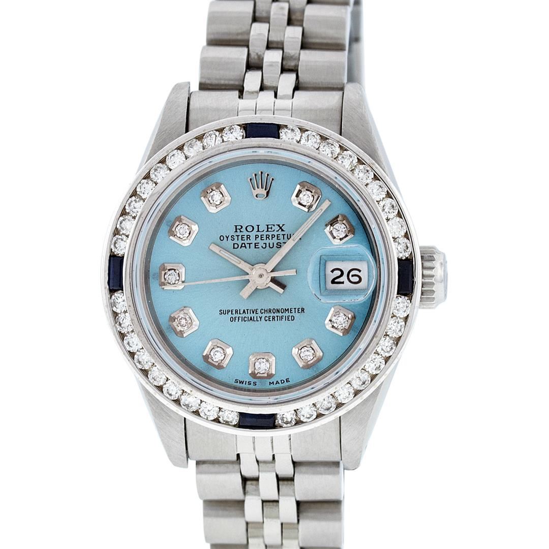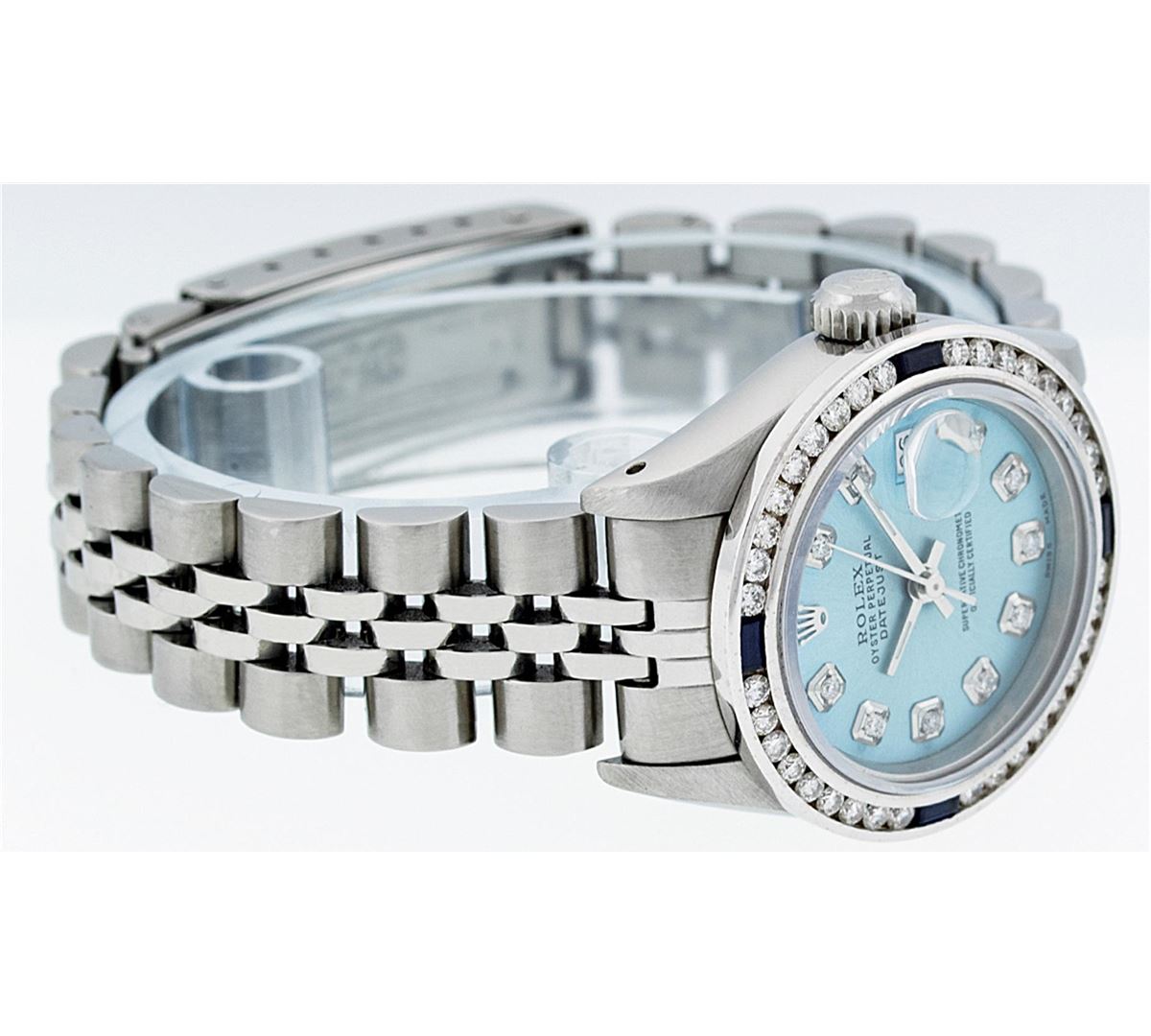 One Ladies Rolex Datejust Polished Bright with Satin Finish, Serviced & Electronically Tested, Stainless Steel Case:26mm, Stainless Steel Crown, Custom Bezel: 18K White Gold Sapphire Channel Set Diamond Bezel, Diamond + Gem Count: 36 Diamonds + 4 Sapphires Total Weight 1.00 Carat, Clarity: SI-VS, Color: G to H. Custom Crystal: Synthetic Sapphire Cyclops Lens. Movement: Automatic Winding Movement Caliber 2030. Custom Dial: Ice Blue Diamond Dial, Diamond Count: 10 Diamonds, Clarity: SI-VS, Color:G to H. Date Window: 3 O'Clock Position. Date Display, Model: Datejust, Condition: G-6 Extra Fine. Bracelet:Stainless Steel Jubilee. Bright Polish & Satin Finish. 6.0 Inch Length, Adjustable. Standard Clasp, With Rolex Logo.