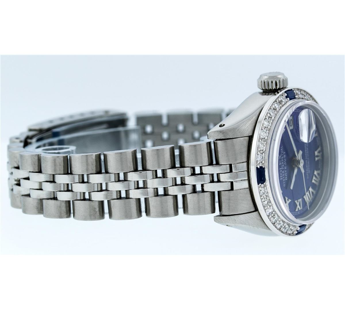 One Ladies Rolex Datejust Polished Bright with Satin Finish, Serviced & Electronically Tested, Stainless Steel Case:26mm, Stainless Steel Crown, Custom Bezel: 18K White Gold Sapphire Beadset Diamond Bezel, Diamond + Gem Count: 28 Diamonds + 4 Sapphires Total Weight .70 Carat, Clarity: SI-VS, Color: G to H. Custom Crystal: Synthetic Sapphire Cyclops Lens. Movement: Automatic Winding Movement Caliber 2030. Custom Dial: Refinished Blue Roman Dial With Square Track. Date Window: 3 O'Clock Position Date Display, Model: Datejust. Condition: G-6 Extra Fine. Bracelet: Stainless Steel Jubilee. Bright Polish & Satin Finish. 6.0 Inch Length, Adjustable. Standard Clasp, With Rolex Logo.