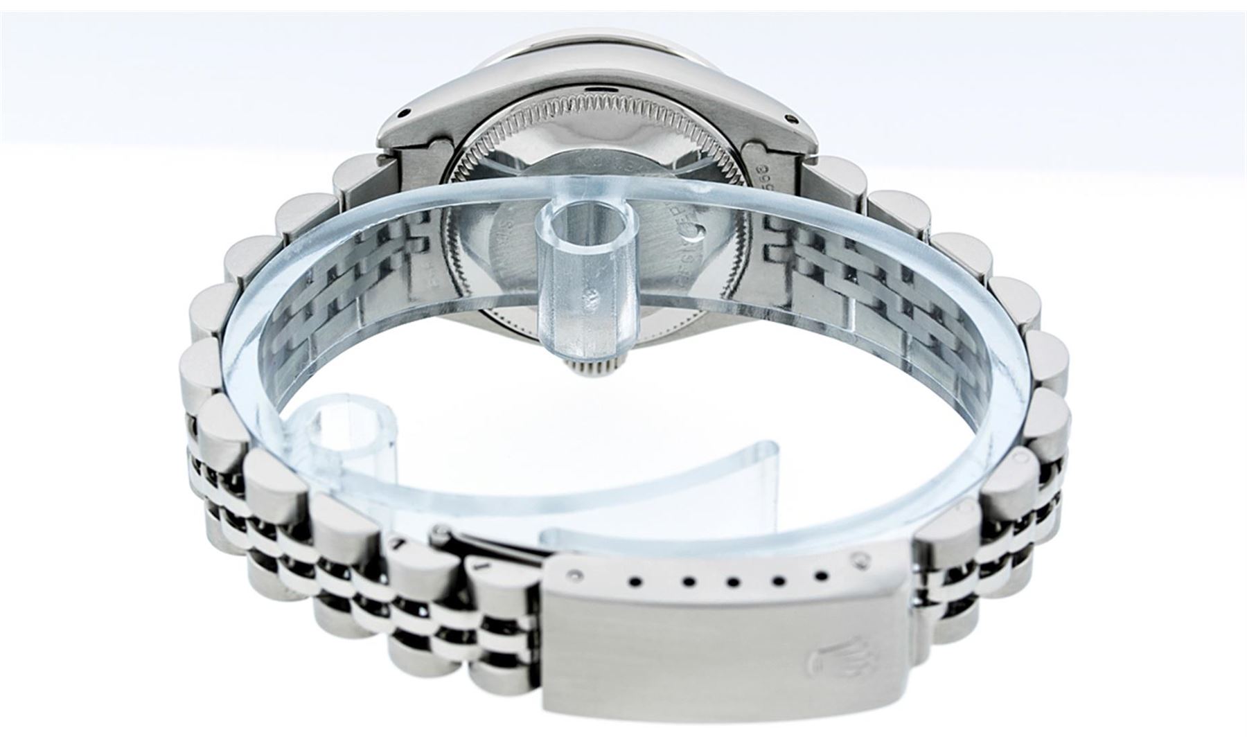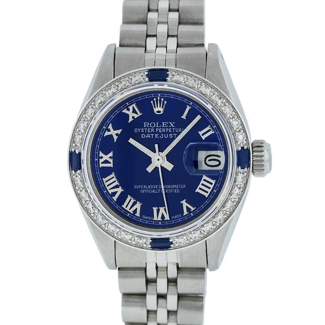 One Ladies Rolex Datejust Polished Bright with Satin Finish, Serviced & Electronically Tested, Stainless Steel Case:26mm, Stainless Steel Crown, Custom Bezel: 18K White Gold Sapphire Beadset Diamond Bezel, Diamond + Gem Count: 28 Diamonds + 4 Sapphires Total Weight .70 Carat, Clarity: SI-VS, Color: G to H. Custom Crystal: Synthetic Sapphire Cyclops Lens. Movement: Automatic Winding Movement Caliber 2030. Custom Dial: Refinished Blue Roman Dial With Square Track. Date Window: 3 O'Clock Position Date Display, Model: Datejust. Condition: G-6 Extra Fine. Bracelet: Stainless Steel Jubilee. Bright Polish & Satin Finish. 6.0 Inch Length, Adjustable. Standard Clasp, With Rolex Logo.