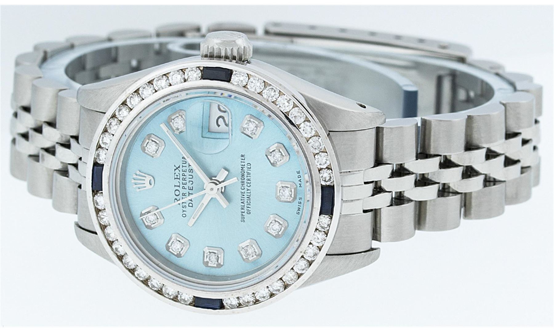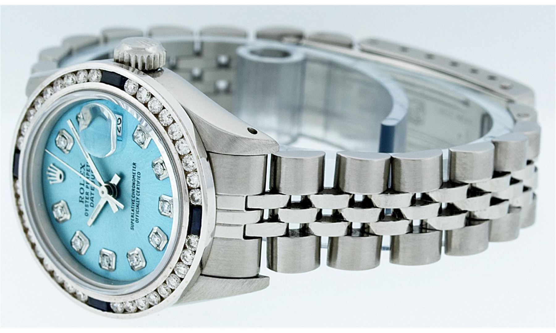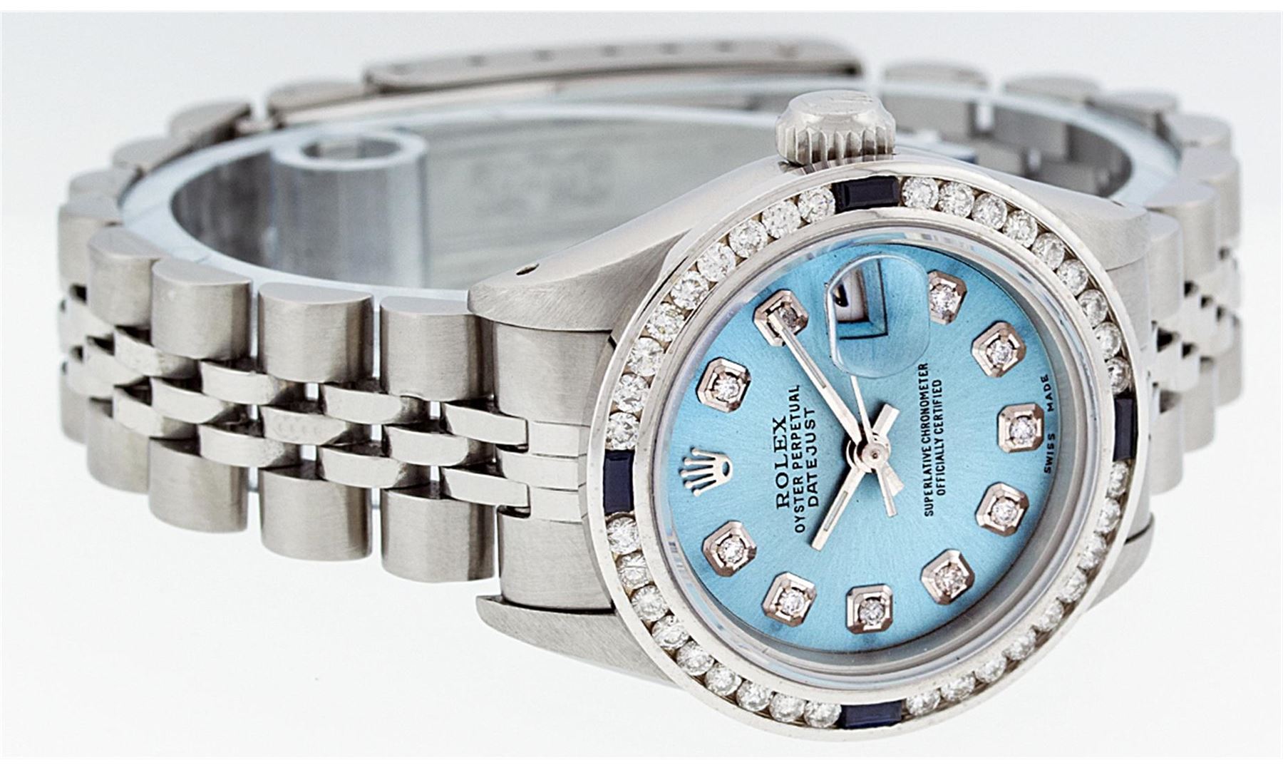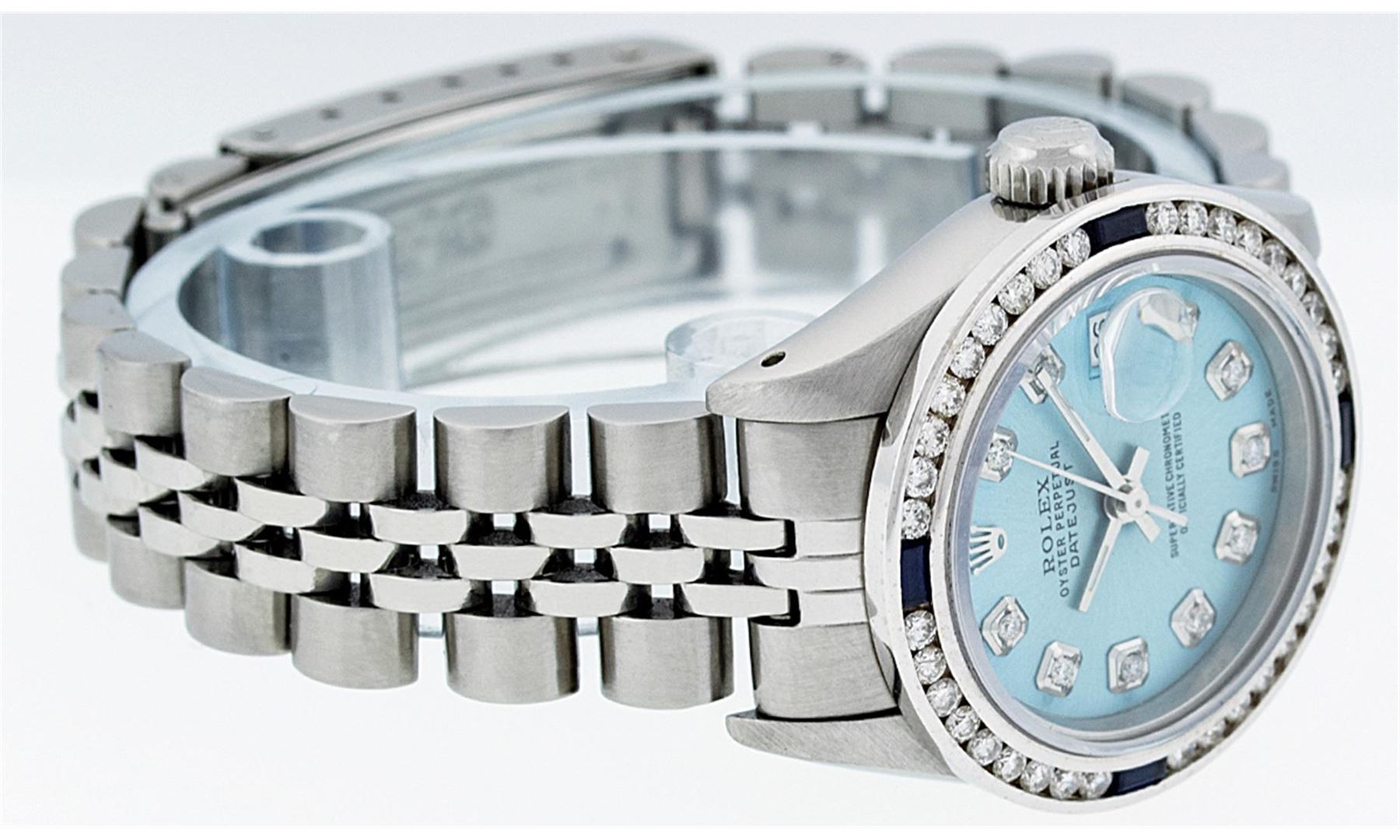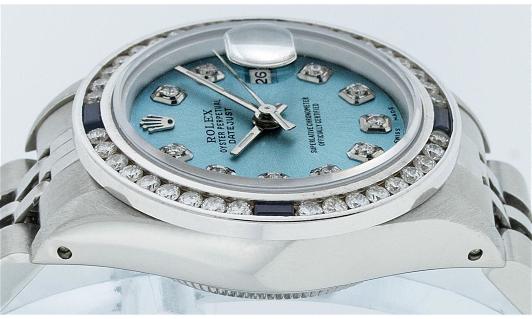 One Ladies Rolex Datejust Polished Bright with Satin Finish, Serviced & Electronically Tested, Stainless Steel Case:26mm, Stainless Steel Crown, Custom Bezel: 18K White Gold Sapphire Channel Set Diamond Bezel, Diamond + Gem Count: 36 Diamonds + 4 Sapphires Total Weight 1.00 Carat, Clarity: SI-VS, Color: G to H. Custom Crystal: Synthetic Sapphire Cyclops Lens. Movement: Automatic Winding Movement Caliber 2030. Custom Dial: Ice Blue Diamond Dial, Diamond Count: 10 Diamonds, Clarity: SI-VS, Color:G to H. Date Window: 3 O'Clock Position. Date Display, Model: Datejust, Condition: G-6 Extra Fine. Bracelet:Stainless Steel Jubilee. Bright Polish & Satin Finish. 6.0 Inch Length, Adjustable. Standard Clasp, With Rolex Logo.