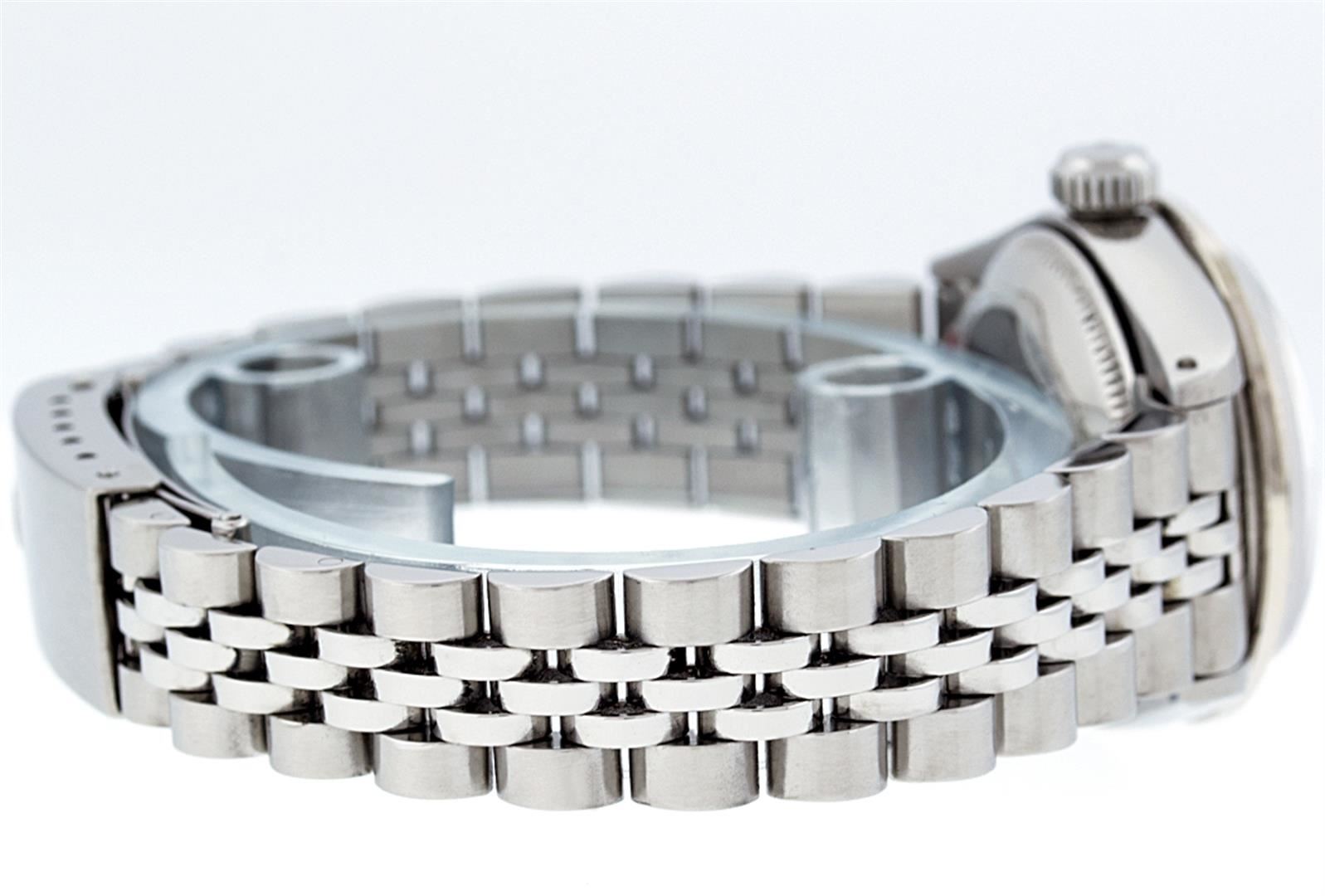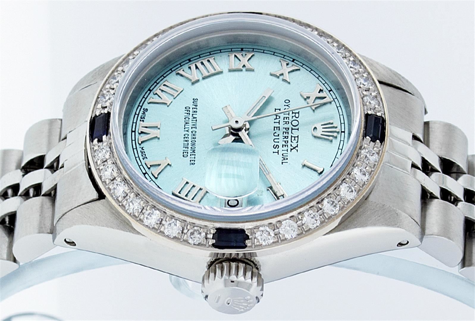 One Ladies Rolex Datejust Polished Bright with Satin Finish, Serviced & Electronically Tested, Stainless Steel Case:26mm, Stainless Steel Crown, Custom Bezel: 18K White Gold Sapphire Beadset Diamond Bezel, Diamond + Gem Count: 28 Diamonds + 4 Sapphires Total Weight .70 Carat, Clarity: Si-VS, Color: G to H. Custom Crystal: Synthetic Sapphire Cyclops Lens. Movement: Automatic Winding Movement Caliber 2030. Custom Dial: Ice Blue Roman Dial. Date Window: 3 O'Clock Position Date Display, Non Quickset, Model: Datejust. Condition: G-6 Extra Fine. Bracelet: Stainless Steel Jubilee. Bright Polish & Satin Finish. 6.0 Inch Length, Adjustable. Standard Clasp, With Rolex Logo.