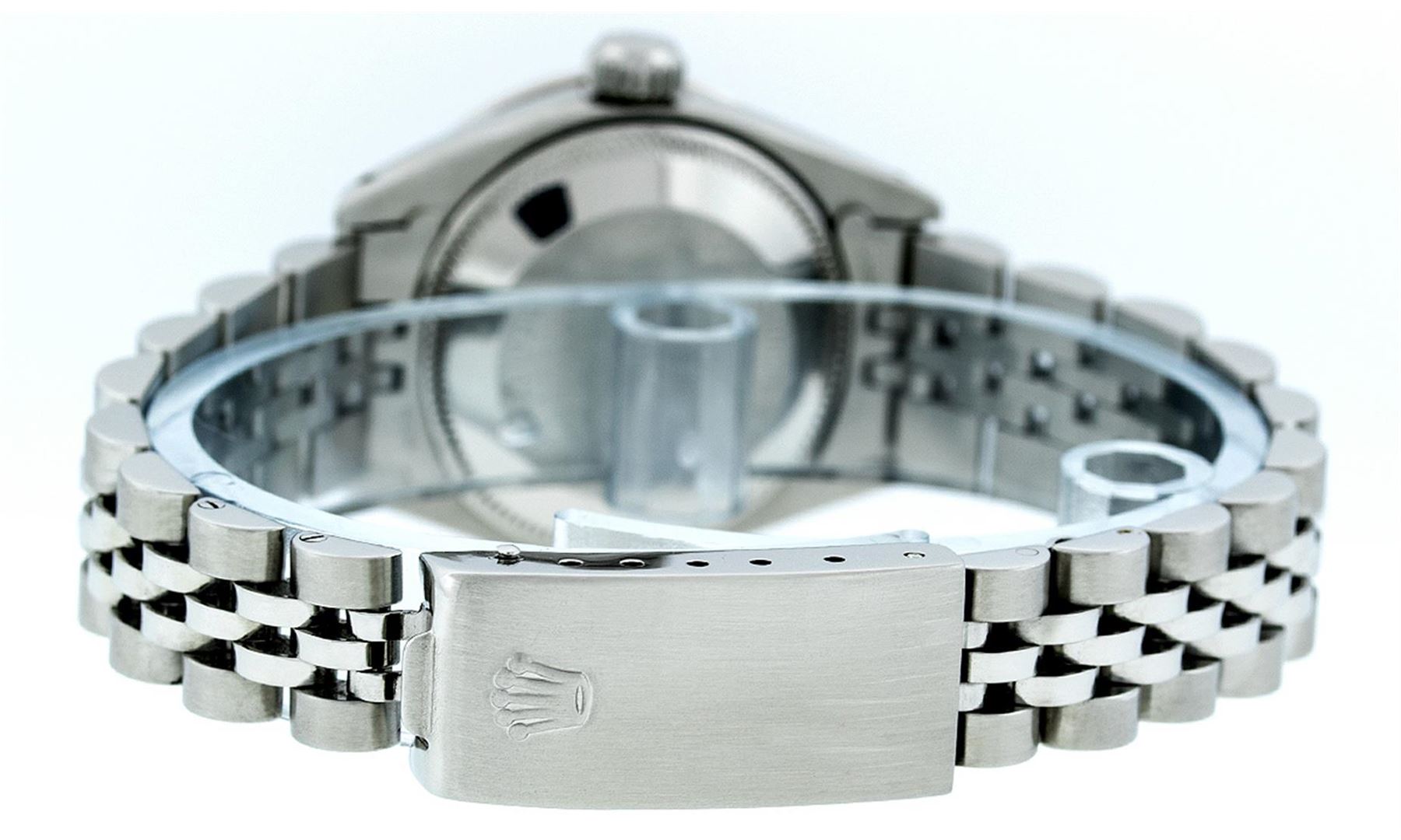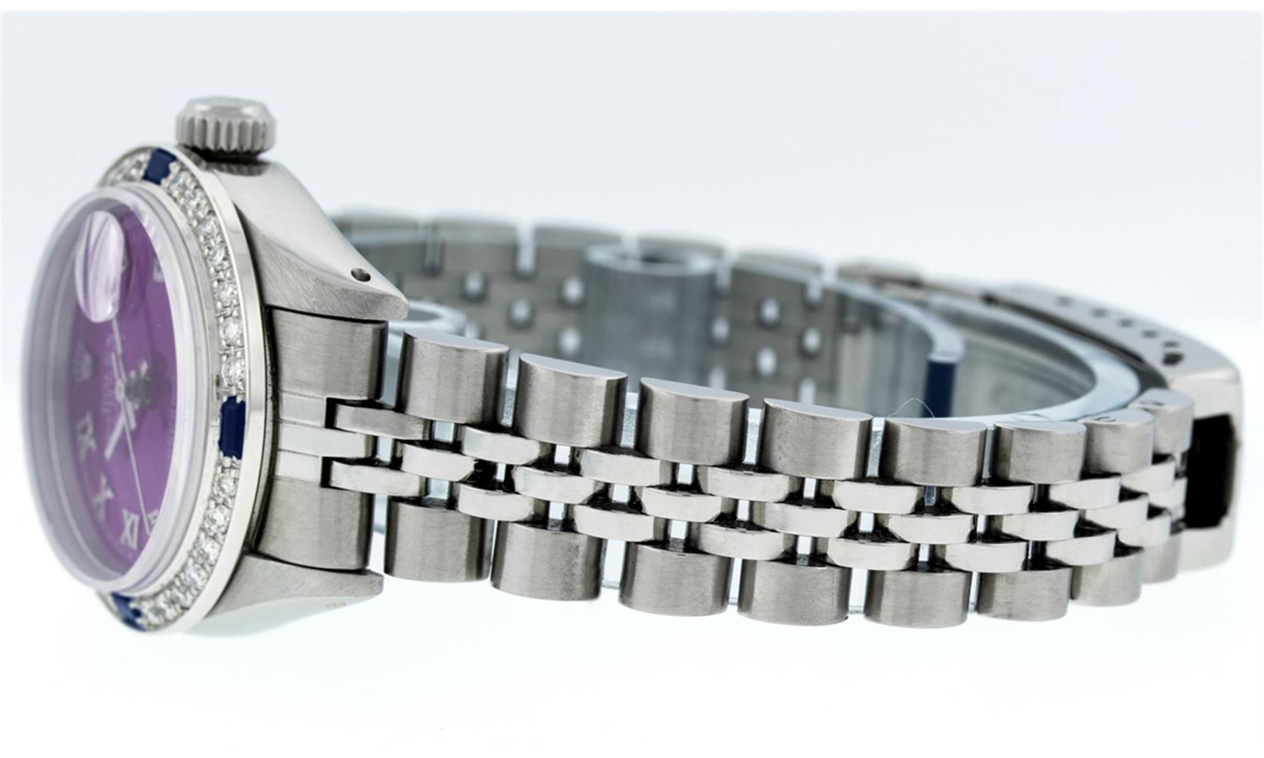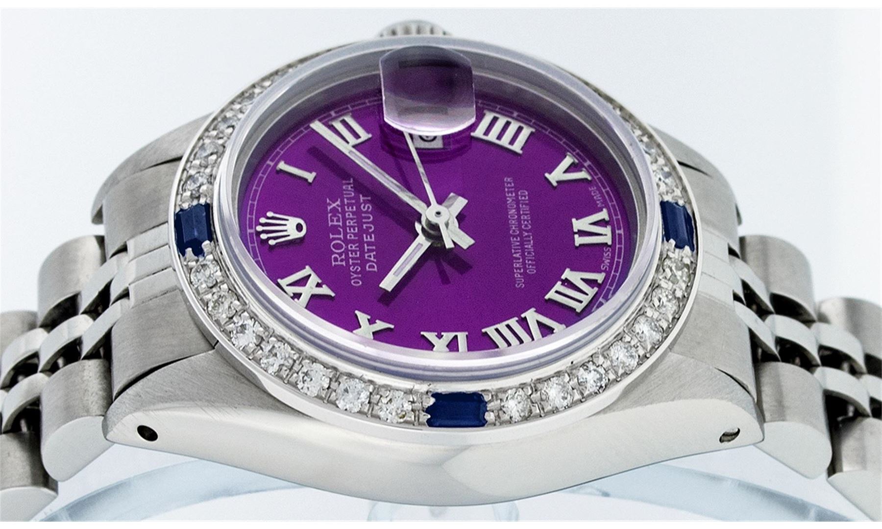 One Ladies Rolex Datejust Polished Bright with Satin Finish, Serviced & Electronically Tested, Stainless Steel Case:26mm, Stainless Steel Crown, Custom Bezel: 18K White Gold Sapphire Beadset Diamond Bezel, Diamond + Gem Count: 28 Diamonds + 4 Sapphires Total Weight .70 Carat, Clarity: SI-VS, Color: G to H. Custom Crystal: Synthetic Sapphire Cyclops Lens. Movement: Automatic Winding Movement Caliber 2030. Custom Dial: Refinished Purple Roman Dial With Square Track. Date Window: 3 O'Clock Position Date Display, Model: Datejust. Condition: G-6 Extra Fine. Bracelet: Stainless Steel Jubilee. Bright Polish & Satin Finish. 6.0 Inch Length, Adjustable. Standard Clasp, With Rolex Logo.