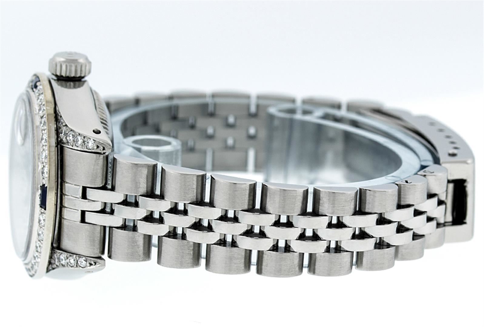 One Ladies Rolex Datejust Polished Bright with Satin Finish, Serviced & Electronically Tested, Stainless Steel Case:26mm, Stainless Steel Crown, Diamond Lugs: 16 Diamonds On Lugs, Clarity: SI-VS, Color: G to H. Custom Bezel: 18K White Gold Sapphire Beadset Bezel, Diamond Count: 28 Diamonds + 4 Sapphires, Total Weight 1.00 Carat, Clarity: SI-VS, Color: G to H. Custom Crystal: Synthetic Sapphire Cyclops Lens. Movement: Automatic Winding Movement Caliber 2030. Custom Dial: Refinished Black With String Diamond Dial, 43 Diamonds in Dial G To H In Color, Clarity: VVS. Date Window: 3 O'Clock Position Date Display, Model: Datejust Condition: G-6 Extra Fine. Bracelet: Stainless Steel Jubilee. Bright Polish & Satin Finish. 6.0 Inch Length, Adjustable. Standard Clasp, With Rolex Logo.