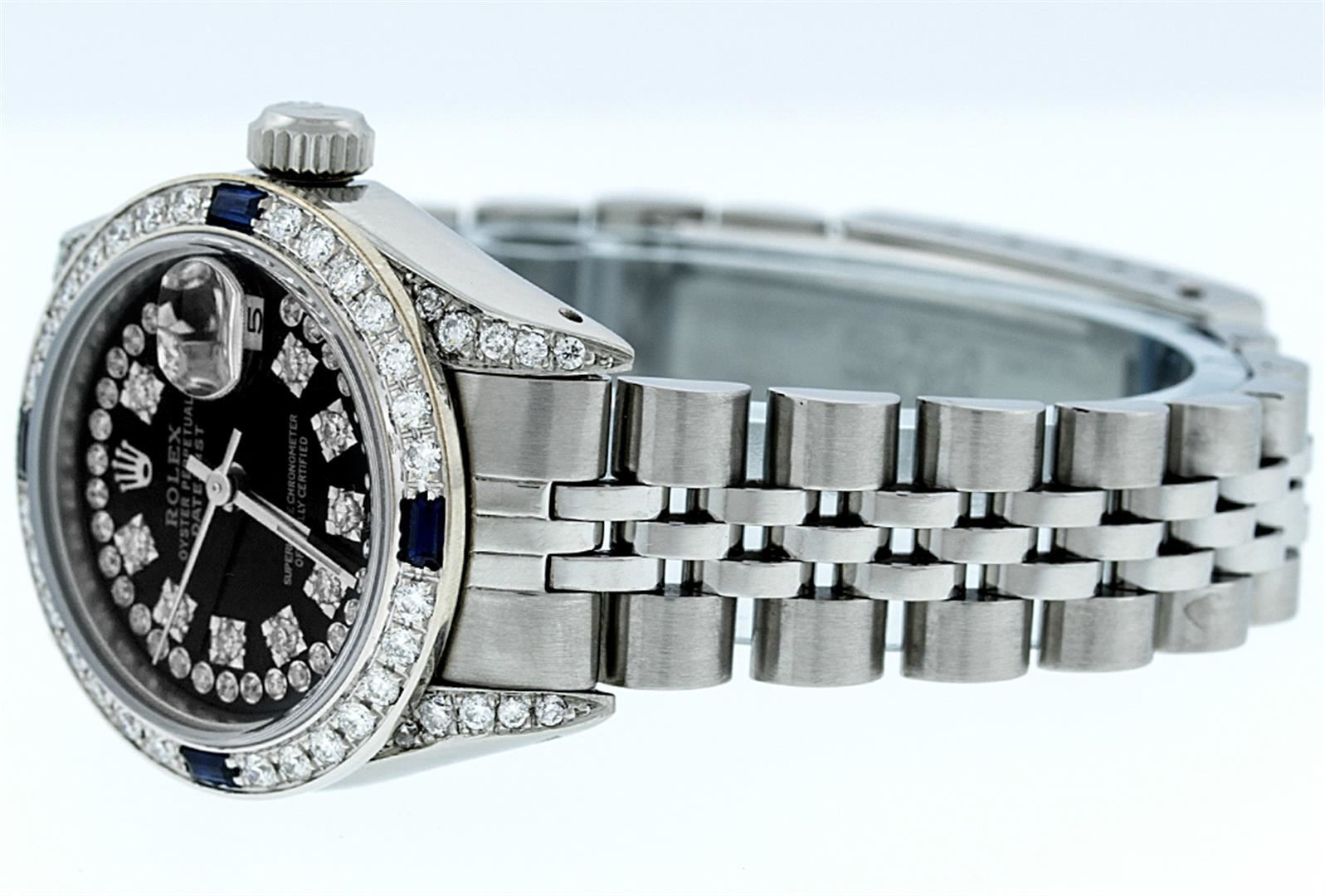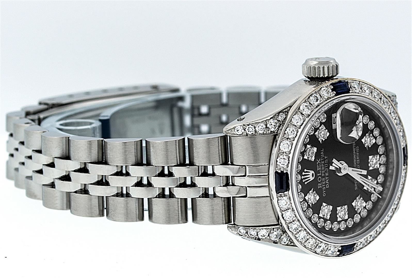 One Ladies Rolex Datejust Polished Bright with Satin Finish, Serviced & Electronically Tested, Stainless Steel Case:26mm, Stainless Steel Crown, Diamond Lugs: 16 Diamonds On Lugs, Clarity: SI-VS, Color: G to H. Custom Bezel: 18K White Gold Sapphire Beadset Bezel, Diamond Count: 28 Diamonds + 4 Sapphires, Total Weight 1.00 Carat, Clarity: SI-VS, Color: G to H. Custom Crystal: Synthetic Sapphire Cyclops Lens. Movement: Automatic Winding Movement Caliber 2030. Custom Dial: Refinished Black With String Diamond Dial, 43 Diamonds in Dial G To H In Color, Clarity: VVS. Date Window: 3 O'Clock Position Date Display, Model: Datejust Condition: G-6 Extra Fine. Bracelet: Stainless Steel Jubilee. Bright Polish & Satin Finish. 6.0 Inch Length, Adjustable. Standard Clasp, With Rolex Logo.
