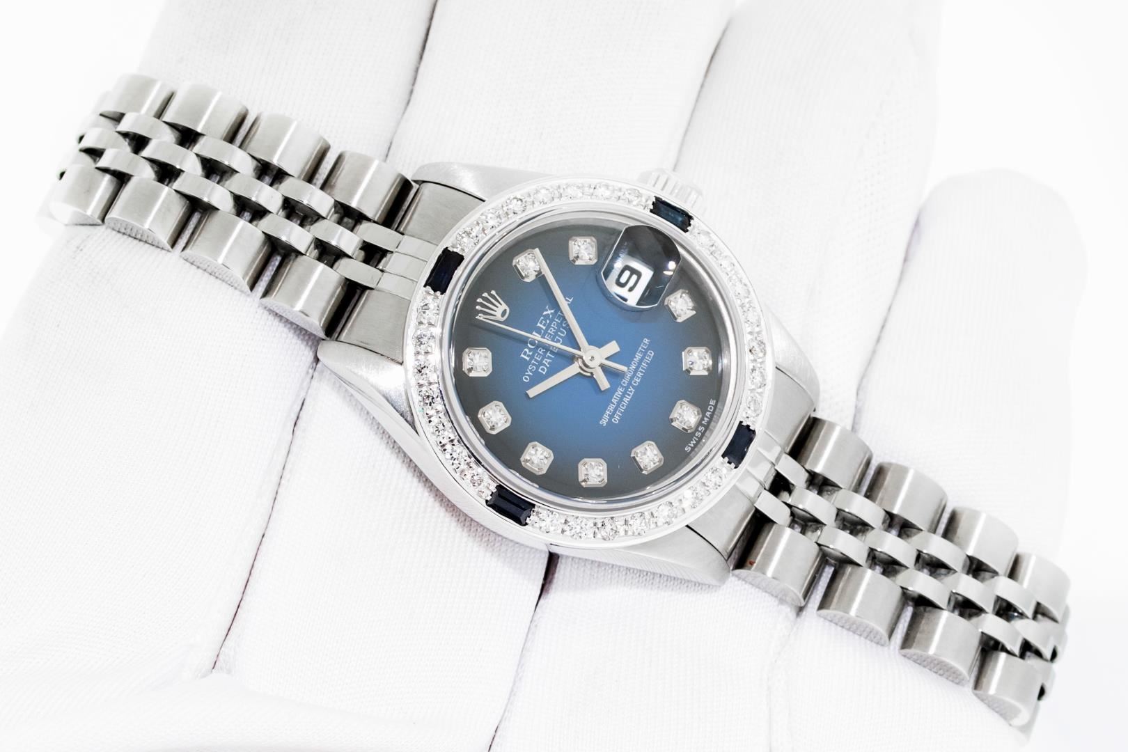 One Ladies Pre Owned Quickset Stainless Steel Rolex Datejust Polished Bright with Satin Finish, Serviced & Electronically Tested, Stainless Steel Case: 26mm, Rolex Stainless Steel Crown, Custom Bezel: New 18K White Gold Sapphire Bead Set Diamond Bezel, Diamond + Gem Count: 28 Diamonds + 4 Sapphires. Custom Crystal: New Sapphire With Magnified Date Window. Custom Hands: New Hands. Rolex Movement: Automatic Winding Movement 2235. Custom Dial: Blue Vignette With Added Diamond Hour Markers, Diamond Count: 10 Diamonds On Dial. Date Window: 3 O'Clock Position Date Display, Model: Quickset Datejust. Condition: G-6 Extra Fine. Rolex Bracelet: Stainless Steel Jubilee Band. Bright Polish & Satin Finish. 6.0 Inch Length, Adjustable. Standard Clasp, With Rolex Logo. This Watch Has Been Serviced Time Tested And Is In Excellent Condition It Is Free Of All Scratches And Dents.