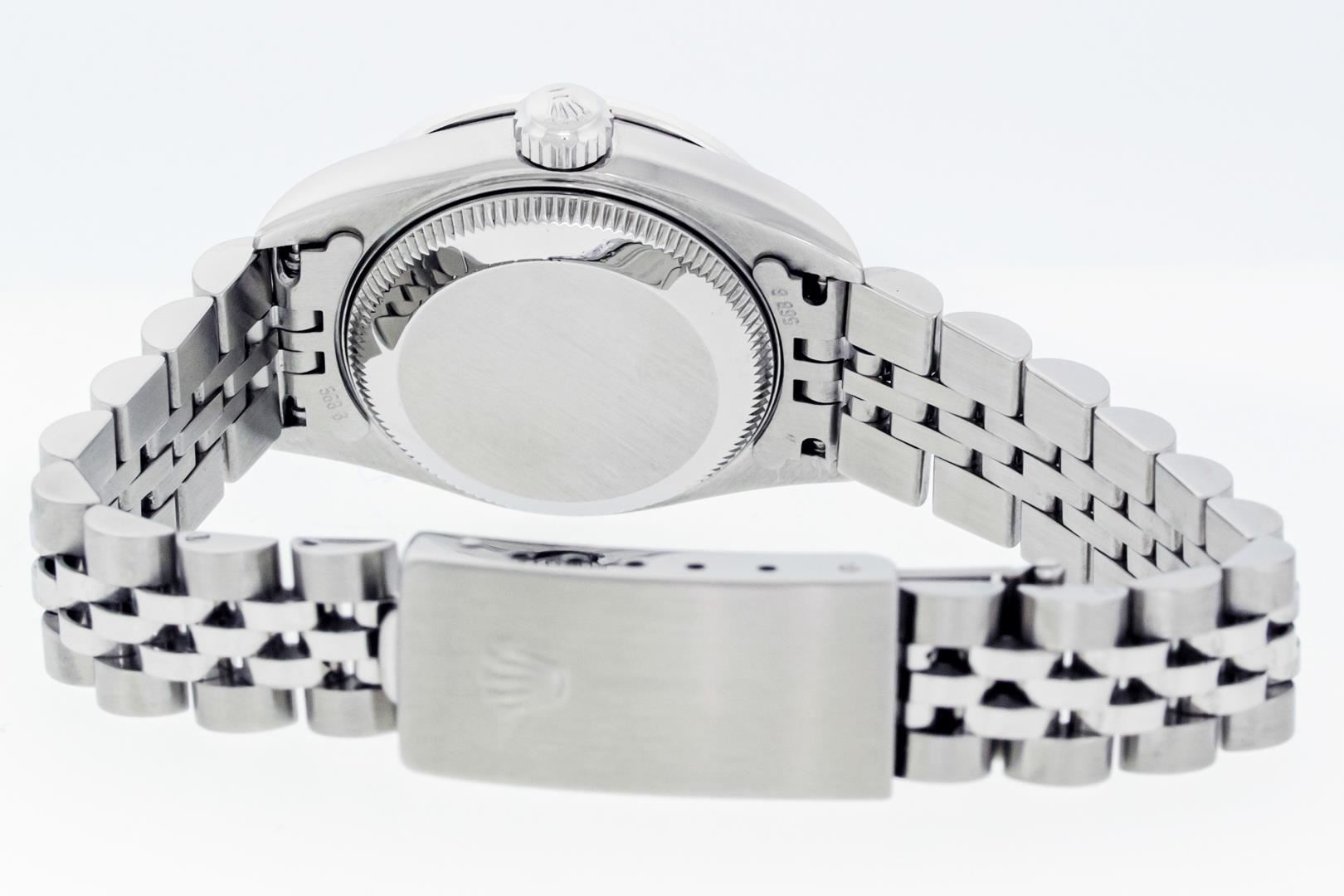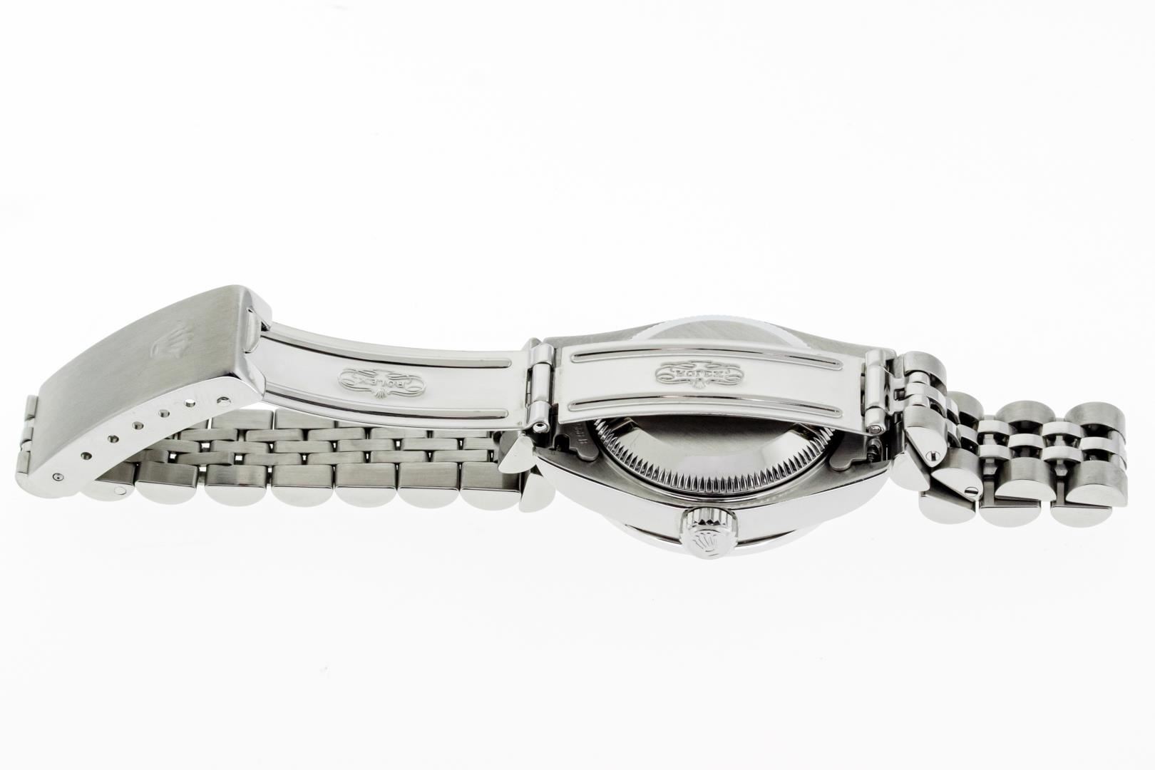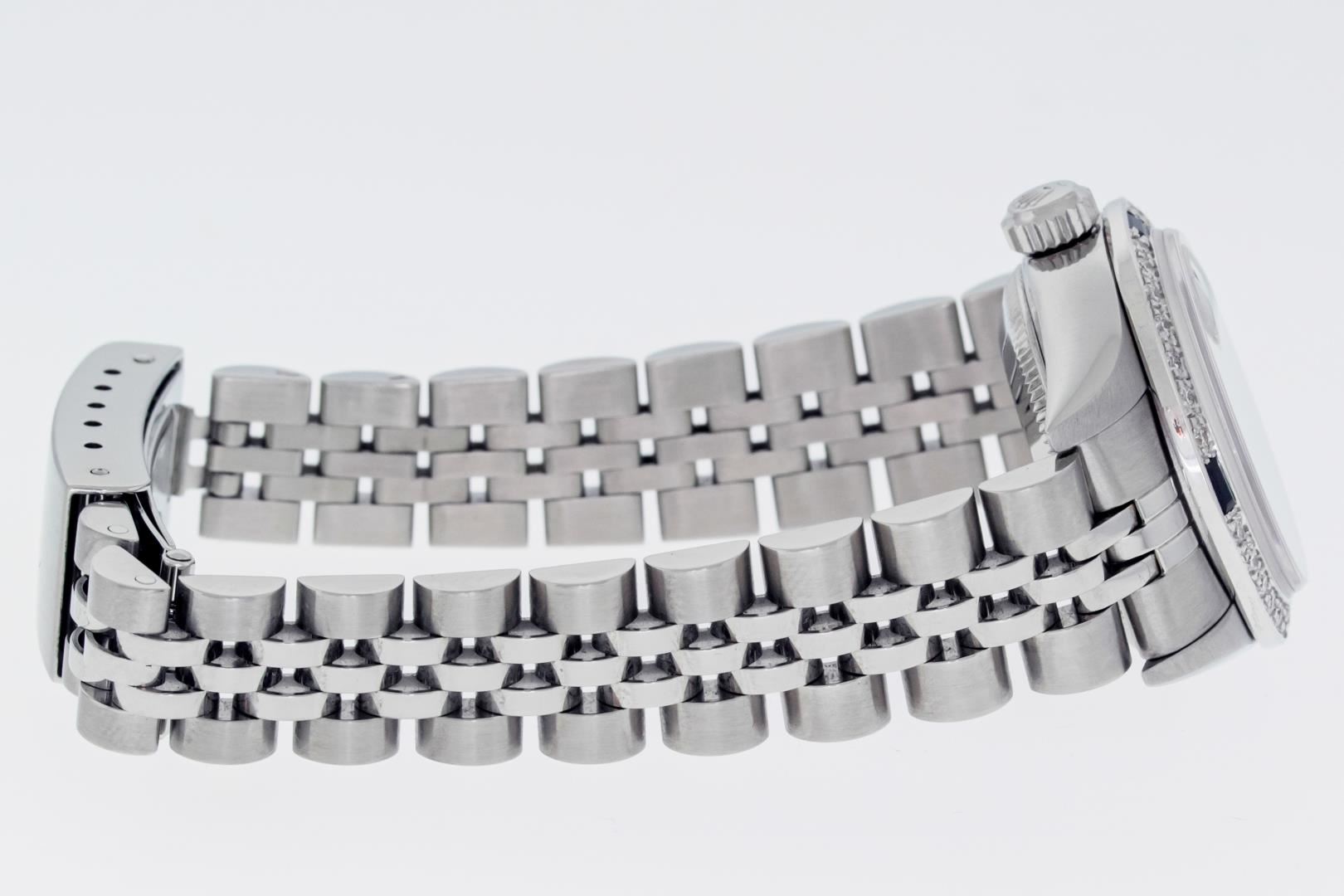 One Ladies Pre Owned Quickset Stainless Steel Rolex Datejust Polished Bright with Satin Finish, Serviced & Electronically Tested, Stainless Steel Case: 26mm, Rolex Stainless Steel Crown, Custom Bezel: New 18K White Gold Sapphire Bead Set Diamond Bezel, Diamond + Gem Count: 28 Diamonds + 4 Sapphires. Custom Crystal: New Sapphire With Magnified Date Window. Custom Hands: New Hands. Rolex Movement: Automatic Winding Movement 2235. Custom Dial: Blue Vignette With Added Diamond Hour Markers, Diamond Count: 10 Diamonds On Dial. Date Window: 3 O'Clock Position Date Display, Model: Quickset Datejust. Condition: G-6 Extra Fine. Rolex Bracelet: Stainless Steel Jubilee Band. Bright Polish & Satin Finish. 6.0 Inch Length, Adjustable. Standard Clasp, With Rolex Logo. This Watch Has Been Serviced Time Tested And Is In Excellent Condition It Is Free Of All Scratches And Dents.