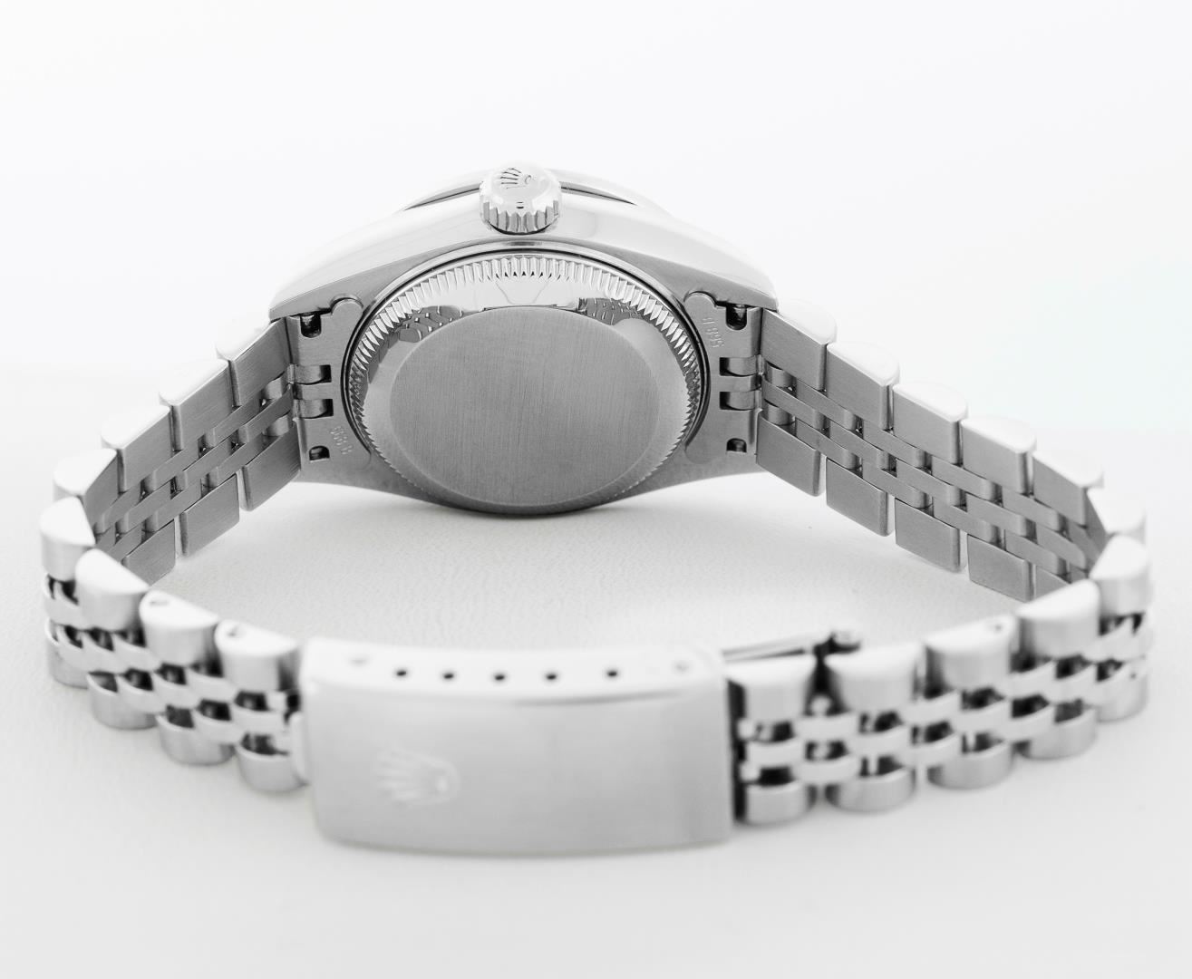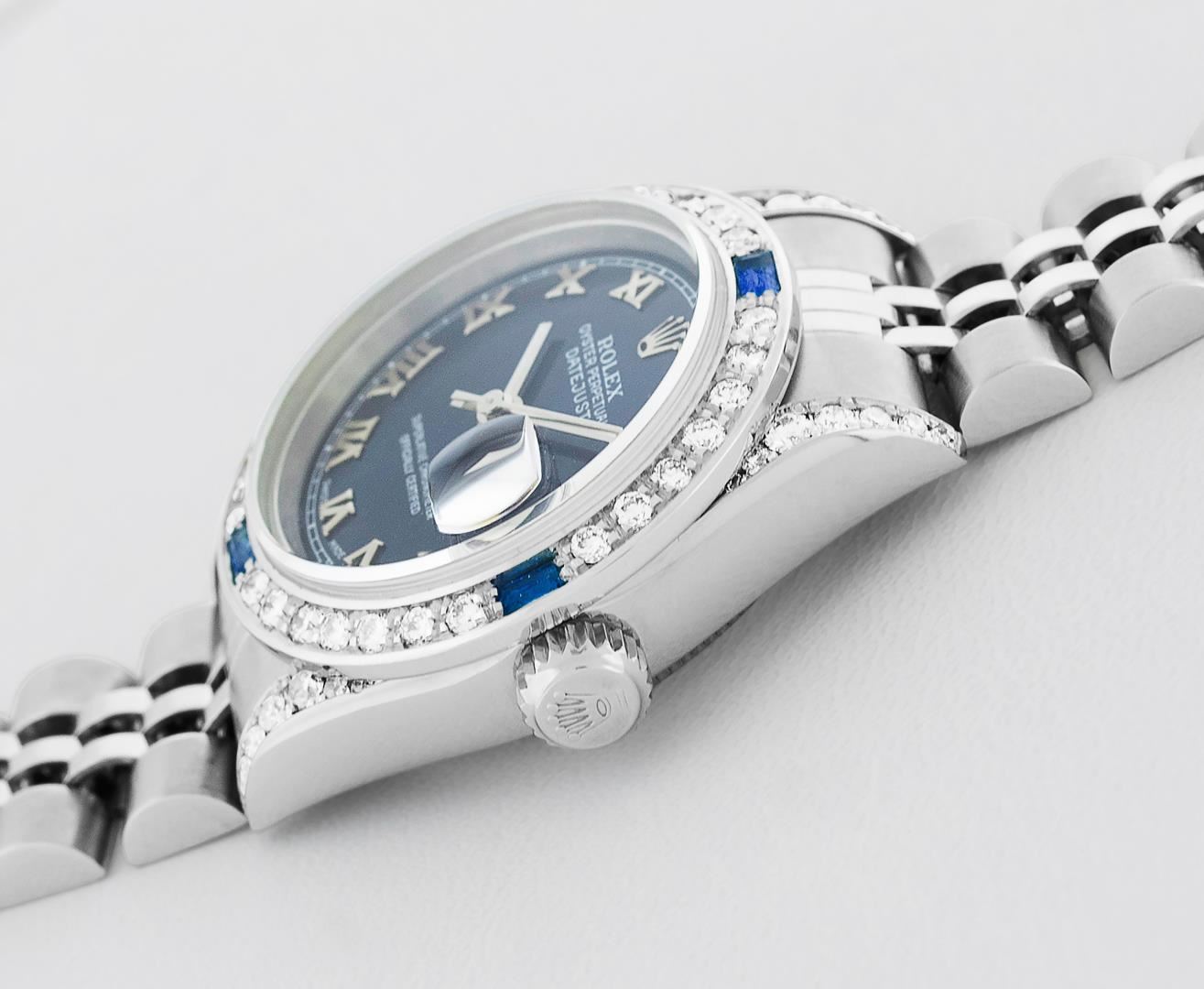 One Ladies Pre Owned Quickset Stainless Steel Rolex Datejust Polished Bright with Satin Finish, Serviced & Electronically Tested, Rolex Stainless Steel Case: 26mm, Custom Diamond Lugs: Added Diamonds On Lugs, Diamond Count: 24 Diamonds On Bezel, Color: G To H, Clarity: SI-VS. Rolex Stainless Steel Crown, Custom Bezel: New 18K White Gold Beadset And Sapphire Bezel, Stone Count: 28 Diamonds + 4 Sapphires, Diamond Color: G To H, Clarity: SI-VS. Custom Crystal: New Sapphire With Magnified Date Window. Custom Hands: New Hands. Rolex Movement: Quickset Automatic Winding Movement 2230. Rolex Dial: Blue Roman Dial With Square Track. Date Window: 3 O'Clock Position Date Display, Model: Sapphire Quickset Datejust. Condition: G-6 Extra Fine. Rolex Bracelet: Stainless Steel Jubilee Band. Bright Polish & Satin Finish. 6.0 Inch Length, Adjustable. Standard Clasp, With Rolex Logo. This Watch Has Been Serviced Time Tested And Is In Excellent Condition It Is Free Of All Scratches And Dents.