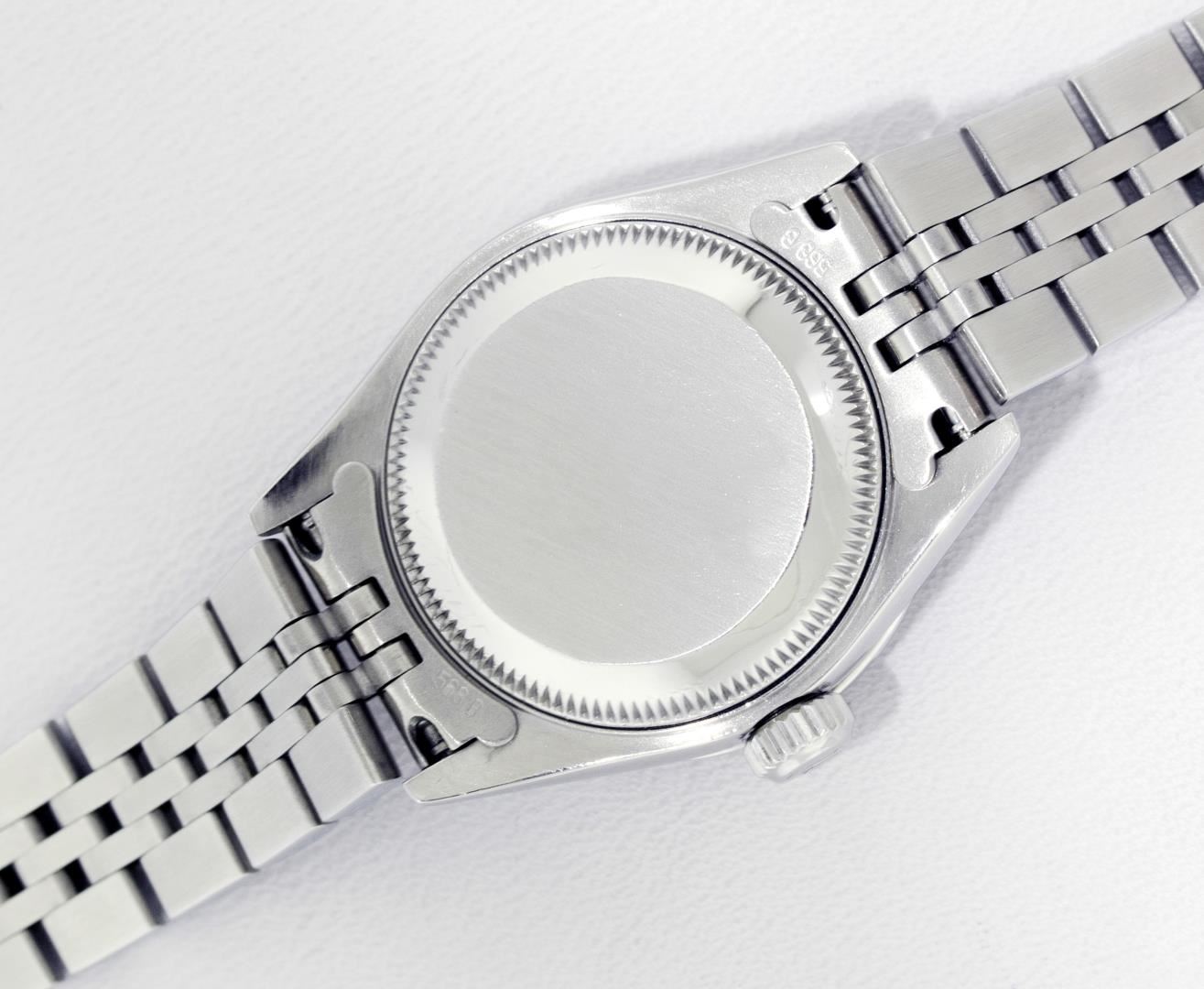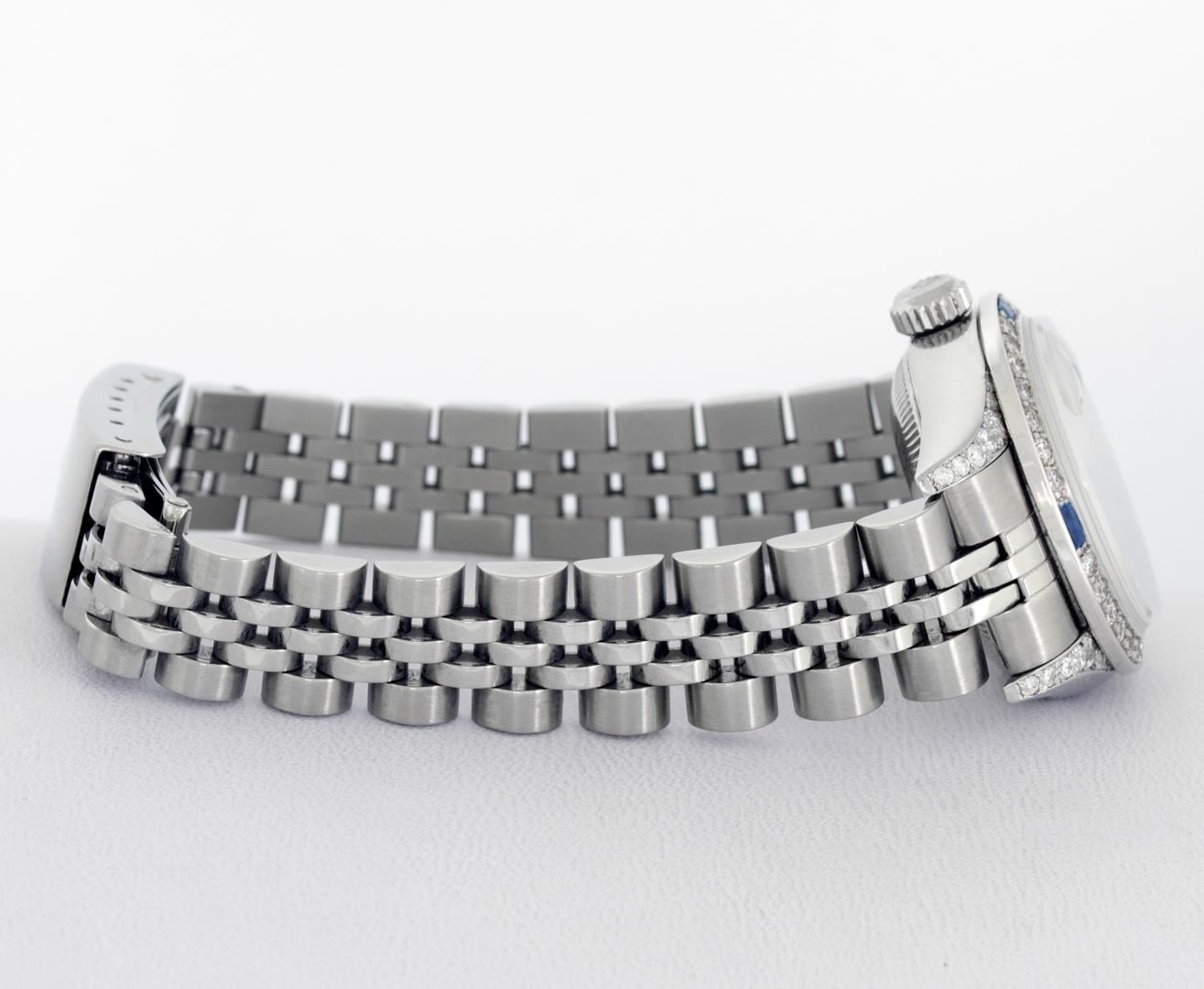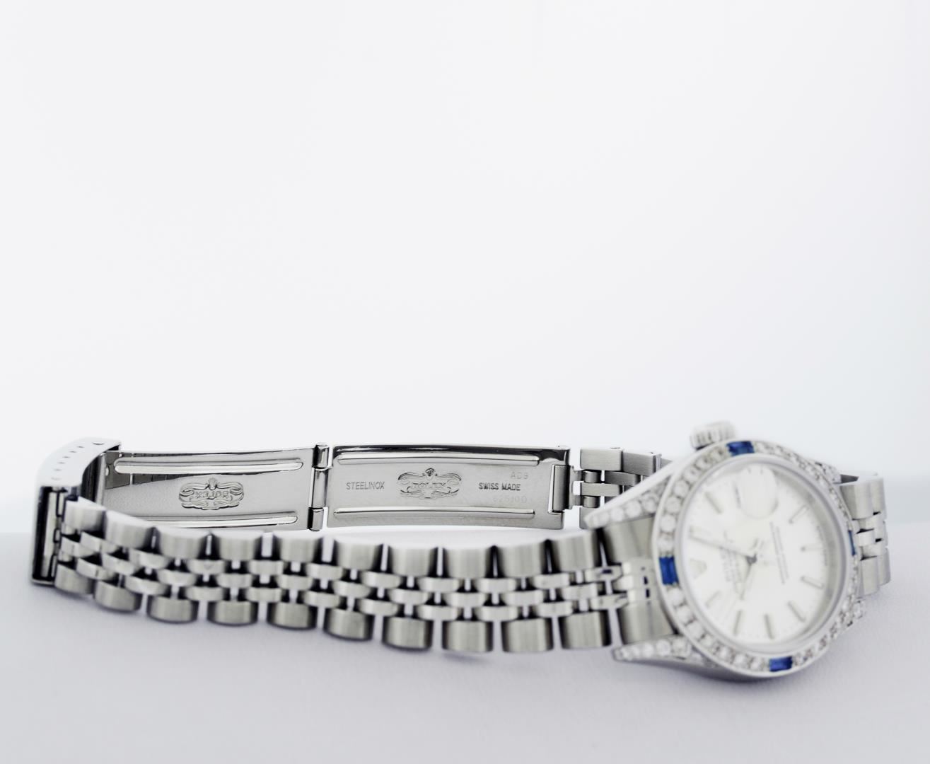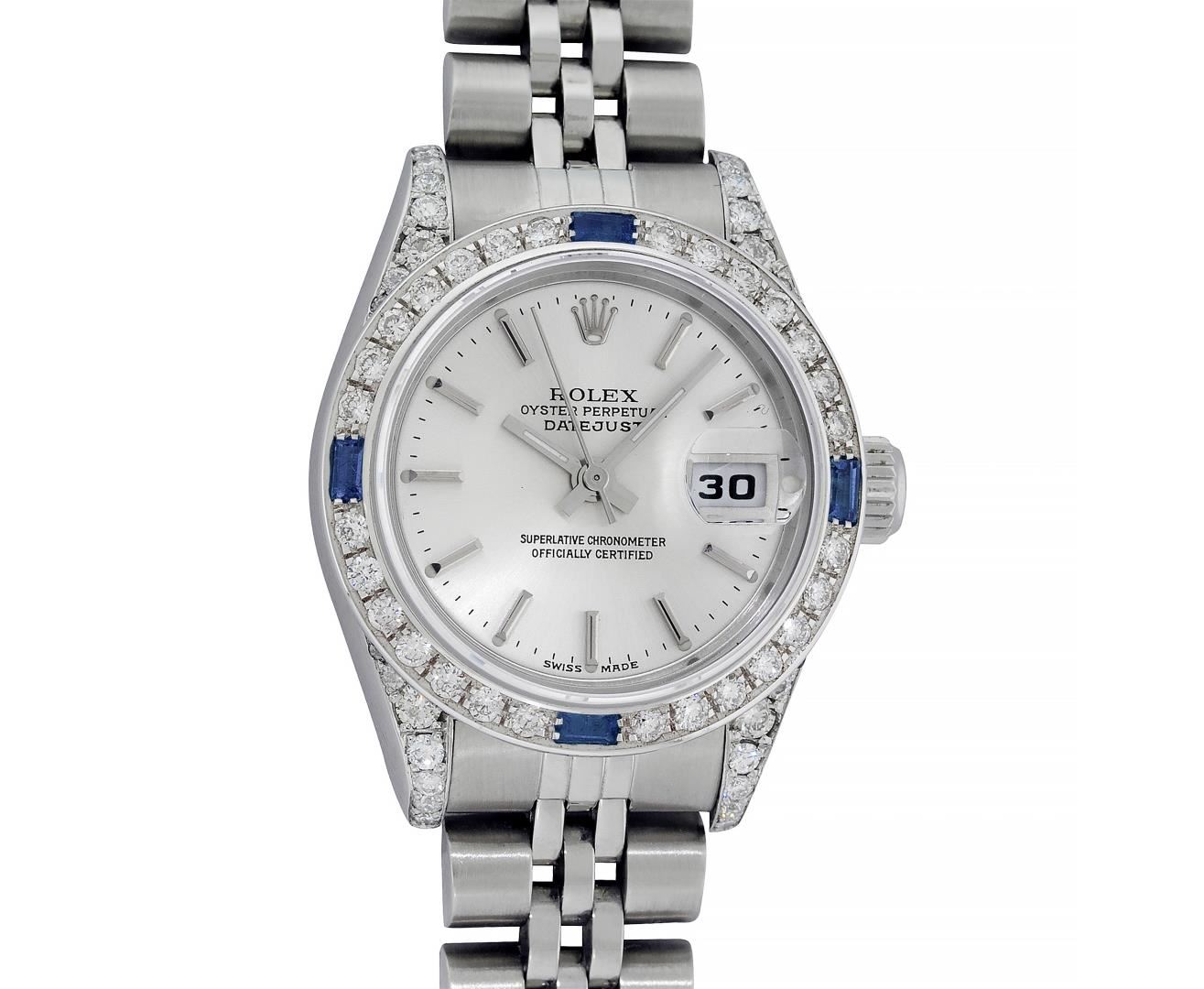 One Ladies Pre Owned Quickset Stainless Steel Rolex Datejust Polished Bright with Satin Finish, Serviced & Electronically Tested, Rolex Stainless Steel Case: 26mm, Custom Diamond Lugs: Added Diamonds On Lugs, Diamond Count: 24 Diamonds On Bezel, Color: G To H, Clarity: SI-VS. Rolex Stainless Steel Crown, Custom Bezel: New 18K White Gold Beadset And Sapphire Bezel, Stone Count: 28 Diamonds + 4 Sapphires, Diamond Color: G To H, Clarity: SI-VS. Custom Crystal: New Sapphire With Magnified Date Window. Custom Hands: New Lumi Hands. Rolex Movement: Quickset Automatic Winding Movement 2230. Rolex Dial: Silver Index With Dash Track And Lumi Dots. Date Window: 3 O'Clock Position Date Display, Model: Sapphire Quickset Datejust. Condition: G-6 Extra Fine. Rolex Bracelet: Stainless Steel Jubilee Band. Bright Polish & Satin Finish. 6.0 Inch Length, Adjustable. Standard Clasp, With Rolex Logo. This Watch Has Been Serviced Time Tested And Is In Excellent Condition It Is Free Of All Scratches And Dents.