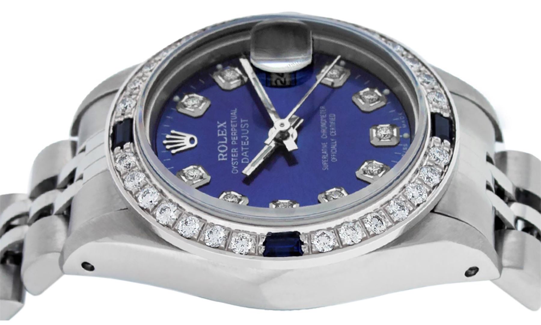 One Ladies Pre Owned Quickset Stainless Steel Rolex Datejust Polished Bright with Satin Finish, Serviced And Electronically Tested, Stainless Steel Case: 26mm, Stainless Steel Crown, Custom Bezel: New 18K White Gold Sapphire Beadset Diamond Bezel, Diamond + Gem Count: 28 Diamonds + 4 Sapphires. Custom Crystal: New Sapphire With Date Window. Custom Hands: New Luminescent Hands. Rolex Movement: Automatic Winding Movemen 2135t. Custom Dial: Custom Blue Dial With Added Diamond Hour Markers, 10 Diamond On Dial. Date Window: 3 O'Clock Position Date Display, Model: Quickset Datejust. Condition: G-6 Extra Fine. Rolex Bracelet: Stainless Steel Jubilee Band. Bright Polish And Satin Finish. 6.0 Inch Length, Adjustable. Standard Clasp, With Rolex Logo. This Watch Has Been Serviced Time Tested And Is In Excellent Condition It Is Free Of All Scratches And Dents.