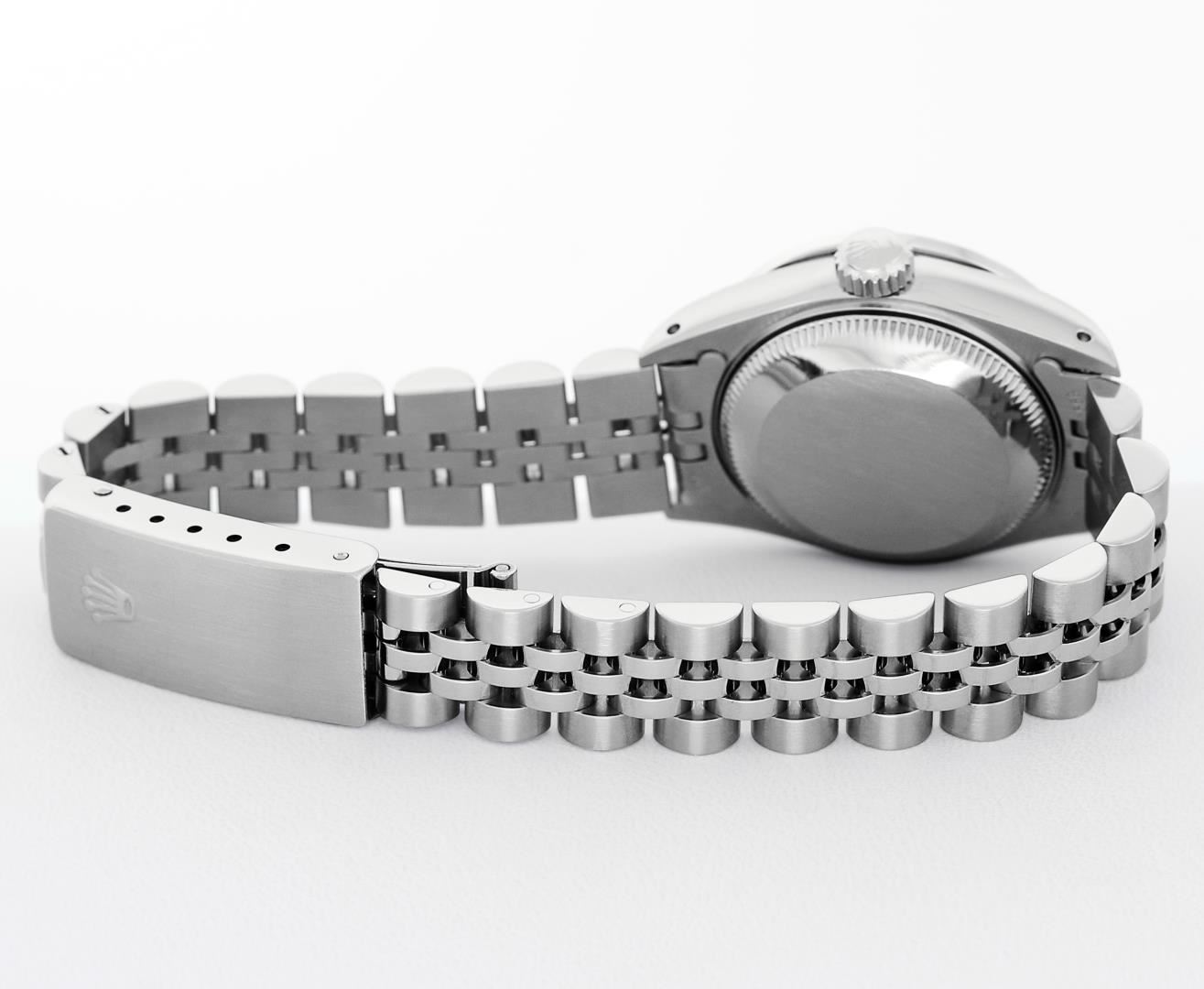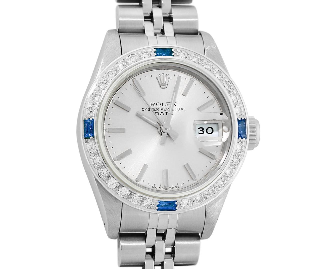 One Ladies Pre Owned Quickset Stainless Steel Rolex Datejust Polished Bright with Satin Finish, Serviced & Electronically Tested, Rolex Stainless Steel Case: 26mm, Rolex Stainless Steel Crown, Custom Bezel: New 18K White Gold Beadset And Sapphire Bezel, Stone Count: 28 Diamonds + 4 Sapphires, Diamond Color: G To H, Clarity: SI-VS. Custom Crystal: New Sapphire With Magnified Date Window. Custom Hands: New Luminescent Hands. Rolex Movement: Quickset Automatic Winding Movement 2130. Rolex Dial: Silver Index Dial With Luminescent Dots & Dash Track. Date Window: 3 O'Clock Position Date Display, Model: Sapphire Quickset Datejust. Condition: G-6 Extra Fine. Rolex Bracelet: Stainless Steel Jubilee Band. Bright Polish & Satin Finish. 6.0 Inch Length, Adjustable. Standard Clasp, With Rolex Logo. This Watch Has Been Serviced Time Tested And Is In Excellent Condition It Is Free Of All Scratches And Dents.