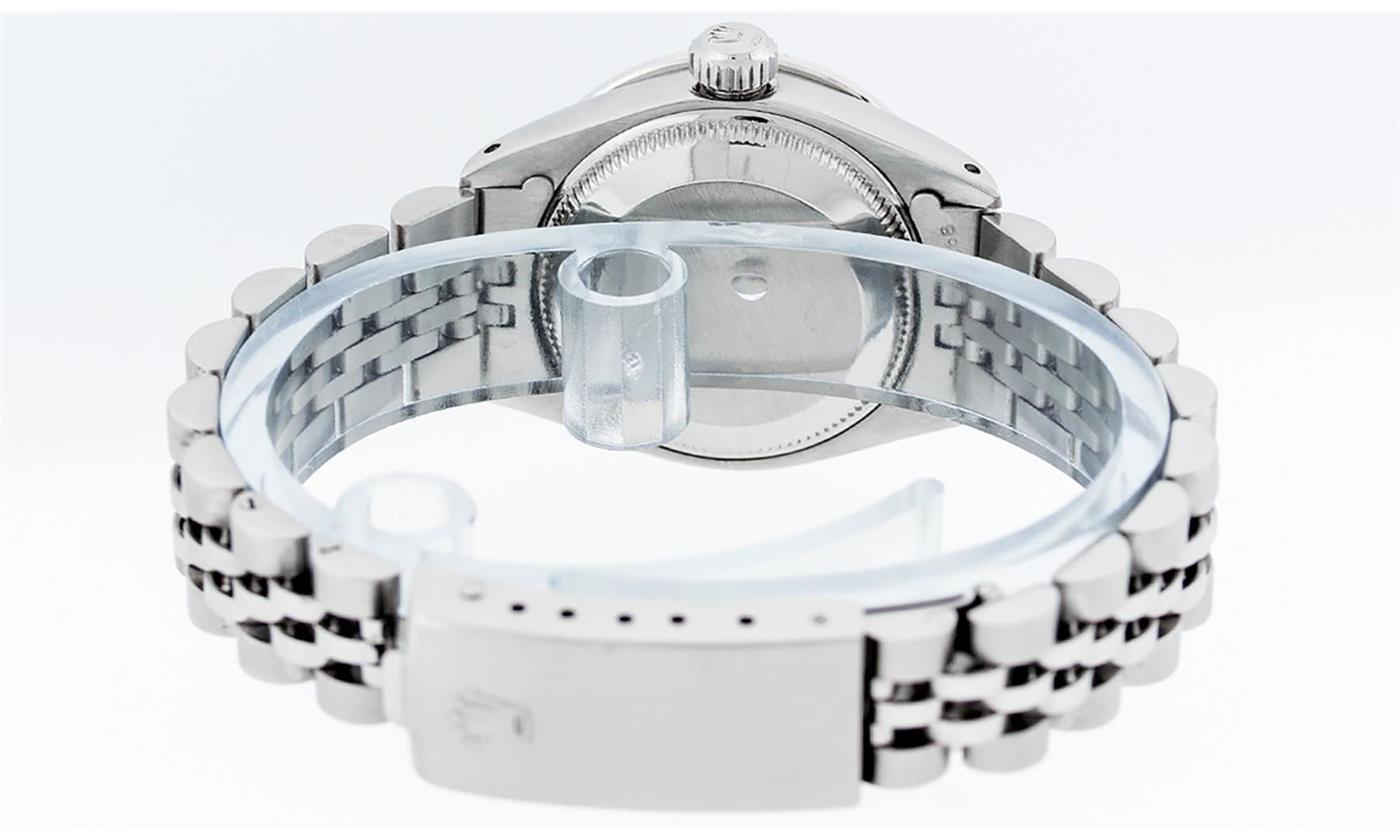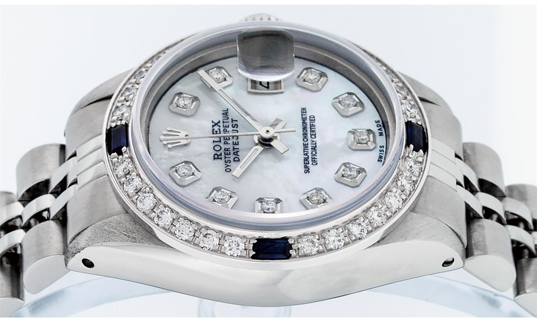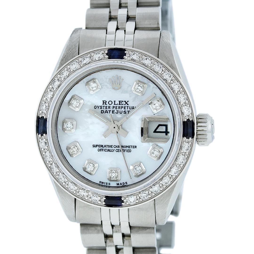 One Ladies Pre Owned Quickset Stainless Steel Rolex Datejust Polished Bright with Satin Finish, Serviced And Electronically Tested, Stainless Steel Case: 26mm, Stainless Steel Crown, Custom Bezel: New 18K White Gold Sapphire Beadset Diamond Bezel, Diamond + Gem Count: 28 Diamonds + 4 Sapphires. Custom Crystal: New Sapphire With Date Window. Custom Hands: New Luminescent Hands. Rolex Movement: Automatic Winding Movement 2135. Custom Dial: White Dial With Added Diamond Hour Markers, 10 Diamond On Dial. Date Window: 3 O'Clock Position Date Display, Model: Quickset Datejust. Condition: G-6 Extra Fine. Rolex Bracelet: Stainless Steel Jubilee Band. Bright Polish And Satin Finish. 6.0 Inch Length, Adjustable. Standard Clasp, With Rolex Logo. This Watch Has Been Serviced Time Tested And Is In Excellent Condition It Is Free Of All Scratches And Dents.